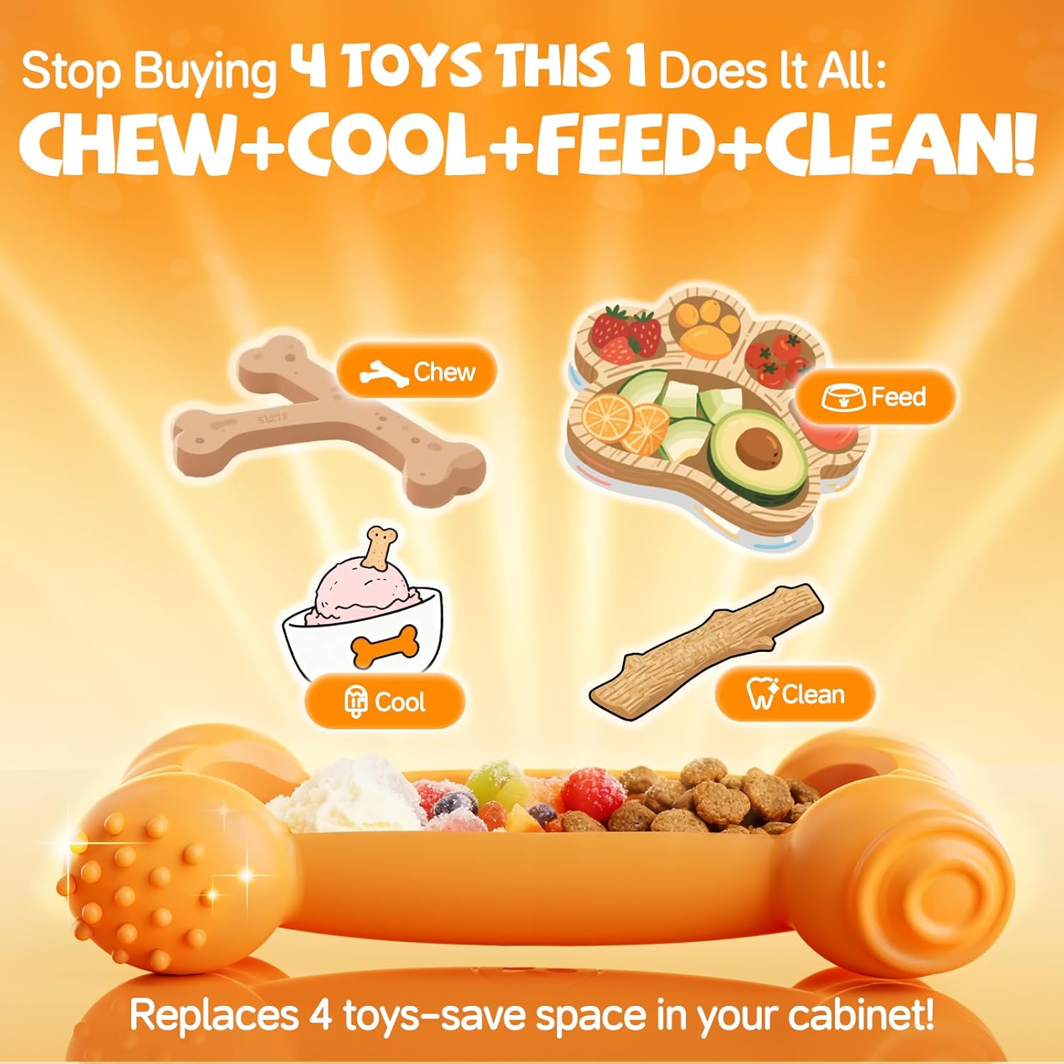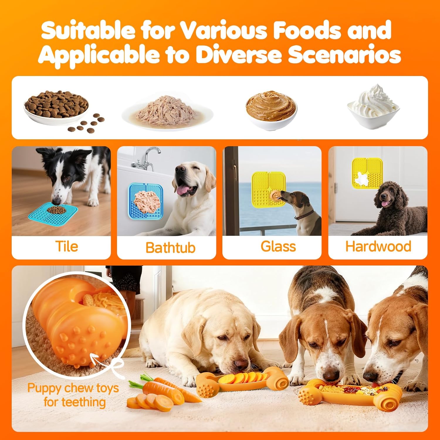 About this item 【Enrichment & Interactive 6-Piece Set】The DEPURE dog enrichment toys-busting kit includes 2 lick mats, 1 chew bone, 1 ice tray, 1 lick ball, and a spatula - delivering 40% longer engagement than single toy. Perfect for crate training, vet visits, or thunderstorms with strong suction cups that stick to tiles/crates. The vet-approved textured surfaces satisfy natural licking instincts, making it ideal for multi-scenario use from mealtime to anxiety relief. 【Slow Feeding & Dental Health Boost】The DEPURE deep-grooved lick mat and lick bone extend mealtime by 30+ minutes to reduce bloat risk for furry friends, while the silicone ridges gently scrape plaque during licking to supplement brushing. - especially beneficial for pugs and french bulldogs. This comprehensive system promotes healthier eating habits and improved dental hygiene through controlled, rewarding licking sessions. 【Indestructible Dog Toy for Aggressive Chewers & Puppy Chew Toys for Teething】Crafted from heavy-duty nylon, these indestructible dog toy options are tougher than rubber alternatives—safe for power chewers and ideal as puppy chew toys for teething to soothe sore gums(dog chew toy-bone). Safe material ensures safety while they chew, lick, and play, all while doubling as a durable dog food bowl for mess-free feeding. 【Frozen Treats & Mental Stimulation】Enjoy freezer-safe functionality by filling mats and balls with peanut butter or bone broth for 2-hour summer cooling relief. The puzzle challenge design hides kibble in the ball's hollow center to trigger problem-solving skills, while licking releases endorphins that reduce destructive behavior by 67% during alone time. Perfect for keeping dogs mentally engaged and physically cooled during warm weather or stressful situations. 【Food-Safe Silicone & Easy to Clean】Made with non-toxic silicone that's safer than plastic chew toys, the DEPURE dog enrichment toys set feature a non-porous surface that resists odors. They're dishwasher-safe or can be hand-washed in just 10 seconds, with the included spatula helping spread pastes evenly without waste. The stuary, hygienic material withstands regular use while maintaining its food-safe properties for worry-free playtime. 【Gift-Ready with Lifetime Support】Presented in eco-friendly packaging with a training guide, the DEPURE interactive dog toys set makes the perfect gift for new pet parents. Backed by a 90-day warranty with free replacements if worn out, we paws-itively guarantee fun. Pro tip: Try freezing Greek yogurt with blueberries in the ice tray for a refreshing puppy smoothie! This complete enrichment system delivers lasting value through innovative design and exceptional customer support. › See more product details