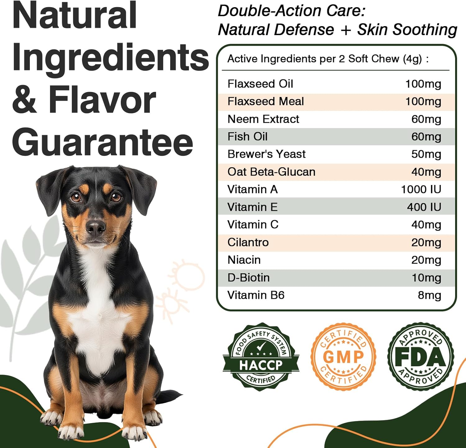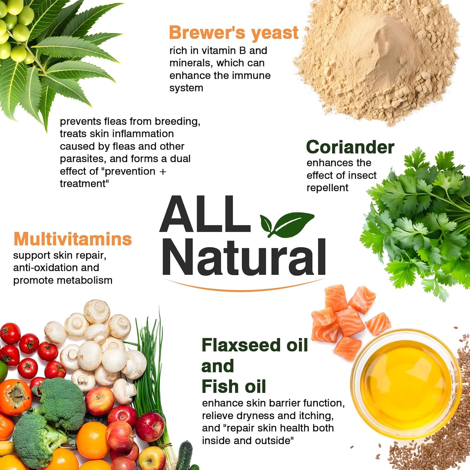 About this item Natural flea and tick prevention for dogs effectively reduces flea and tick infestation,relieves itching and skin irritation. And Dog flea and tick treatment chewable supports healthy skin repair & barrier function,Flea chewables for dogs significantly reduces the allergy symptoms caused by fleas & ticks in dogs. In addition,Flea and tick chewables for dogs can strengthen the dog's immune system,provide long-lasting protection Dog allergy chews relieves discomfort on sensitive skin & reduces scratching. Allergy medicine for dogs is rich in Omega 3 for dogs, gently promotes skin repair, promotes cell renewal, and strengthens the skin barrier. Allergy chews for dogs, care for the health of dog skin and hair. In addition,skin and coat supplement for dogs has anti-inflammatory effects, which can reduce dryness and erythema, dog skin and coat supplement dual-action skin repair & soothing care Chewable flea and tick for dogs does free of garlic or any harsh chemicals. Natural anti itch allergy for dogs is rich in Fish Oil & Flaxseed Oil (high-quality dog omega 3 supplement),multivitamins, and brewer's yeast. Flea chews for dogs are anti-inflammatory & antioxidant,providing allergy relief for dogs itching. Flea and tick chews for dogs are mild and hypoallergenic,and Allergy and immune chews for dogs do free of corn, gluten, and soy derivatives Veterinarian recommended chewable flea and tick prevention for dogs, scientific formula, non-GMO, green organic, safe and reliable allergy dog chews. Delicious chicken flavor, flea and tick chews are not bitter, easily solve the problem of picky eating, allergy chews for dogs itching and licking, can be fed directly, flea chews can also be crushed and mixed with food. Dog flea and tick chewable is a pet-friendly alternative to flea drops, sprays and shampoos Suitable for all dog breeds/ages (Chihuahua to Great Dane, puppies to senior dogs), 200 pieces of cost-effective blueberry-sized omega 3 dogs soft chews per jar, 3in1, dog allergy itching relief scientifically repel fleas and ticks, dog human multivitamin itch relief, omega for dogs improves fur health & enhances immunity. Flea and tick for dogs chewable tablets are recyclable packaging, taking into account convenience & environmental protection › See more product details
