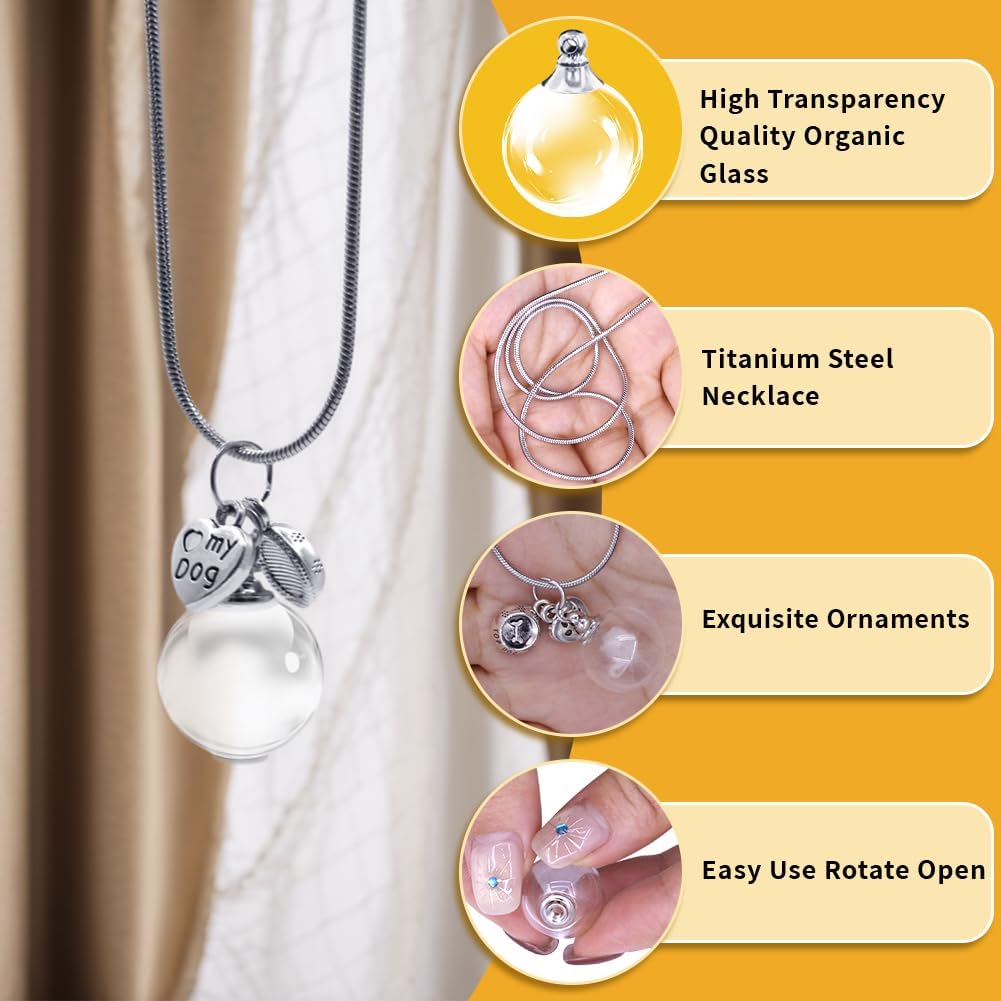 This dog fur memorial keepsake necklace comes with a complete set of accessories to meet both DIY and gifting needs, including 1 storage glass ball, 1 stainless steel chain, 1 heart pendant engraved with "Love Dog", 2 large open jump rings, 2 small open jump rings, 2 small rubber bands and 1 black gift box. The glass ball has a diameter of 0.59 inch or 1.5 cm, designed for storing pet fur. The stainless steel chain measures 21.65 inches or 55 cm in length, which fits most people and allows for easy adjustment. Crafted from polished stainless steel, the necklace features a smooth surface that is scratch-free, resistant to breaking and tarnishing. The storage ball combines stainless steel with high-transparency glass, ensuring corrosion resistance and durability against minor impacts. Boasting a sleek and modern design, the necklace enhances the charm of various outfits, making it suitable for both casual and semi-formal occasions. The "Love Dog"-lettered heart pendant and dog bowl pendant effectively convey deep affection for pets. Packaged in an elegant black gift box, this necklace serves as a thoughtful DIY gift for dog lovers, helping them keep precious pet memories close. It is an ideal choice for gifting on birthdays, anniversaries and other meaningful occasions.
