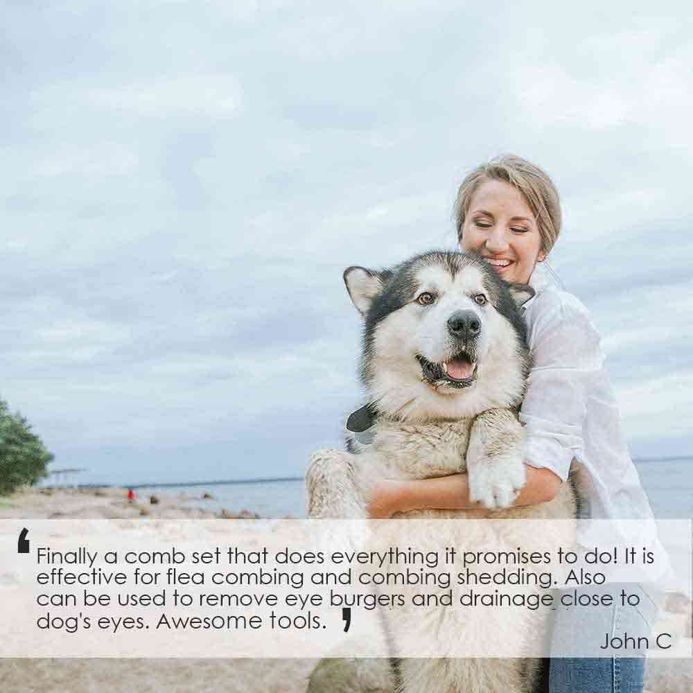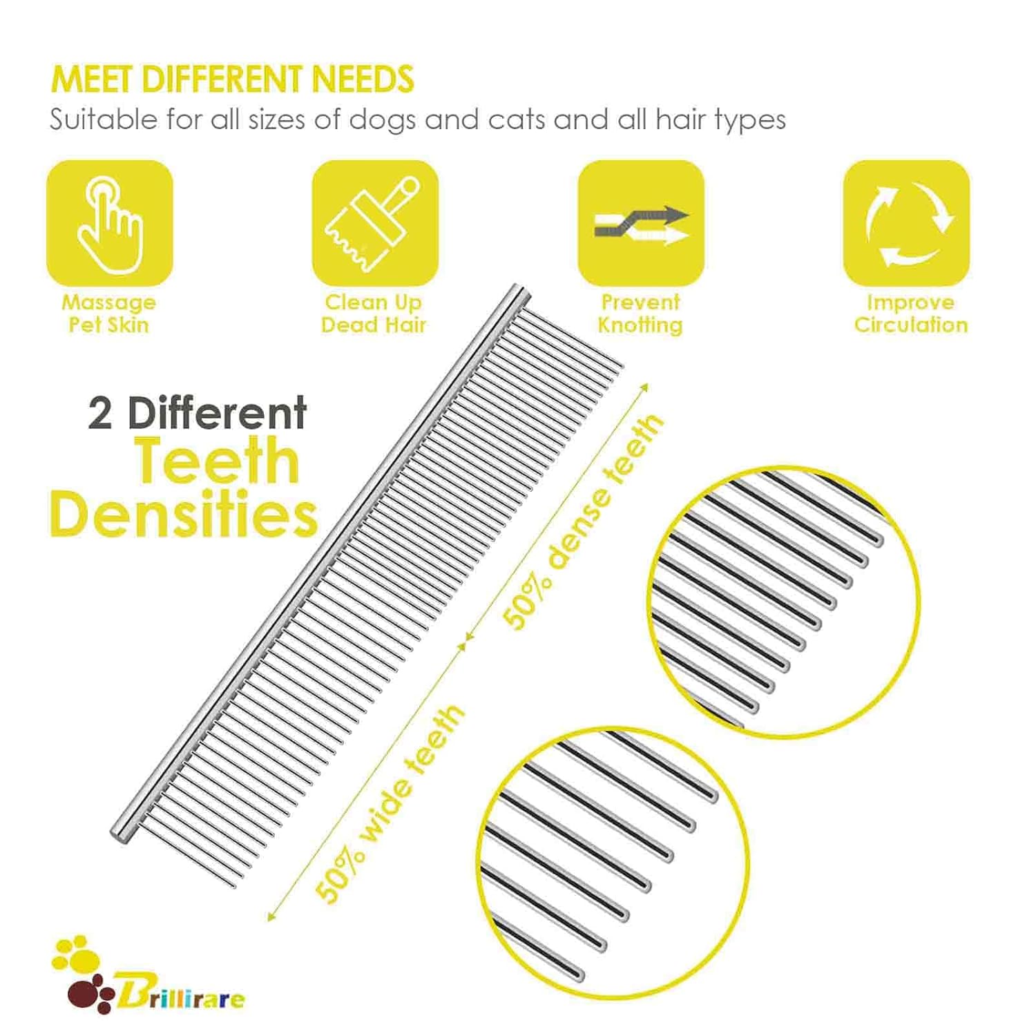 About this item 【PREMIUM MATERIAL】This metal comb is made of high-quality stainless steel coated with zinc carefully, durable and corrosion-resistant, won’t rust after washing, withstands wear and tear in long term use. Perfect for straightening out the knotted tangles hair, as well as finishing and fluffing without causing any harm. 【COMFORTABLE & SAFE】Each comb tooth is finely polished, can be used to retouch and massage by penetrating DEEP into the coat without scratching your pets’ skin. It is seamless & smooth so that it won't snag hair, glide through the coat like butter, could effectively remove loose hair, dander & dirt trapped beneath fur and curly hair. 【UNIQUE 2-IN-1 DESIGN】Every dog comb has 2 different teeth densities, the wide teeth can be used to comb knotted fur or open the tangled hair, the dense teeth is suitable for comb the soft fur nearby eyes, ears and fine hair of the legs. Also good for avoiding static electricity when being used. 【MULTIFUNCTIONAL & SAFE】Our anti-scratch round teeth would also support the pet health by boosting blood circulation and massaging skins. The comb's coarse and fine teeth work together to remove thick or dead fur and leave your pet's coat soft, sleek, and shining no matter long haired or short haired dogs or cats with thin and thick coats or sensitive skin. 【BUY with CONFIDENCE】The cat comb is compact and portable, fitting conveniently in a handbag, preventing snagging and pet injury. We offer you No questions asked 90-DAY REFUND and 24*7 hours 100% SATISFACTION GUARANTEE. We take care of all quality-related issues with a replacement or refund. If you have any problems with the product, please contact us. › See more product details