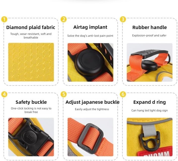 About this item IIntegrated Design -- Unlike other separated holder fit for AirTag, this escape proof dog harness fits the Apple Air Tag perfectly, protect AirTag device and prevent AirTags from falling off or dangling. (Note: AirTag is not included.) No Pull, No Choke -- Our no-pulling dog harness with 2 metal leash rings for safer dog walks. The chest attachment clip to stop your dog from pulling on walks, perfect for dog training or dogs who tend to pull. The back one is great for casual walks, jogging, hiking, etc. Strong and comfortable -- This dog harness handle is made of durable nylon oxford and padded with soft cushion to protect dog's skin. Breathable air mesh keeps your dog cool during outdoor activities. High bright reflective strips ensure a safe walk at night. SAFE & USEFUL:--This dog harness featured with reflective strap is ideal for night time walks, making our dogs stand out and keep them seen and safe. The sturdy padded handle on top makes it easy to grab dog quickly in emergency. It is fabulous for helping dogs up stairs and looping a seat belt through it for car rides. Beautiful and lightweight--There are four colors dog Harness to choose from, you can match them at will to avoid color collision and make your dog a unique baby › See more product details