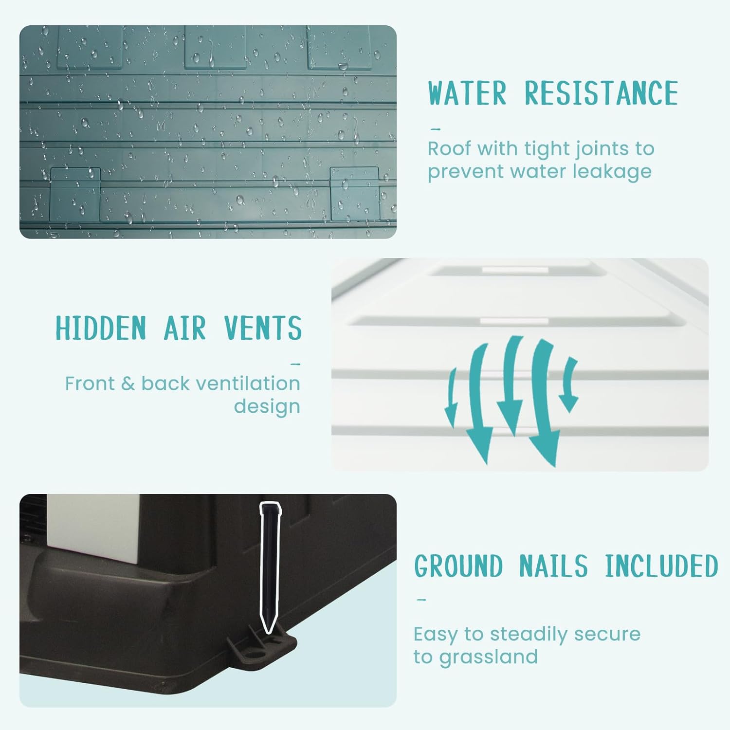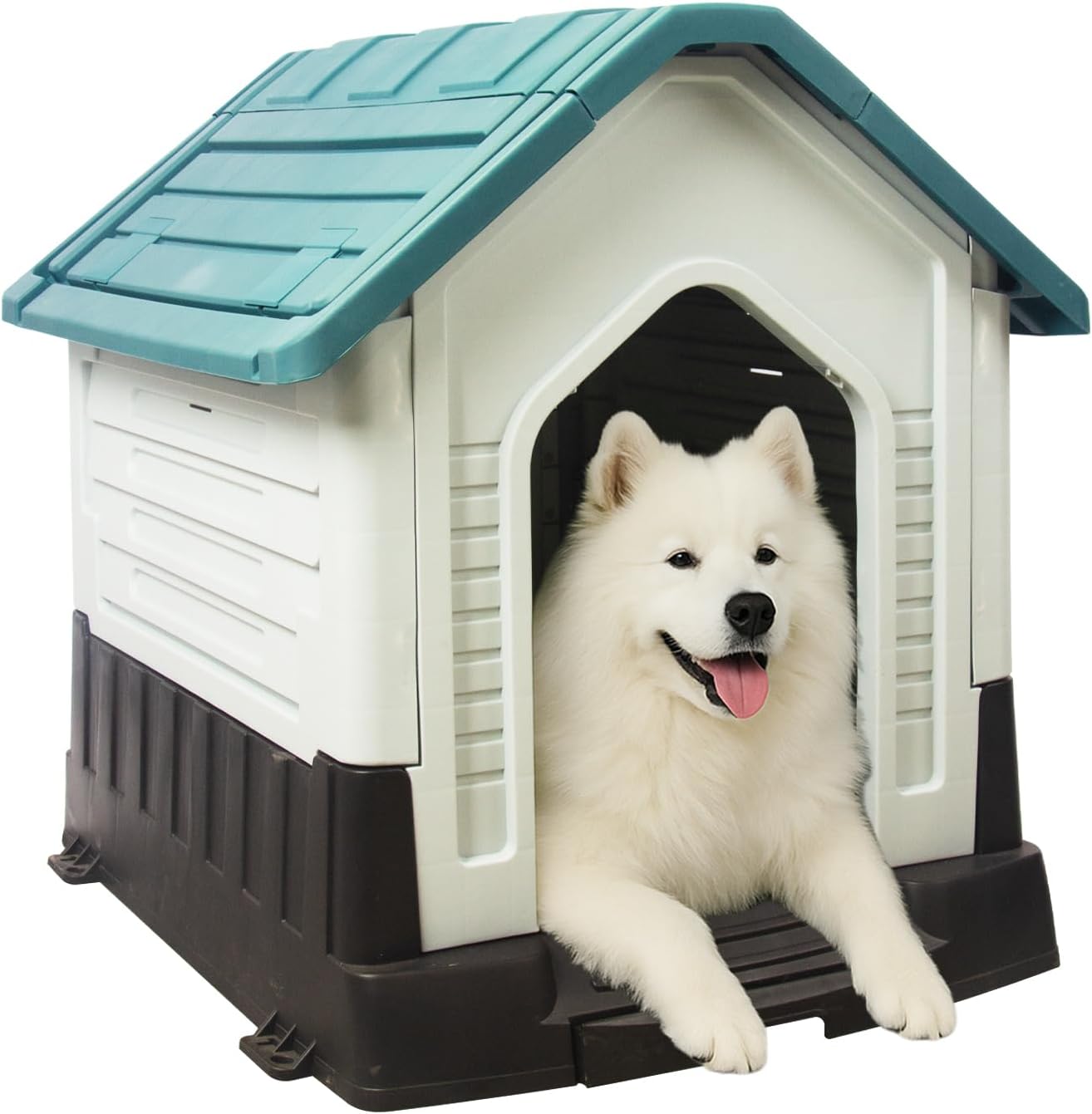 Material:High Quality PP Product Features Our dog house is made of protection of the environment PP material, anti-corrosive & anti-rust and weather resistance. Perfect for use in the backyard garden, providing a perfect home for your pet. Our plastic dog house is large enough for small medium large size dogs,which provides a comfortable and superior activity space for your pets like where they can have a good rest in it. Raised floors and waterproof materials keep the dog house from leaking and protect your pet from rain. double vents help keep dogs cool in summer and warm in winter. With a waterproof detachable roof, it is very convenient for you to clean the dog house. Our large dog house is easy to assemble, instructions are included in the box. According to instructions, an adult can complete the assembly in about half an hour. Raised floors and waterproof materials keep the dog house from leaking and protect your pet from rain. double vents help keep dogs cool in summer and warm in winter. The color is easy to match with your home decorations and furniture styles, all while making your pets feel relaxed.