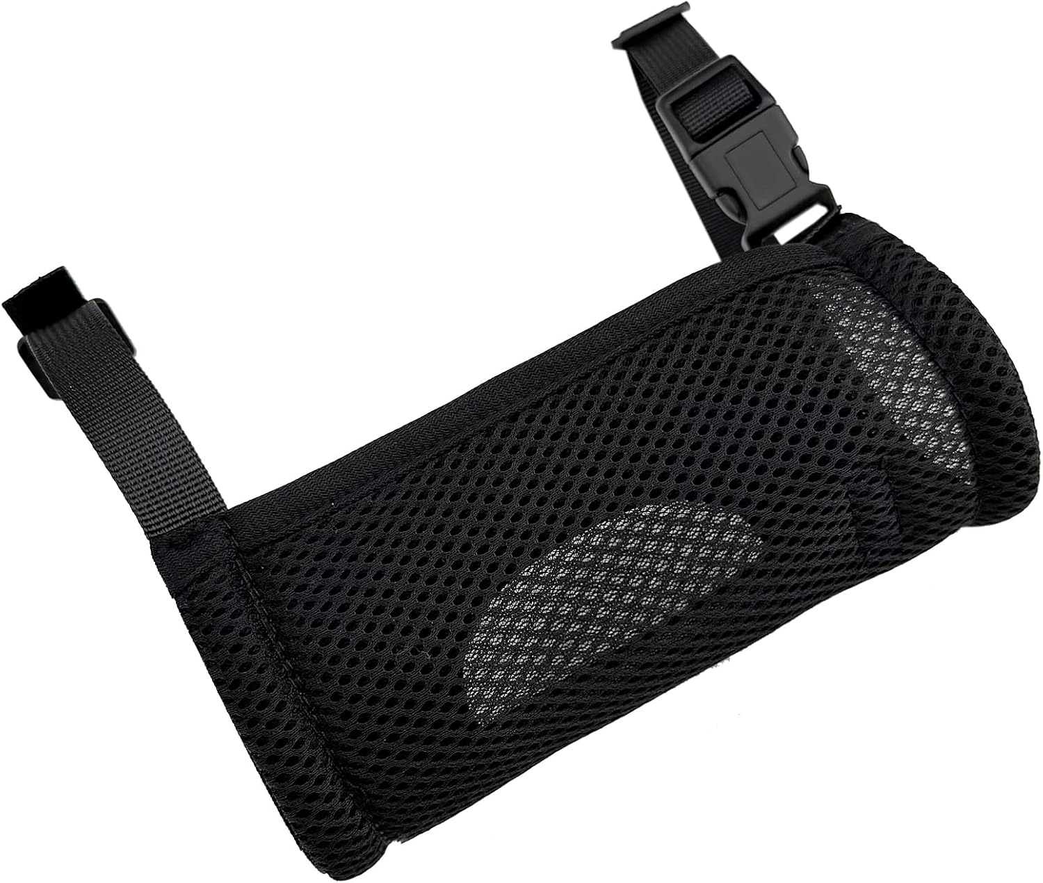 The polite belt body is made of black breathable mesh fabric, and the edges are reinforced with black fabric edging. Equipped with adjustable black webbing and square plastic buckles on both sides, achieving flexible waist fixation.. The overall minimalist design without decoration accurately showcases the mesh texture, buckle structure, and edging process through close ups, specifically designed to visually convey the basic functions and wearing style of the product