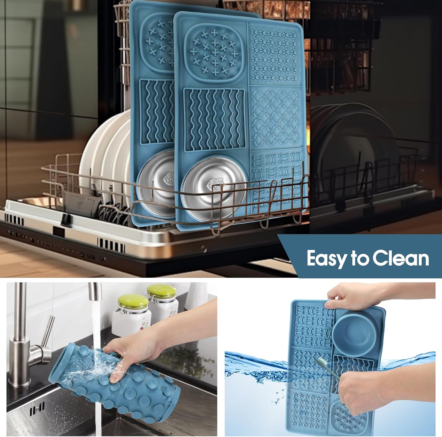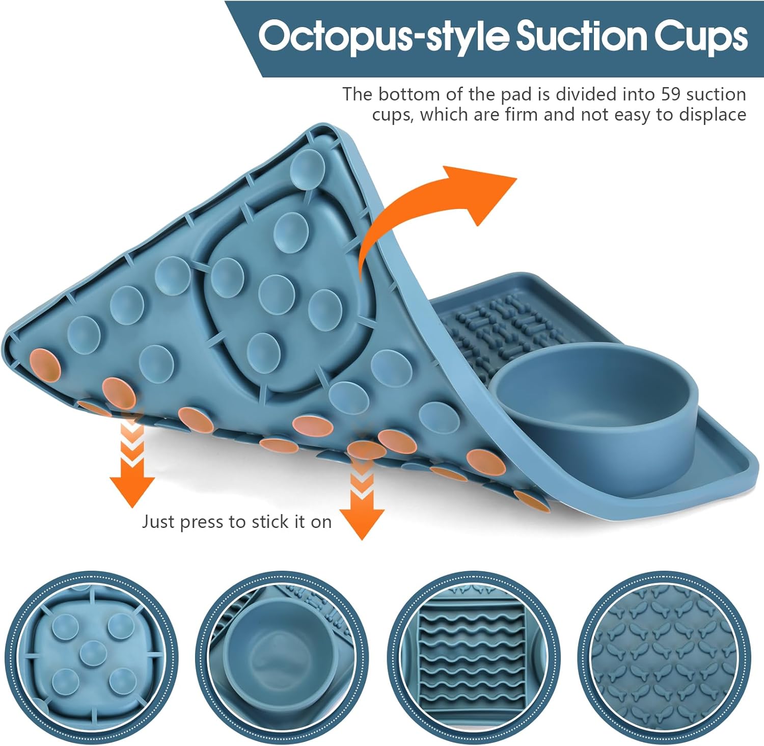 - 13.8*9.05 Inches dog licking mat. For small dogs or cats.- Made of food-grade silicone.- Equiped with a 304 stainless steel dog bowl.- Suction cup design, suitable for glossy surface, like glass or ceramic tile.- Dishwasher safe.- Main purpose - Improve pet's eating habit and relieve anxiety of your dog, reduce boredm.