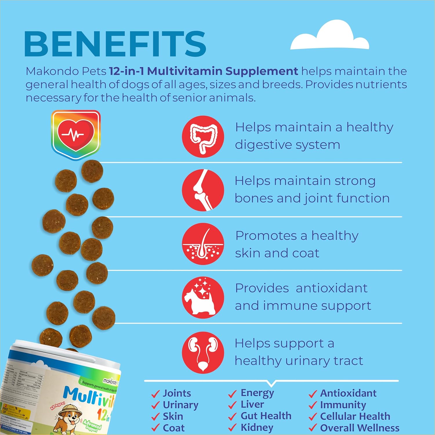 About this item MULTIVITAMIN FOR DOGS: Our well thought formula help boost immune system, while improving energy. Antioxidant dog vitamins and supplements for overall wellness & cellular health with B12 Vitamins DOG GUT HEALTH & LIVER: Our dog supplement has gut enzymes, probiotic, and dog multivitamins that support your dog’s digestion balance, bloating, gas & liver health. Good dog vitamins multivitamin SKIN & COAT: Dog multivitamins chewable with Salmon Fish Oil, Biotin, Vitamin E, Omega 6 - our human grade skin and coat supplement for dogs act as dog vitamins for itchy skin nourishing hair & paws HIP & JOINT: Supercharged with dog glucosamine, MSM, Zinc & Omegas act as a joint supplement for dogs for small to large breeds all ages. Senior Dog Treats that help fix collagen & calcium to bones KIDNEY & URINARY vitamins for dogs: Support the renal and incontinence health of male & female canine with our cranberry supplement for dogs. Dog UTI treatment to aid pups or adults with urine stones MAKONDO PETS a brand you can trust – Vet Dr formulated Chicken-Flavor Chews made in FDA-registered facilities in the USA. Pet Vitamins and Supplements made from US and Globally Sourced ingredients. › See more product details