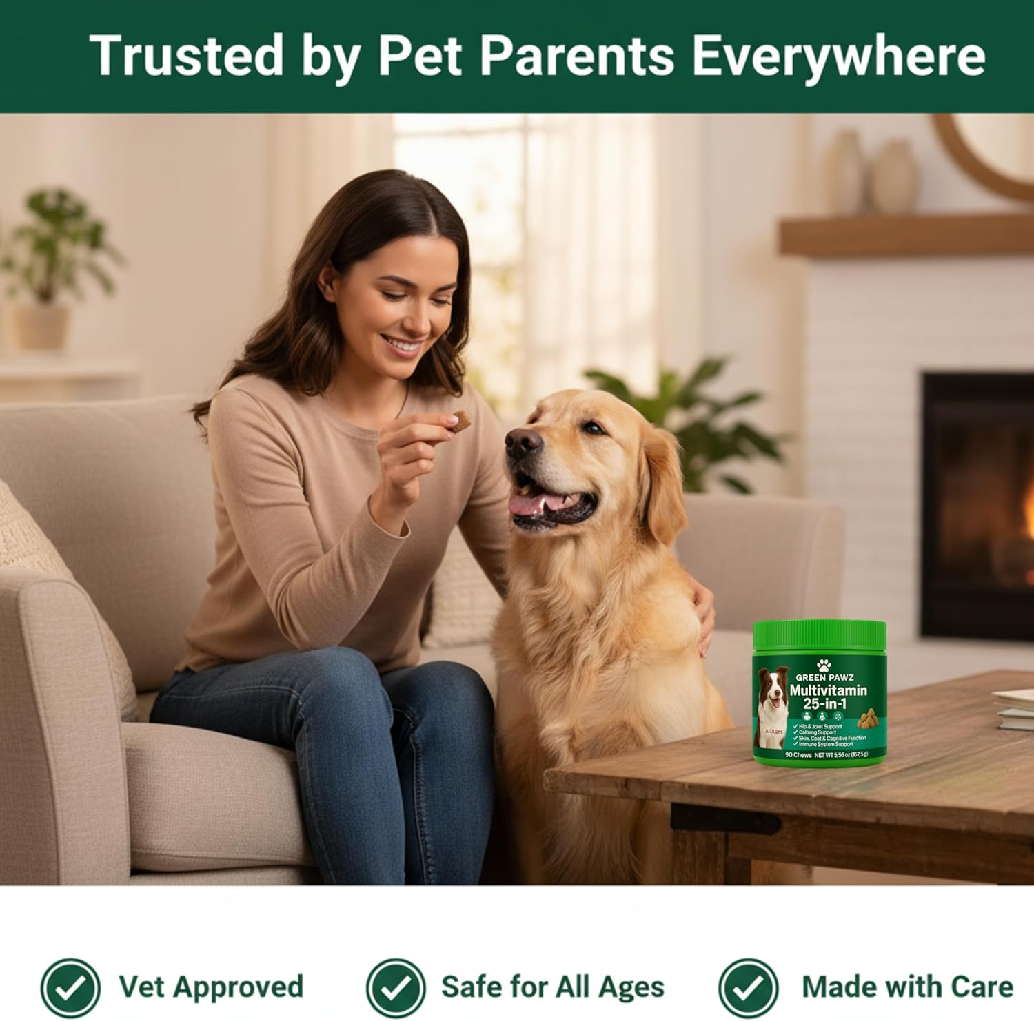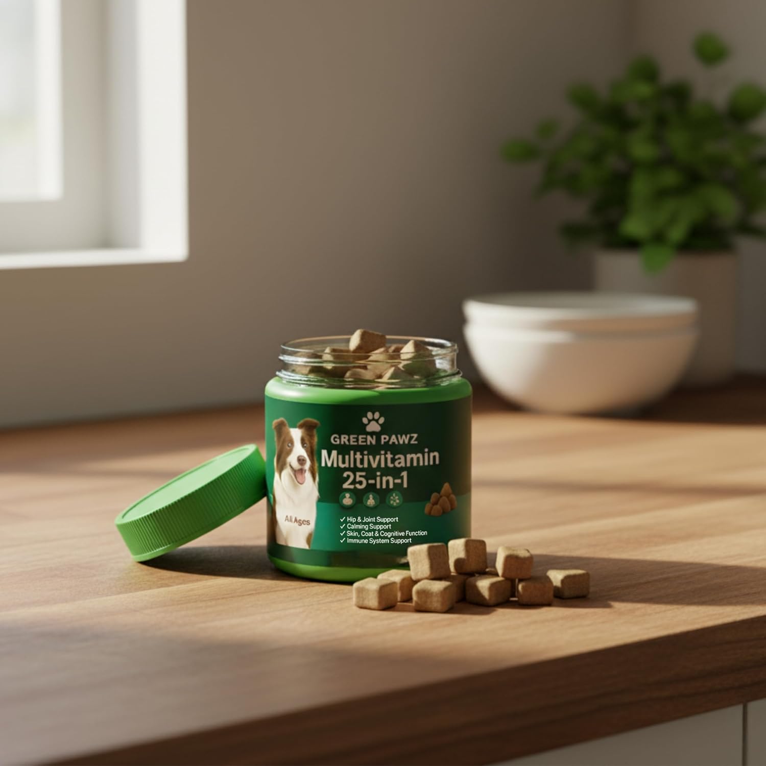 Green Pawz 25-in-1 Dog Multi vitamins for dogs are made to keep your pup feeling their best every single day. With dog Glucosamine, Chondroitin, and MSM, they help support flexible joints and ease stiffness so playtime is more comfortable. Probiotics, S. boulardii, and natural fiber keep digestion running smoothly while essential vitamins, minerals, Taurine, CoQ10, and Astragalus Root work together to support a strong immune system and an optimal heart. Each dog vitamin chew is made with natural chicken flavor and no grain, corn, soy, artificial flavors, or preservatives, so you can feel good about what you’re giving your dog. Whether you’ve got a growing puppy, an energetic adult, or a senior companion, these daily dog vitamins and supplements are designed for every breed, size, and age to help them stay happy and full of life.