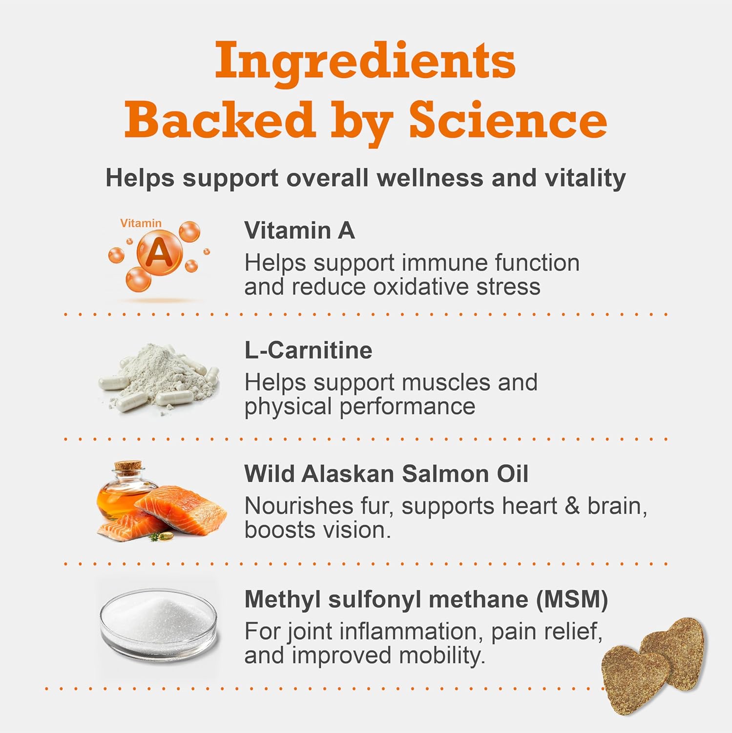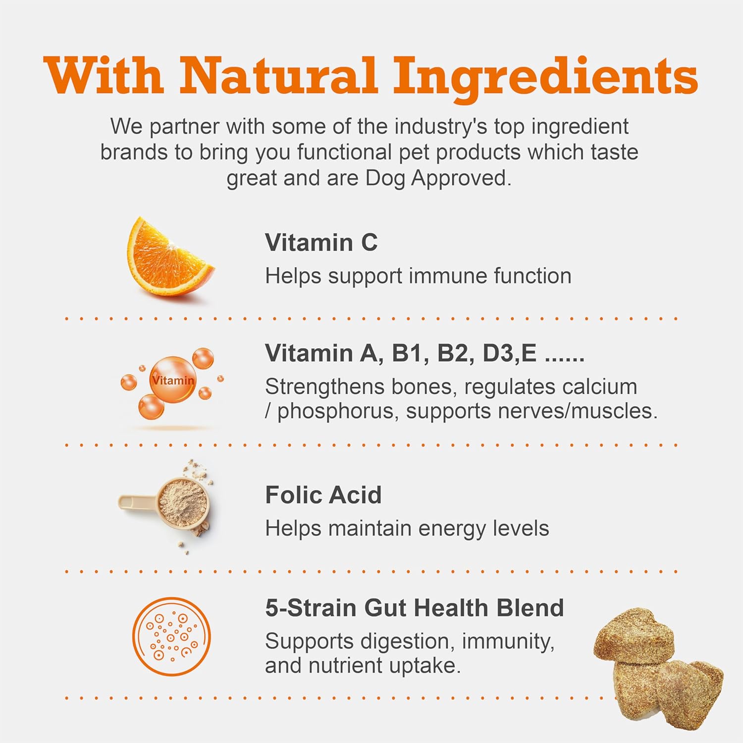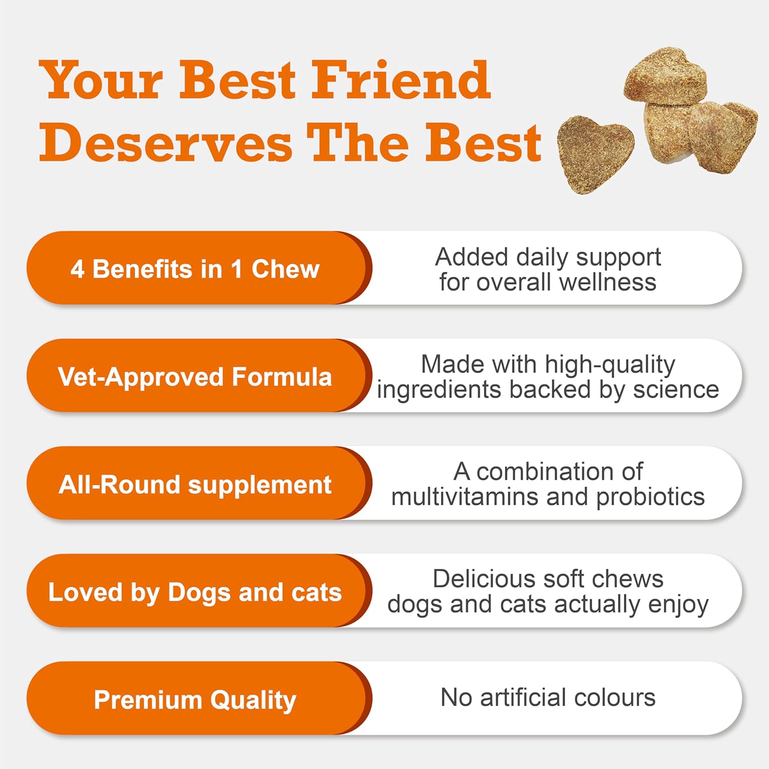 About this item 25 In 1 Dog Multivitamin Formula:Our Multivitamins are offers a unique and effective blend of dog supplements & vitamins, including probiotics,chondroitin,hemp seed oil,krill oil,and biotin that support the overall health of your furry friend A Truly Healthy Skin and Coat:Our multivitamin formula contains Biotin, a key nutrient for healthy skin and good-looking fur. It also supports gut health because Biotin helps the body metabolize carbs, fats, and amino acids. As a result, your pet will be happier with silky, supple & soft hair! Integral Hip, Joint, Heart & Digestion Support:The dog vitamins chewable formula specifically targets full support for hips, joints, heart & normal digestive function.Glucosamine and Chondroitin helps to promote healthy cartilage, ligaments and synovial fluid. They stimulate cartilage synthesis & delay cartilage degeneration Suitable For All Ages and Sizesula:Our puppy vitamins and supplements are suitable for all dog sizes: small, medium, and large. These chews are appropriate for dogs of all ages, puppies and senior dogs Better Palatability:The dog supplements & vitamins have an ultra-soft chewy texture and delicious natural chicken flavor, ideal even for the pickiest of eaters! So dogs of all sizes loves our chews and our soft chews are very palatable as well βΊ See more product details