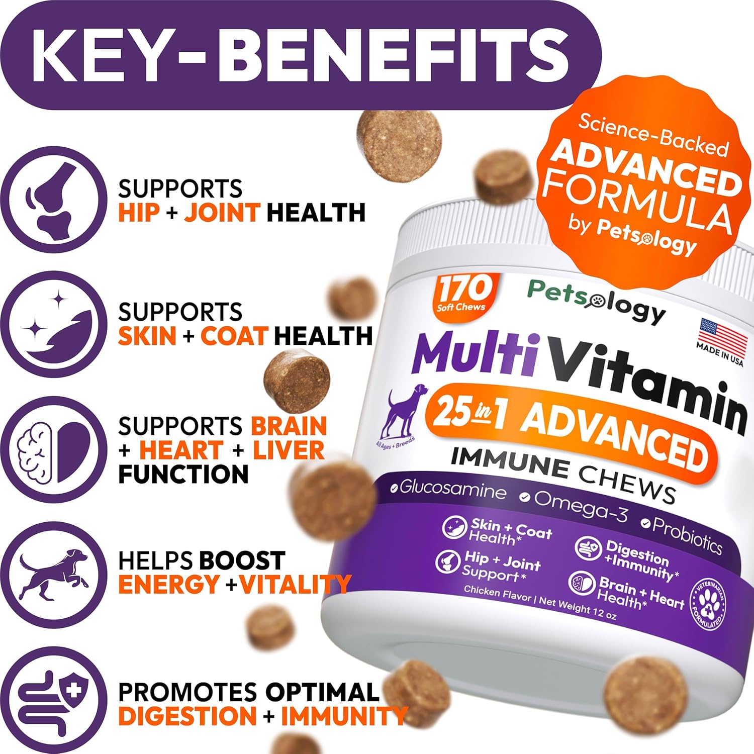 About this item 25-IN-1 Comprehensive Dog Multivitamin: Our pet vitamins and supplements provide essential nutrients to support overall wellness, including joints, digestion, skin, gut, immunity and heart health. Skin, Coat, Immune & Digestive Boost: Packed with probiotics, antioxidants, and essential nutrients, our dog supplements & vitamins promote gut health and a strong immune system. Strong Joints & Mobility: This dog vitamins multivitamin, with glucosamine and chondroitin, supports joint lubrication, flexibility, and stiffness relief for better mobility in dogs of all ages. Made in the USA in an FDA-Registered Facility: These vitamins for dogs are produced under strict quality standards and rigorous testing to ensure safety, purity, and effectiveness for overall health. Premium and Natural Ingredients Formulated by Veterinarians: Our carefully crafted formula includes high-quality ingredients to provide balanced puppy vitamins for growing and adult dogs alike. › See more product details