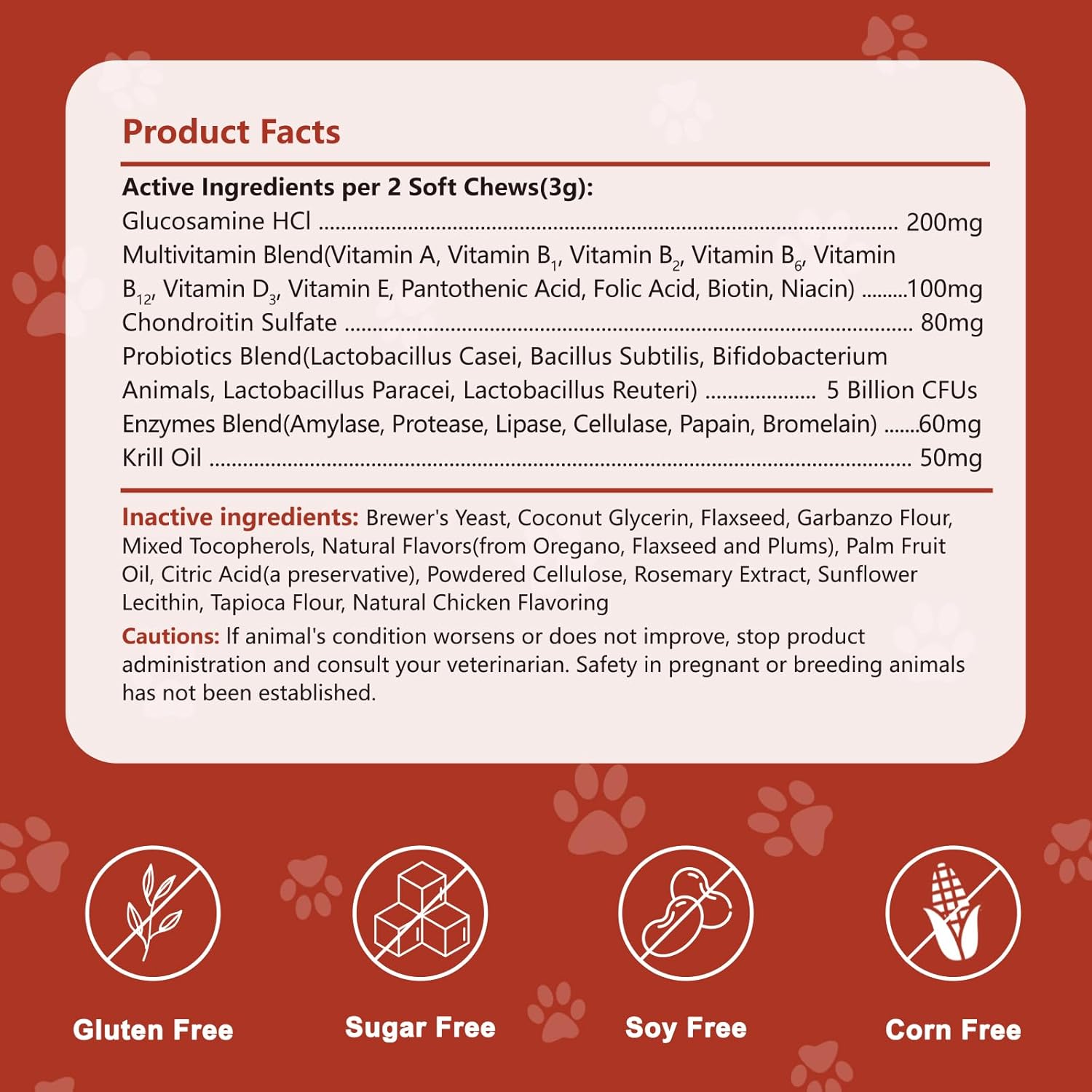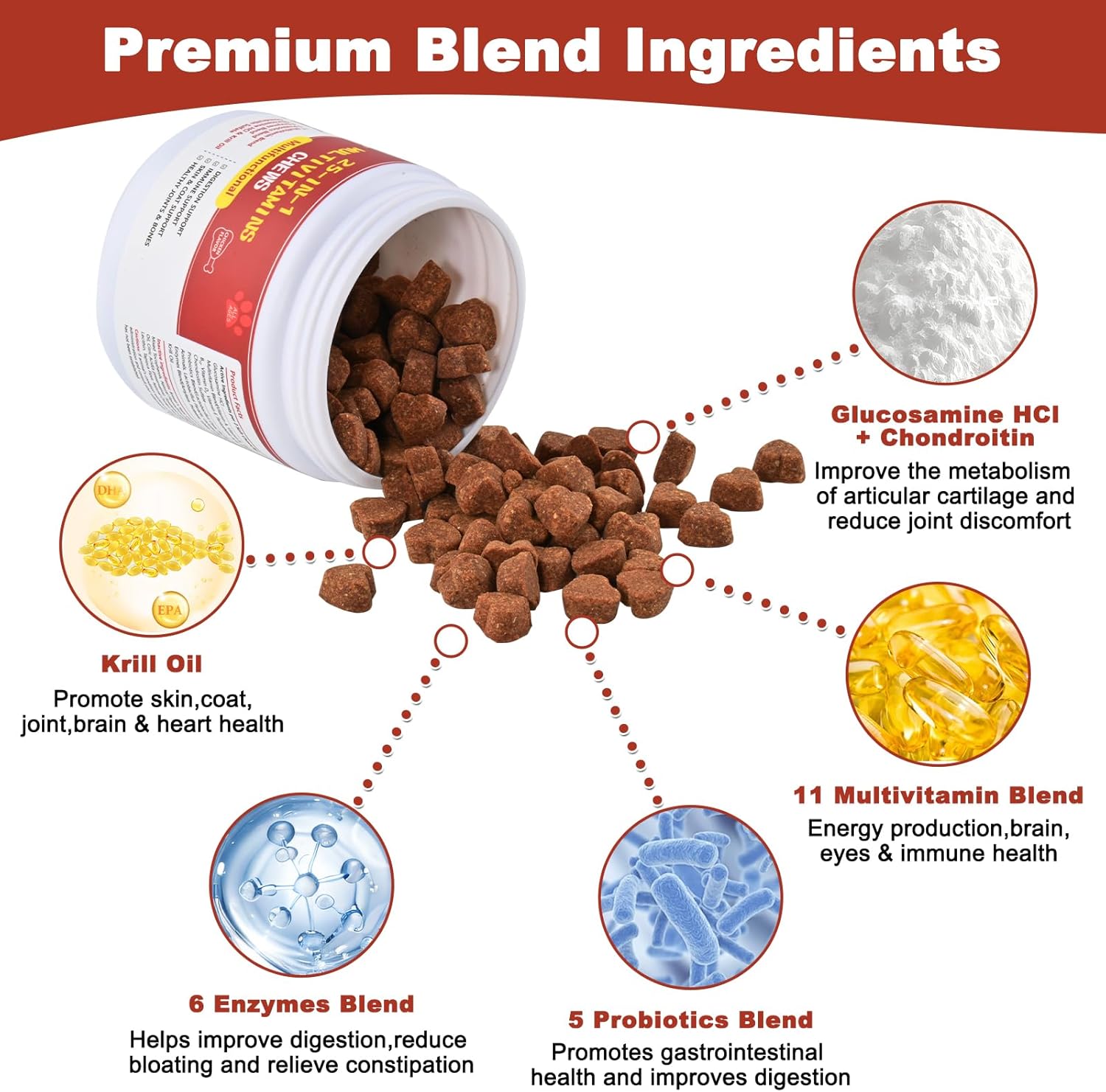 About this item 25 In 1 Multivitamin For Dogs: Our Chewable Multivitamin for Pets contains 11 multivitamins, 5 probiotics, 6 enzymes, glucosamine, chondroitin sulfate and krill oil, as well as other ingredients that are beneficial to your pet's overall health, and is a high potency formula formulated to enhance your dog's overall health. Digestive and Immune Support: Our dogs vitamin blend of 5 probiotics and 6 enzymes helps maintain healthy gut flora, relieve bloating and constipation, support digestive health, promote nutrient absorption and strengthen your dog's immune system. Skin & Coat Health: Natural Pet Health Supplement contains Vitamin E, Biotin, and Omega 3 to help with coat health, relieving dry, itchy, irritated skin, shedding, and enhancing the strength, luster, and overall health of the coat. Hip SupportοΌChewable tablets for dogs all contain chondroitin, glucosamine, and a multivitamin complex, these help reduce joint inflammation caused by normal activity, support hip and joint health, and improve joint flexibility in dogs and cats! Delicious: Dog supplements and vitamins, we use freeze-drying technology to maximize original nutrients and have have has an ultra-soft chewy texture and a delicious natural chicken flavor, making it a great choice for all breeds and sizes of dogs! βΊ See more product details