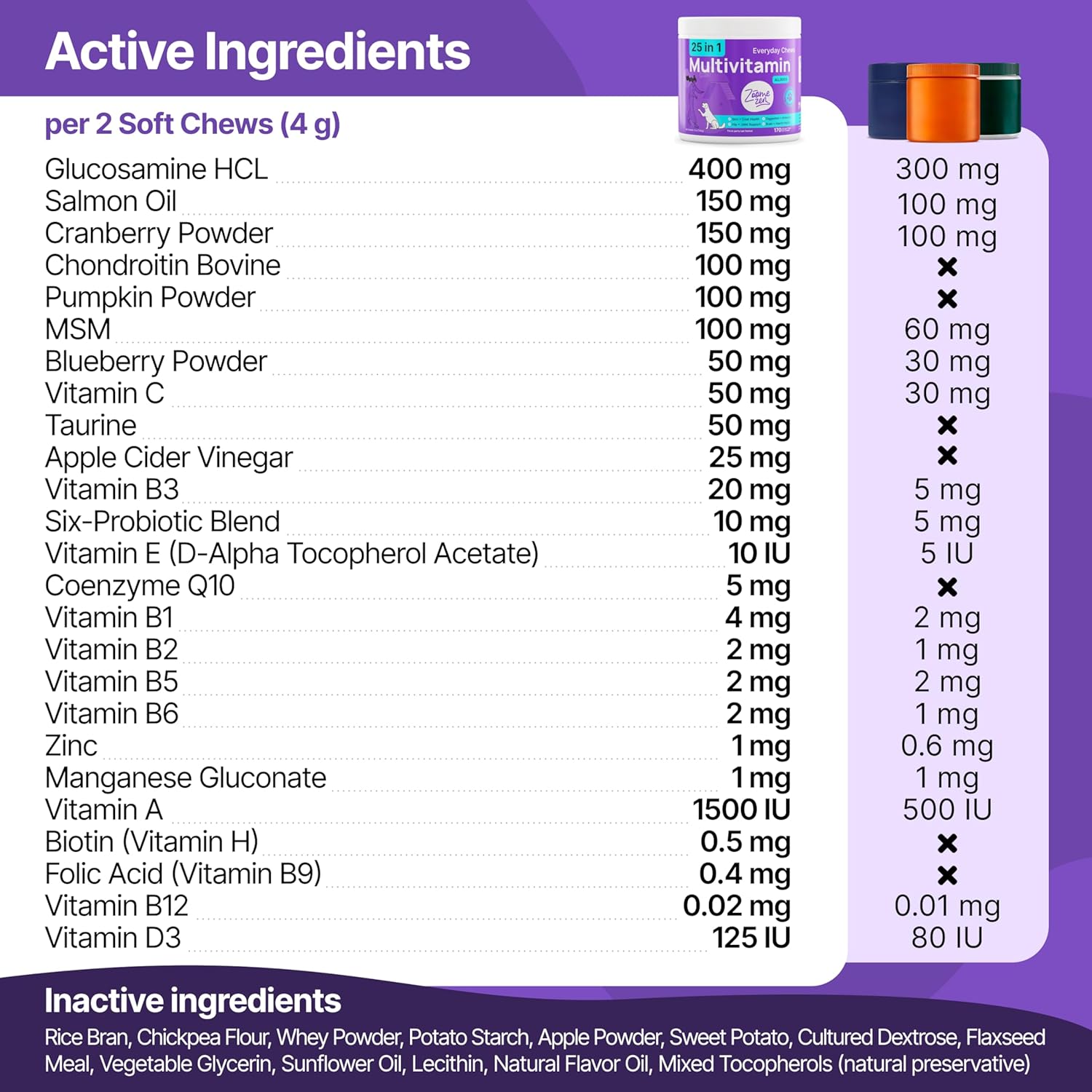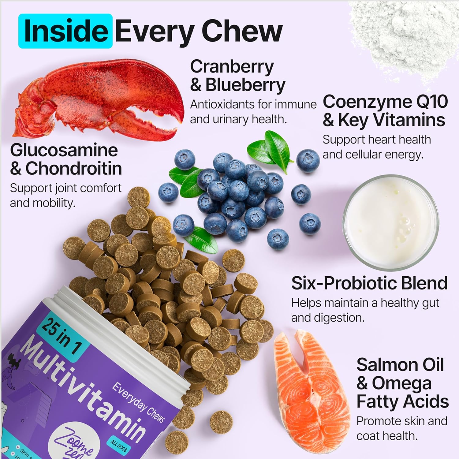 About this item All-in-One Wellness Support: Zoomezen dog vitamins multivitamin chews combine glucosamine, salmon oil, cranberry, dog probiotics, and essential nutrients. These dog vitamins and supplements promote hip and joint comfort, skin health, immunity, digestion, and overall vitality; Vitamins for dogs with Chicken Flavor. Joint Comfort & Mobility: Formulated as a joint supplement for dogs, our chews deliver glucosamine and chondroitin for flexible joints and mobility. They double as a hip and joint supplement dogs will love, making care easy and effective. Skin, Coat & Digestive Care: Multivitamin for dogs chewable with salmon oil, pumpkin, and probiotics supports glossy coats, healthy digestion, and gut balance. These treats are safe, tasty, and effective for everyday wellness. Immune & Urinary Health: Cranberry, blueberry, and vitamin C deliver antioxidants for natural defense. Perfect as senior dog multivitamin support, these pet vitamins and supplements chews also help maintain urinary health and resilience in every stage of life. Vet Formulated Quality: Our dog multivitamin made in USA is produced in an FDA-registered facility with strict quality controls. Each batch of canine multivitamin for dogs is tested for safety and potency, ensuring trusted supplements for your pup. › See more product details