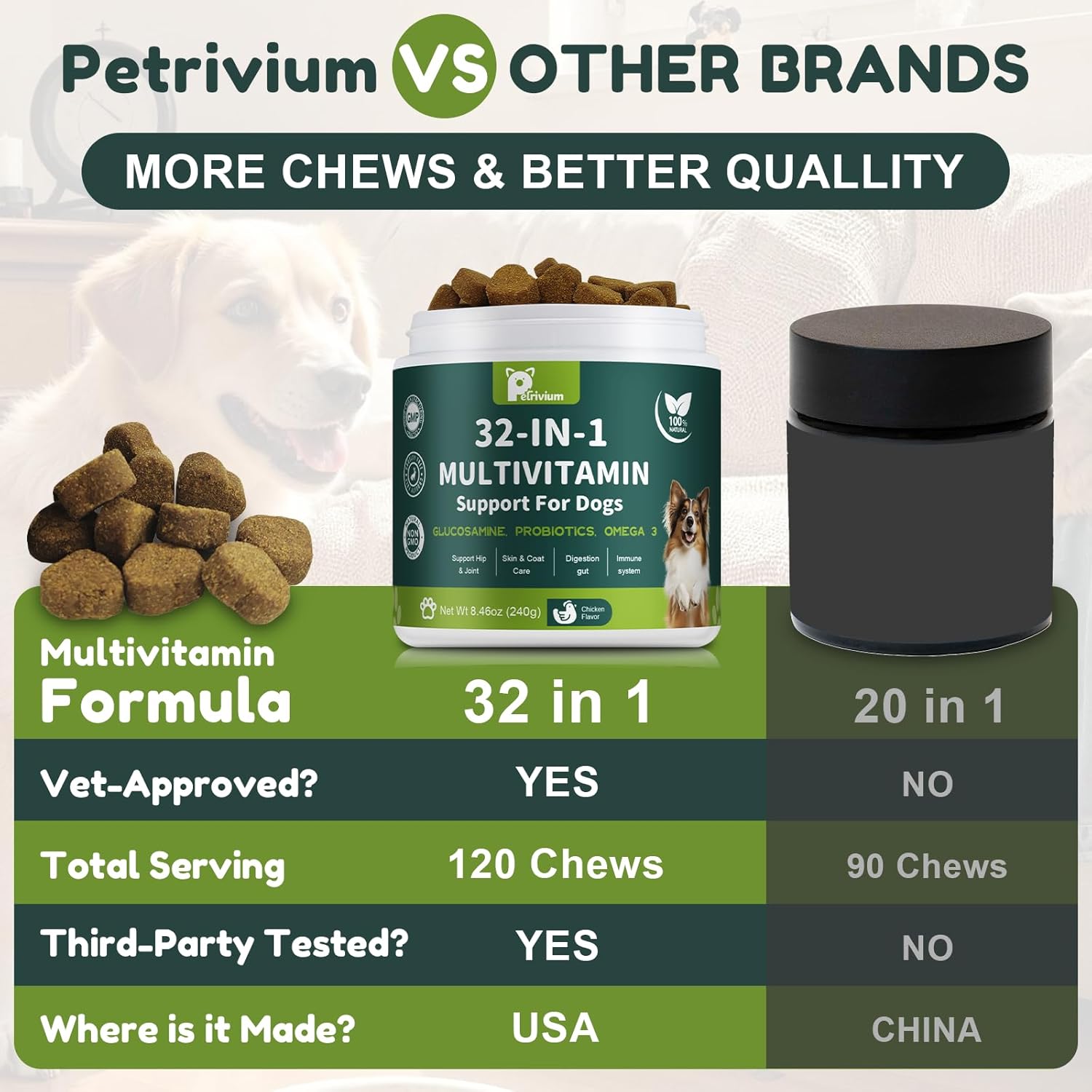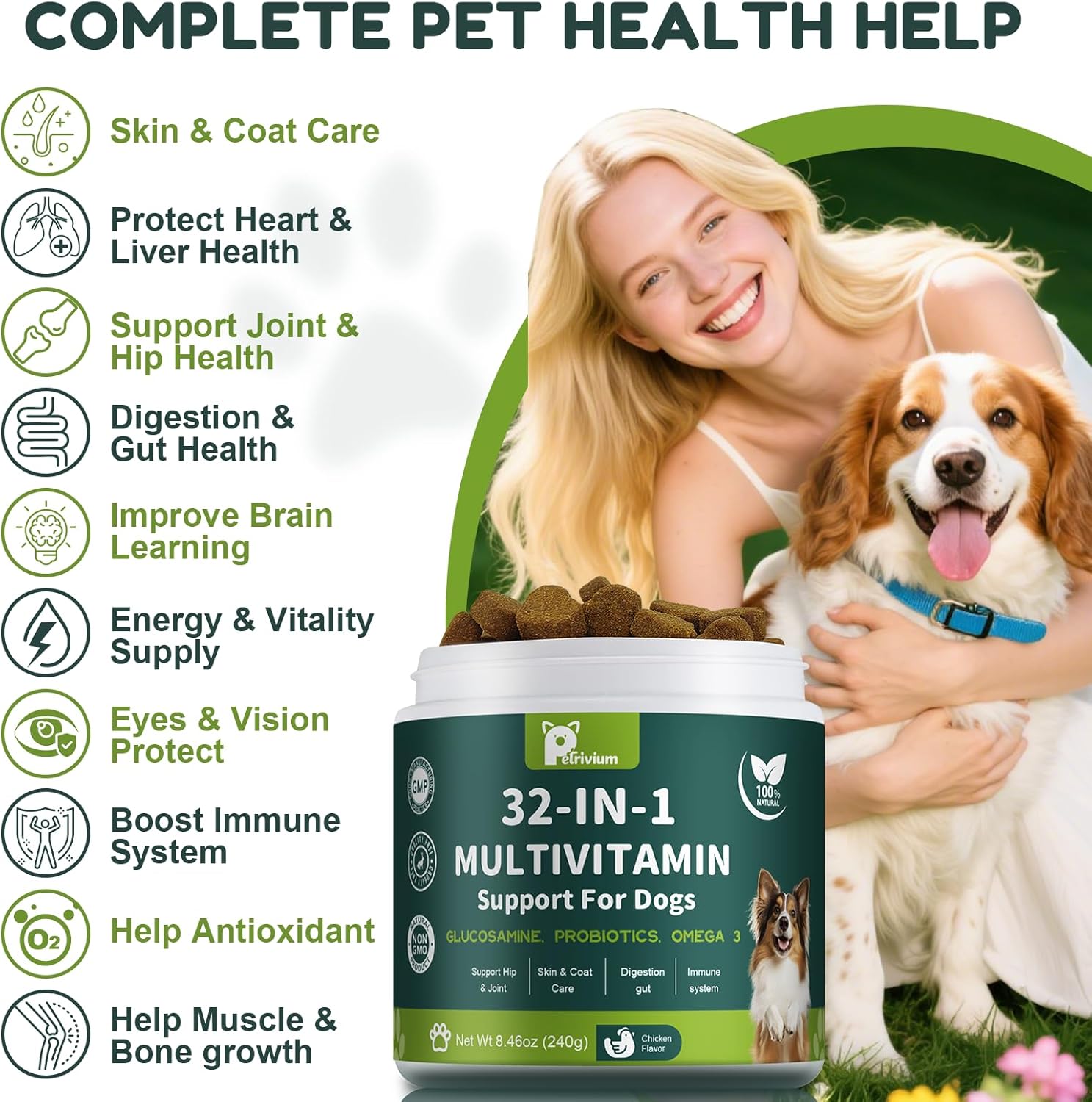 About this item 【32-in-1 Dog Multivitamin Supplement】Formulated to promote your dog's complete health, Our dog multivitamin chews are loaded with essential minerals and vitamins like zinc and folic acid, and packed with key nutrients including glucosamine, probiotics, and omega fatty acids, These tasty treats support joint flexibility, maintain a healthy coat, and boost the immune system. Supporting your pet’s health from nose to tail. 【Promotes Hip & Joint Health】Each dog vitamin chew features a powerful mobility-supporting formula that contains glucosamine, chondroitin, and MSM — key nutrients that support healthy cartilage and connective tissue development in your dog. Omega rich fish oil, plus Vitamins D and E to help maintain joint mobility. Our dog vitamins and supplements support your dog’s overall joint health, help ease joint stiffness, and improve flexibility. These chewable multivitamins promote a comfortable, active life for dogs of all sizes. 【Skin & Coat Wellness】Our dog vitamins supplement combines powerful antioxidants like Selenium and Vitamin E with essential fatty acids Omega-3 & Omega-6 to promote healthy skin and a glossy coat. Contains the colostrum, it helps strengthen your dog’s immune system and supports overall wellness. This blend soothes inflammation and itch, offer the vital nutrients needed to restore shine and vitality to your dog’s coat. 【Dog Digestive Support】Not only packed with essential vitamins and minerals to promote your dog’s overall health and vitality, our multivitamin chews also contain prebiotic inulin and 6 probiotic strains with 500 million CFU to support healthy digestion and gut balance. This combination helps keep your dog’s digestive system running smoothly, reducing occasional digestive upset and promoting lasting comfort — so your furry friend can enjoy every day to the fullest. 【Formulated for All Dogs】Suitable for dogs of all ages and sizes—from energetic puppies to wise seniors—our vitamins and supplements provide the essential nutrients your loyal companion needs at every stage of life. 【Buy with Confidence 】— If you or your pet aren’t completely satisfied with the results, we’ve got you covered. If you have any issues with the product, simply contact us via Amazon Message Center. You’ll Enjoy a full refund, no questions asked! › See more product details