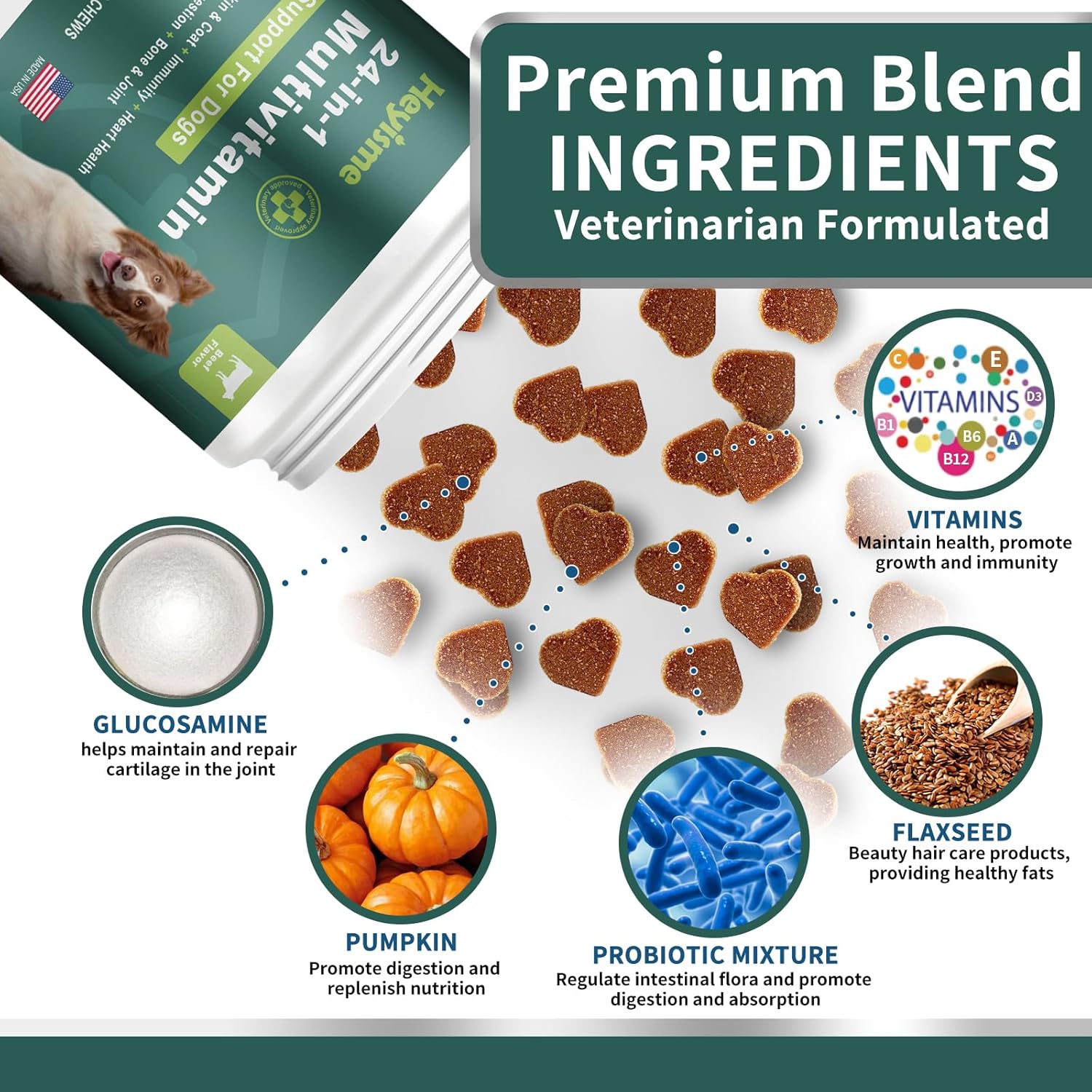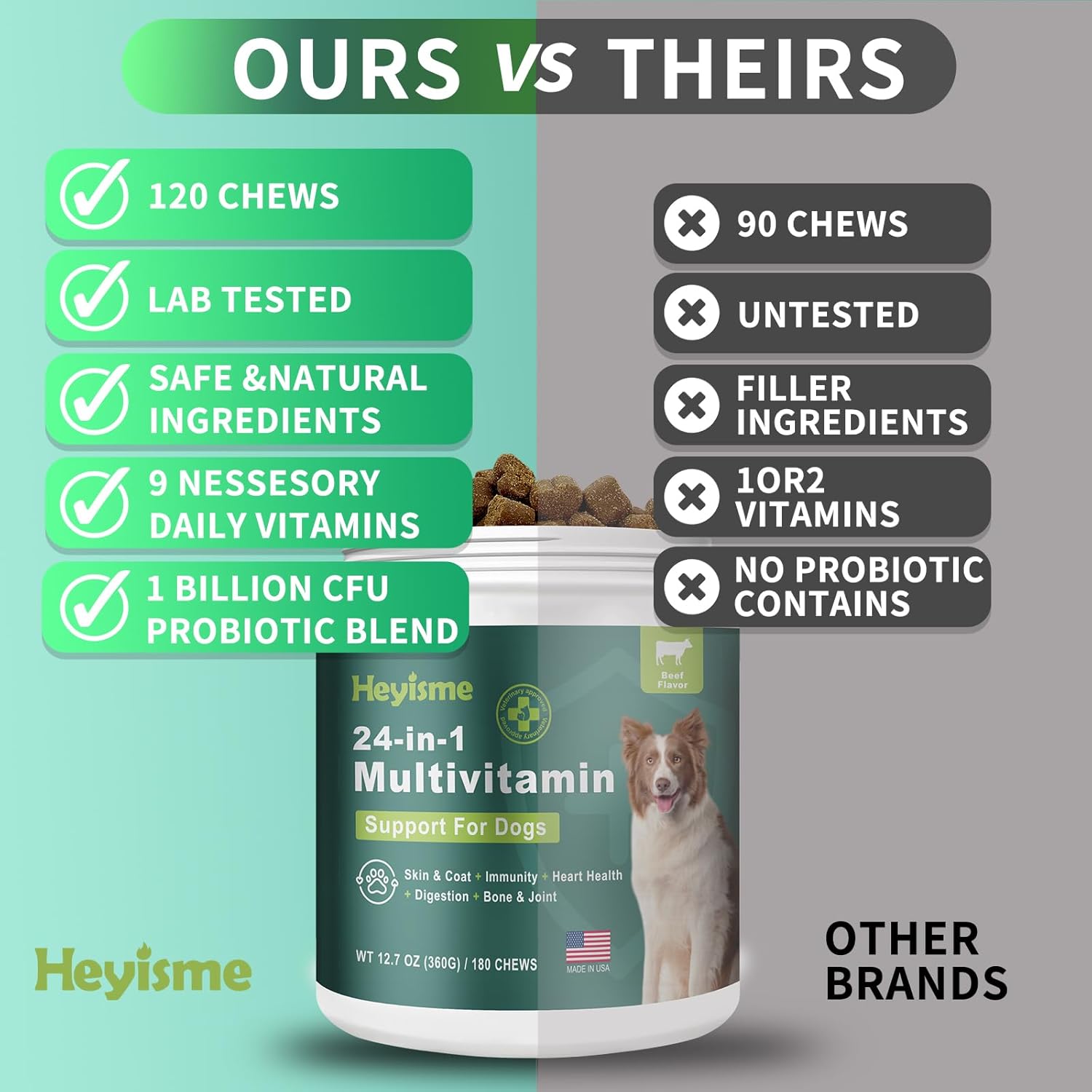 Introducing HEYISME's 24-in-1 Multivitamin Chews, the ultimate daily treat designed to support your dog’s overall health and well-being. These comprehensive chews are packed with a balanced blend of essential vitamins, minerals, and supplements, ensuring your furry friend receives all the nutrients they need in just one delicious chew per day. Comprehensive Daily Support in One Treat HEYISME's 24-in-1 Multivitamin Chews deliver a potent combination of glucosamine, probiotics, omega fatty acids, and more, providing comprehensive daily care for your dog. Each chew is formulated to address multiple aspects of your pet’s health, making it easier than ever to ensure they stay happy and healthy. Enhanced Joint Mobility with Glucosamine Fortified with high levels of glucosamine and other joint-supporting ingredients, these natural soft chews help reduce inflammation, improve mobility, and enhance flexibility. Whether your dog is young and active or older and needs extra support, these chews will keep them moving comfortably and confidently. Promotes Digestive Health with Probiotics Each chew contains 1 billion CFU of probiotics and pumpkin, promoting a healthy digestive system. By aiding digestion and preventing common issues like diarrhea, vomiting, and upset stomach, these chews ensure your dog feels its best every day. A healthy gut means a happier, more energetic pet. Nourishes Skin & Coat with Omegas Enriched with eggshell meal and krill oil omegas, these chews provide the vital nutrients needed to soothe dry, itchy skin and promote a stronger, shinier coat. Your dog will not only look healthier but feel healthier too, from head to tail. Boosts Immunity & Heart Health A potent blend of Vitamins A, C, and D3, known for their anti-inflammatory and antioxidant properties, supports a robust immune system and cardiovascular health. The delicious soft chews make it easy to give your dog the care they deserve, ensuring they stay strong and vibrant.