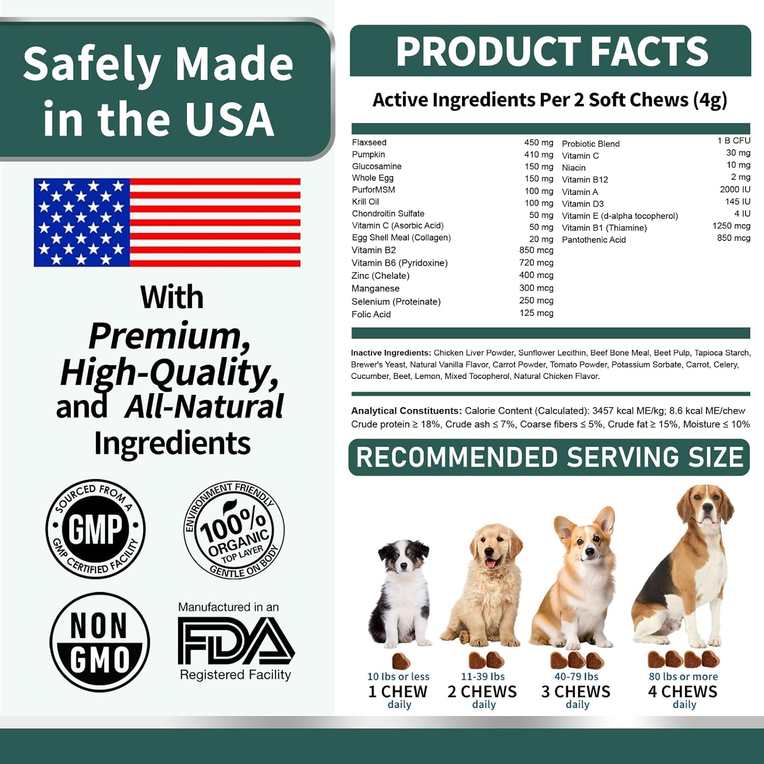 - Directions: Up to 10lbs = 1 Chew, 11-39lbs = 2 Chews, 40-79lbs = 3 Chews, 80+lbs = 4 soft chews daily. All breeds all ages
