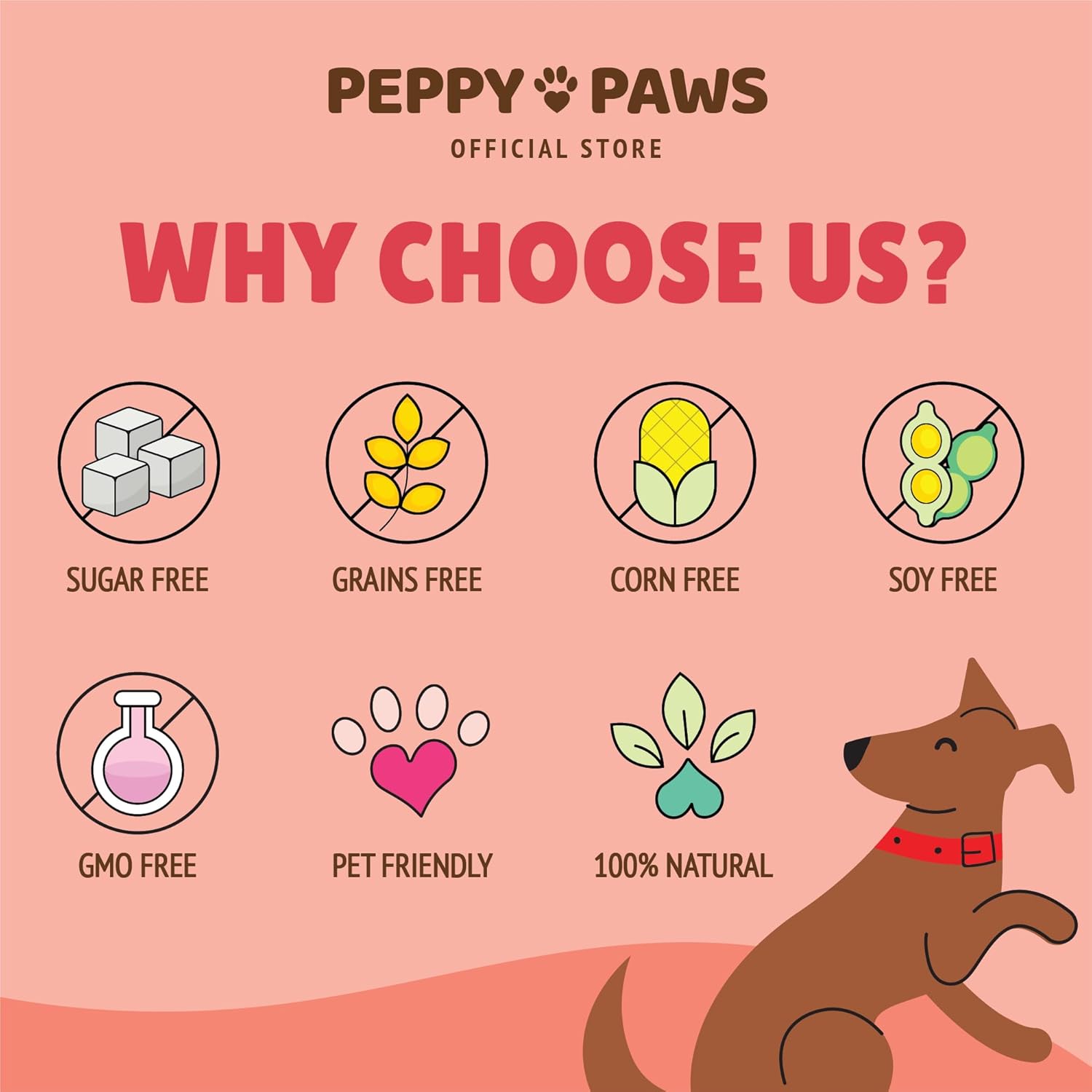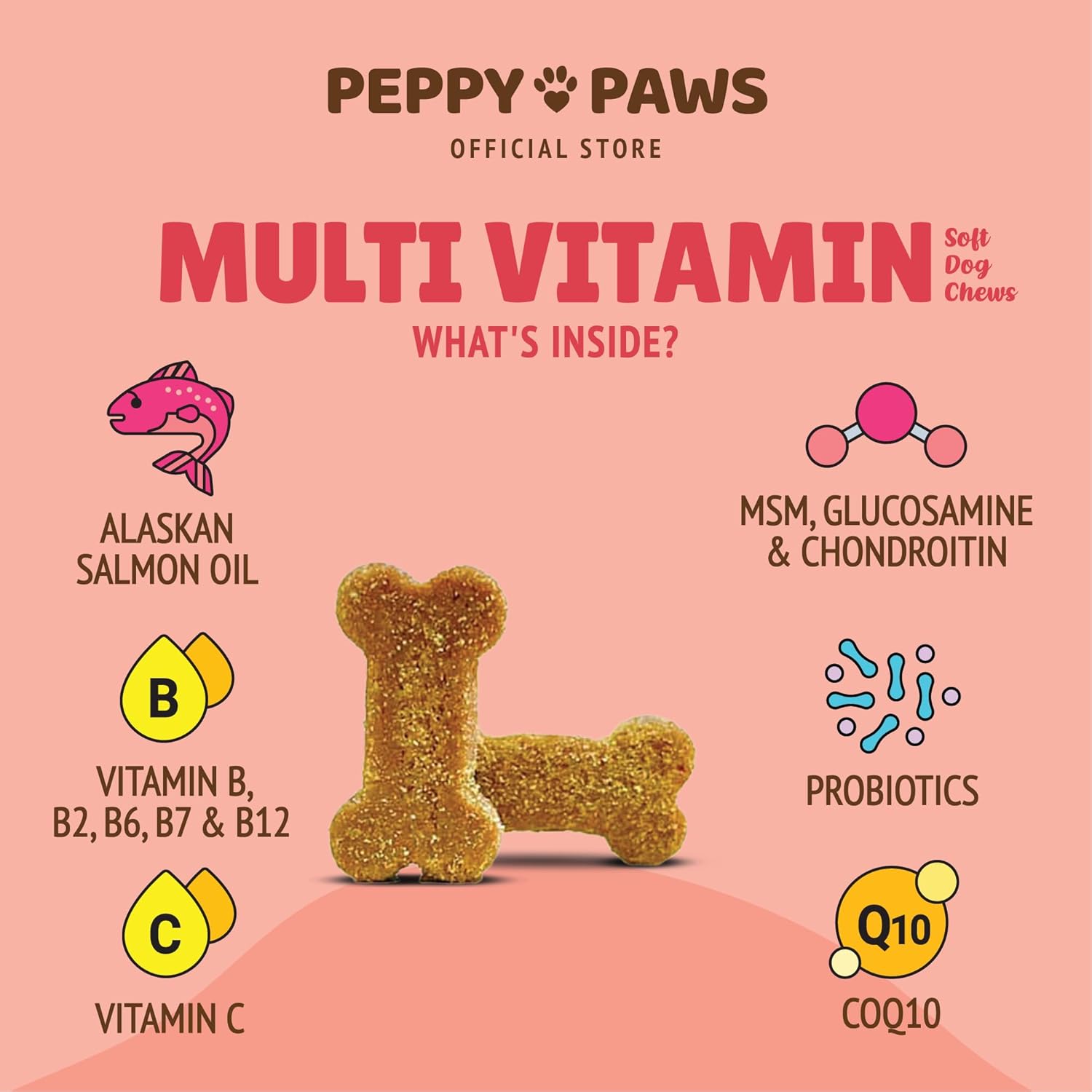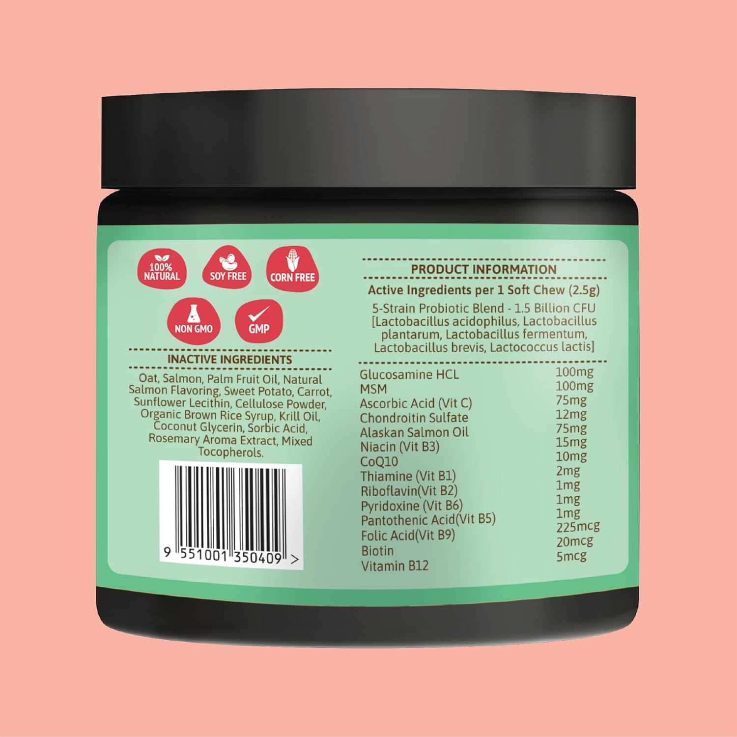 About this item Comprehensive 8-in-1 Support: Promotes joint mobility, heart health, skin & coat condition, digestive wellness, immune function, liver health, antioxidant activity, and overall vitality in dogs of all sizes. Natural Salmon Flavor : Made with Alaskan Salmon Oil, Krill Oil, Sweet Potato, and Oats, these soft chews are delicious and packed with nutrients to support your dog's health without artificial additives. Joint & Mobility Blend : Contains Glucosamine HCL, MSM, and Chondroitin to support joint flexibility, reduce inflammation, and promote active mobility in aging or active dogs. Feeding Guide: For optimal results, feed your dog Peppy Paws soft chews daily, based on their weight: small dogs (up to 25 lbs) - 2 chews/day, medium dogs (25-75 lbs) - 4 chews/day & large dogs (over 75 lbs) - 6 chews/day. Essential Vitamins & CoQ10: Enriched with B2, B6, B7, B12, Vitamin C, and CoQ10 to strengthen immunity, boost heart function, support metabolism, and help maintain a shiny coat. Gut-Friendly & GMO-Free : Includes a 5-strain probiotic blend (1.5 Billion CFUs) to support digestive health. Free from grains, corn, soy, sugar, and GMOs. Ideal for daily use in dogs of all breeds. › See more product details