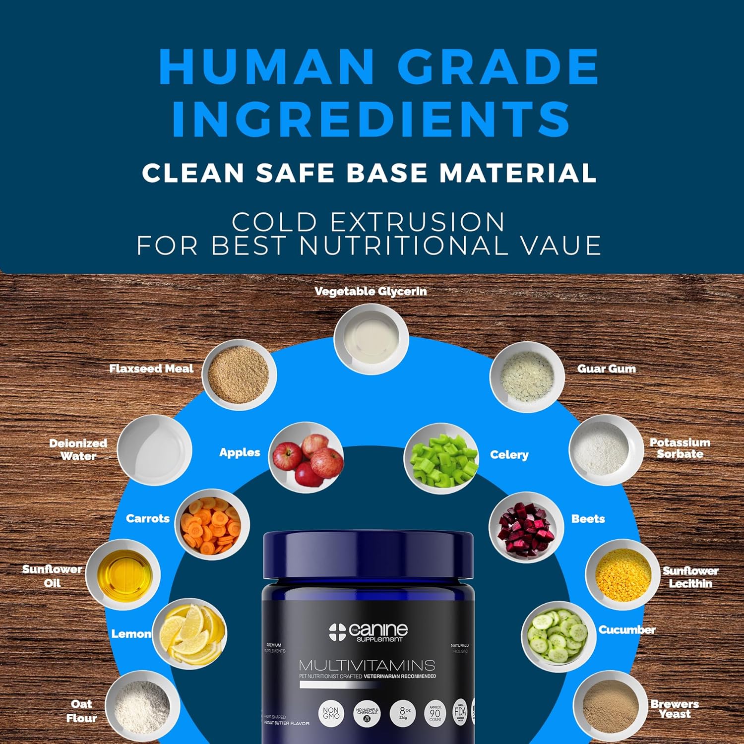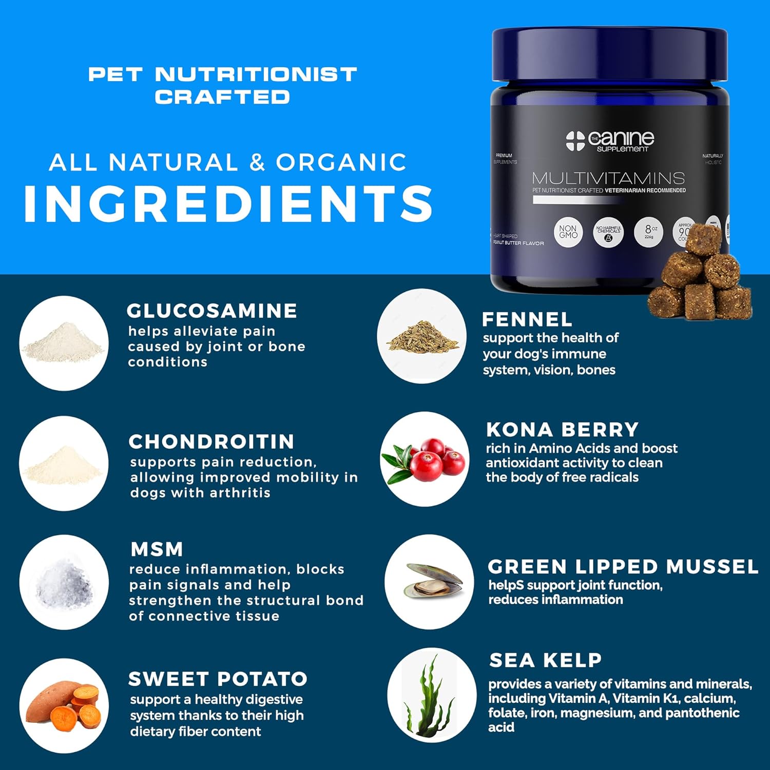 About this item HIP & JOINT SUPPORT FOR ACTIVE & AGING DOGS: Each chew includes glucosamine, MSM and chondroitin to promote mobility, reduce stiffness and support long-term flexibility, perfect for senior dogs and energetic pups alike. A complete joint care formula for maintaining healthy cartilage and movement through all life stages. COMPLETE WELLNESS FOR IMMUNE & GUT HEALTH: Packed with essential vitamins, minerals and probiotics, this multivitamin helps maintain healthy digestion and immune function. Support your dog’s gut flora and overall wellness, especially beneficial for dogs needing immune reinforcement or digestive support. FOR ALL BREEDS, SIZES & LIFE STAGES: From playful puppies to senior companions, these soft chews provide complete wellness support at every life stage. Designed for dogs of all breeds and sizes, this all-in-one multivitamin is a smart addition to your dog’s routine, delivering real health benefits in a tasty, easy-to-chew form. TASTY ALTERNATIVE TO PILLS OR POWDERS: No more struggling with tablets or messy supplements, these soft chews are flavoured with roasted peanut and loved by picky eaters. An easy, mess-free alternative to powders and liquid supplements, each chew feels like a treat while delivering the full support of a premium multivitamin supplement. MADE IN THE USA WITH CLEAN INGREDIENTS: Formulated by vets and manufactured in a GMP-certified US facility with strict quality standards. Free from artificial flavors, colors, wheat, corn, soy and preservatives. Clean, safe and trustworthy, it's the perfect choice for dog owners who care about quality and long-term health. › See more product details