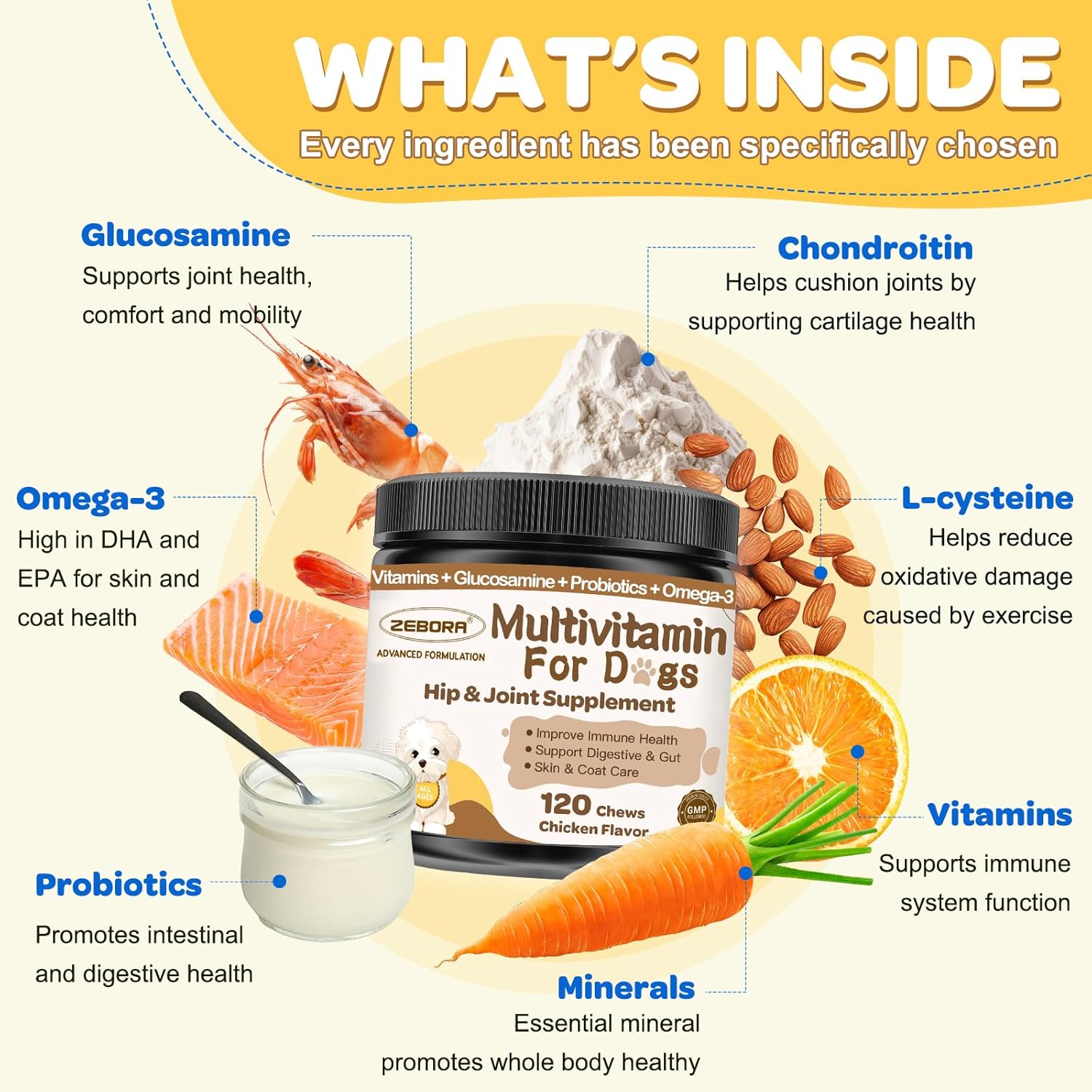 About this item HUMAN-GRADE MULTIVITAMIN: ZEBORA dog multivitamins chewable contains vitamins, minerals, antioxidants, omega 3 fatty acids, glucosamine, chondroitin and 1 billion CFU of probiotics that support your pet's health balance and help them in peak condition COMPLETE VITAMINS AND MINERALS FOR LONGEVITY: ZEBORA dog vitamins multivitamin is crafted with Antioxidants to foster a healthy immune system with powerful B Vitamins, Vitamins A, C, E & D3. And minerals work together to fills the pup's nutritional gap COMPERHENSIVE SUPPORT FROM THE INSIDE OUT: Digestive support through 1 billion CFUs dog probiotics. Hip and joint supplement for dogs with Glucosamine, Chondroitin & L-cysteine. Skin and coat supplement for dogs with omega 3 which is rich in EPA & DHA SUPERIOR TO SOFT CHEW OPTIONS: Raw chicken and goat milk delicious bite-sized chews ensure easy to give vitamins for dogs. Utilizing freeze-drying technology, remove all moisture to better preserve nutrients, making it less susceptible to spoilage or mold FOR ALL DOGS & CATS VITAMINS: With gentle formulas that are easier on sensitive stomachs. No matter what size, age or breed your pet is, our senior and puppy vitamins provide long-term support and protection TAILORED FOR OPTIMAL RESULTS: Our dog supplement are formulated and praised by vets. We have passed GMP testing, are dairy-free soy-free, corn-free, wheat-free and Non-GMO, and have no hidden ingredients. Helping your dog pals stay snazzy and healthy βΊ See more product details