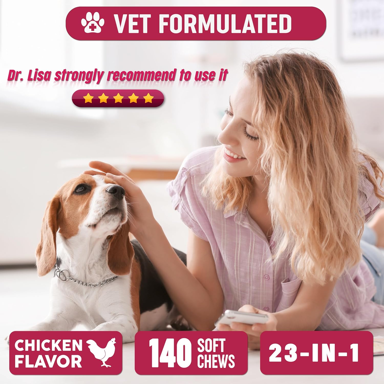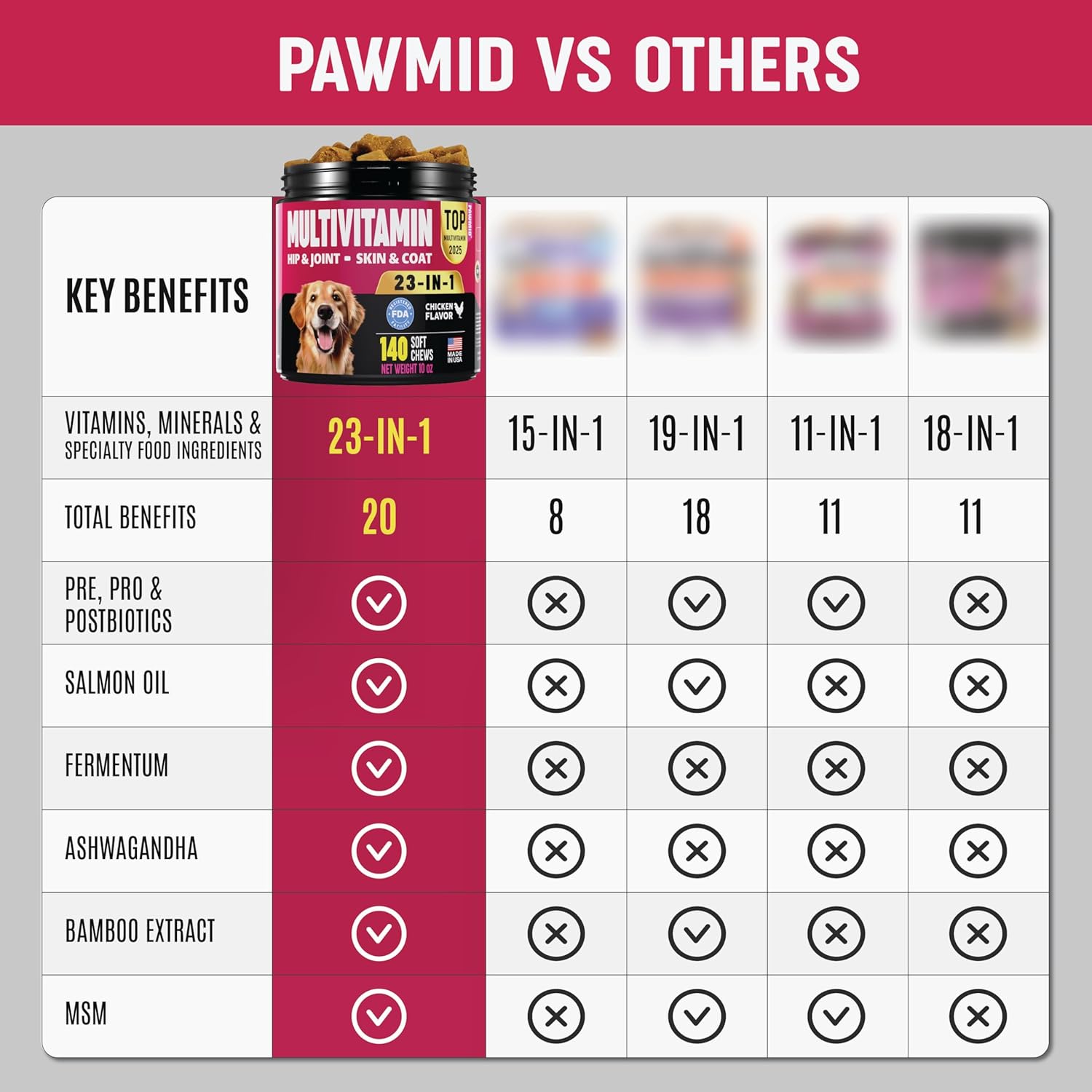About this item 23-in-1 Dog Multivitamins: Formulated to support your dog’s complete health, including Glucosamine, Probiotics, Omega-3 from salmon oil, and antioxidants, to promote joint health, digestion, and vibrant well-being from head to tail. Hip & Joint Vitality: It is enriched with Glucosamine and targeted nutrients, supports hip and joint health, reduces inflammation, and boosts flexibility, empowering your dog with enhanced mobility and a vibrant, active lifestyle. Gut Health + Healthy Skin & Coat: with 6 probiotics and Omega-3 fatty acids, our dog vitamins and supplements promote healthy Gut flora, supports digestive wellness, strengthens immunity, and reduces itchiness and redness for healthier skin and a glossy, vibrant coat. Suitable For All Ages And Sizes: Our puppy vitamins and supplements are suitable for all dog sizes: small, medium, and large. These chews are appropriate for dogs of all ages, puppies and senior dogs Made in the USA: Pawmid multivitamins and supplements are crafted by Vet in an FDA-registered facility, ensuring premium quality, safety, and efficacy for your dog’s optimal health. › See more product details