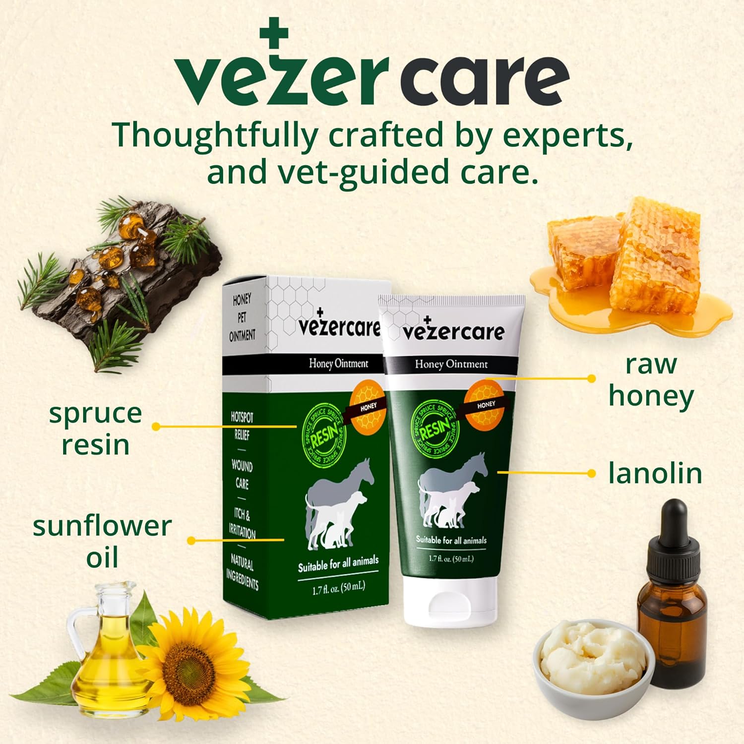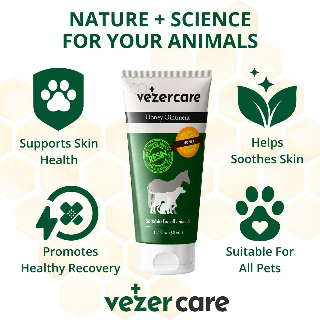 Natural Wound Support Balm for Pets: Formulated with raw honey and spruce resin, this soothing skin ointment provides a gentle and effective solution for dogs, cats, and horses with dry skin, hot spots, and minor abrasions. Lick-safe and steroid-free, it's the ideal addition to any pet owner's first-aid kit for everyday care. Itch & Hot Spot Relief for Dogs & Cats: Help reduce discomfort caused by skin irritation, hot spots, and seasonal dryness. This non-greasy balm stays in place on affected areas such as paws, ears, bellies, and folds, supporting the skin’s natural balance without artificial additives or fragrances. Pet Safe Ingredients – No Medical Claims: Designed for pets of all ages, this ointment is made with clean, trusted ingredients, including sunflower oil, lanolin, petrolatum, and spruce extract. Free from antibiotics and steroids, it's a safe topical option when licking is a concern. Ideal for routine grooming and minor skin concerns. Everyday First-Aid Balm – Paw, Nose & Skin: This multi-use salve helps condition dry paw pads, minor cuts, bug bites, saddle rubs, and other mild skin issues. It forms a breathable barrier and stays put even in active pets. Use 1–3 times daily to help keep skin comfortable and hydrated. EU Quality – Naturally Inspired Pet Care: Crafted in Finland and Estonia under strict European manufacturing standards. This balm reflects Nordic heritage and plant-based tradition, combining nature’s wisdom with modern production quality. Packed in recyclable, travel-safe tubes for convenience. Great for Multi-Pet Homes: Simplify your pet care routine with a single product that works across all species. Whether it’s your dog, cat, or horse needing topical support, Vezer Care adapts to various skin needs in one convenient, safe formula. Lick-Safe Assurance for Daily Use: Even persistent lickers can use this balm safely. The formulation stays effective without the risk of ingesting harmful ingredients, making it ideal for frequent use on paws, noses, or hot spots. Fragrance-Free and Non-Irritating: With zero added scents or colors, Vezer Care Honey Ointment is gentle enough for pets with allergy-prone or reactive skin. It’s the fragrance-free choice for both grooming professionals and pet owners. Convenient Application with Lasting Coverage: Thick yet smooth, the balm is easy to apply with fingers or applicators and doesn’t melt or run. Perfect for outdoor activities or on-the-go use—especially for working dogs or travel situations. Trusted by Vets and Pet Owners Alike: Developed in collaboration with veterinary expertise and Nordic skin care heritage, this balm combines generations of natural wisdom with modern pet wellness standards—a reliable option backed by user confidence. Show more › See more product details