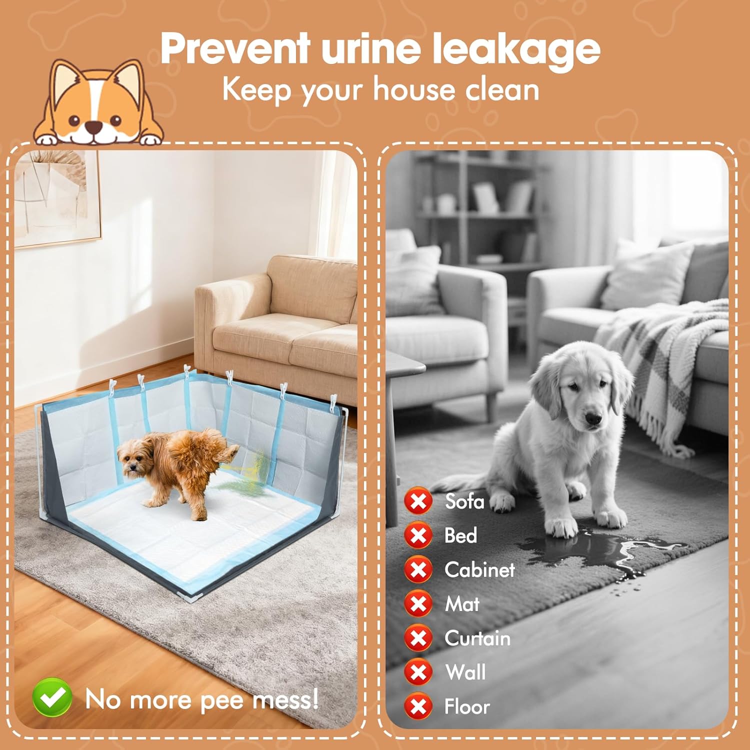 About this item Protect Walls & Indoor Furniture: Our dog pee pad holder can not only prevent your pets messy pee on floors and walls, but also protect carpets, beds and sofas. 17” tall raised sides design prevents urine splashing, thus ensuring a clean indoor environment Multi-scenarios Applied & Lightweight: The dog potty can be placed against the wall or any home places you want. Dogs can lift their leg to urinate when they don't go outside. So it's a perfect solution when you're not home or pets night pee Easy to Assemble & Lightweight to Carry: Our INRLKIT dog litter box is easy to assemble. After our colleague test, basically under the instruction guide, 15-20 minutes can complete the assembly Durable 600D Washable Cover & Thickened Waterproof Coating: Most pet owners care about convenience of dog litter box cleanness. We thought carefully and decided to choose oxford material and waterproof coating so make sure that is easy to clean. Thickened 3-layer waterproof coating make sure urine doesn't leak Reasonable Size for Most Small to Medium-sized Dogs: Our pee pad holder tray size is 31.9”L x 31.9”W x 17”H. So it’s large enough for small and medium sized dogs. Besides, we sent you clamps so you can fix your pee pads tightly to our holder. No more leaking mess again › See more product details