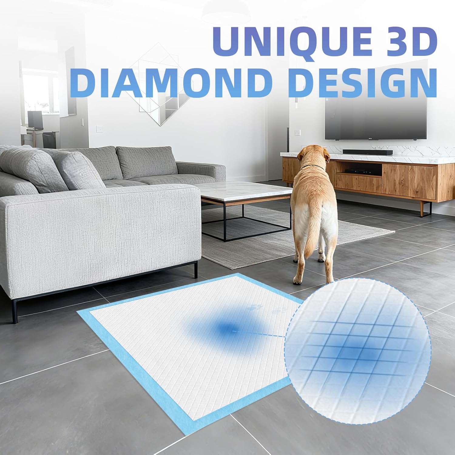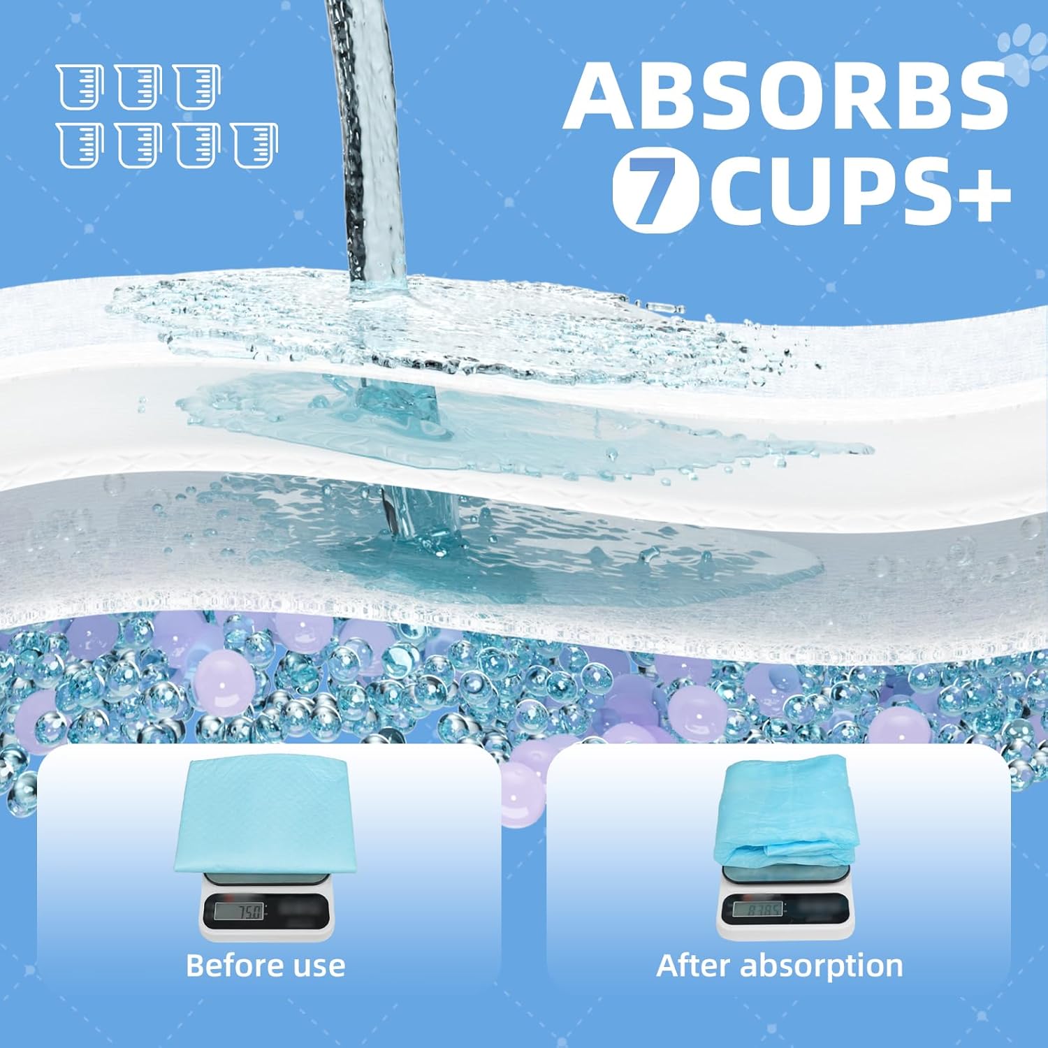 About this item 【Super Absorbent & Quick Dry】 The dog pee pads has extra imported polymer which ensures faster absorption, transforming liquid into gel. With a capacity of up to 7 cups or 1000ml, our pee pads for dogs keep surfaces dry and clean, preventing messy paw prints. 【Leak-Proof & Protection】 Our puppy pads have a diamond quilting design for quick absorption and water-locking. The PE film bottom layer offers reliable leak protection, safeguarding floors and furniture from pet urine damage, ensuring hassle-free cleanup. 【More Layers & Durability】 This extra large dog pads are made of 7 high quality layers. We have innovated to add an extra layer to the bottom. The creative design ensures durability, resisting tears and scratches, making them ideal for active puppies. 【Large Size & Multiple Purpose】 Measuring 30" x 36", our pee pads cater to all pets such as dogs, cats, rabbits, etc. Our pads serve multiple purposes, from potty training to elderly pet care and travel companionship. It's suitable for indoor or outdoor activities. 【Customer Service】 We're here for you beyond the purchase. Our dedicated team is ready to assist with any questions or feedback you may have about our products. Whether you need guidance on usage or want to share your experience, we're just a message away. › See more product details