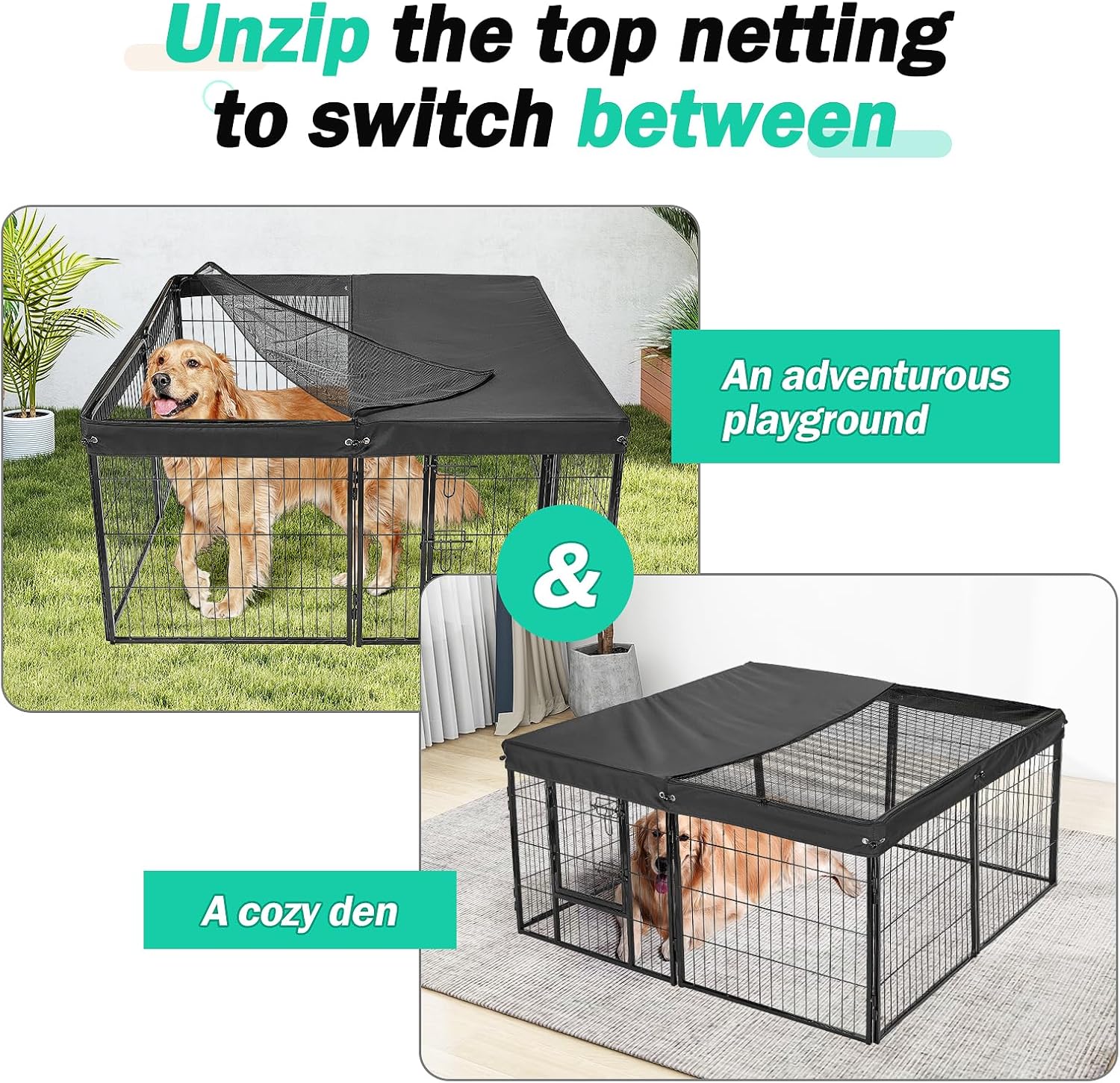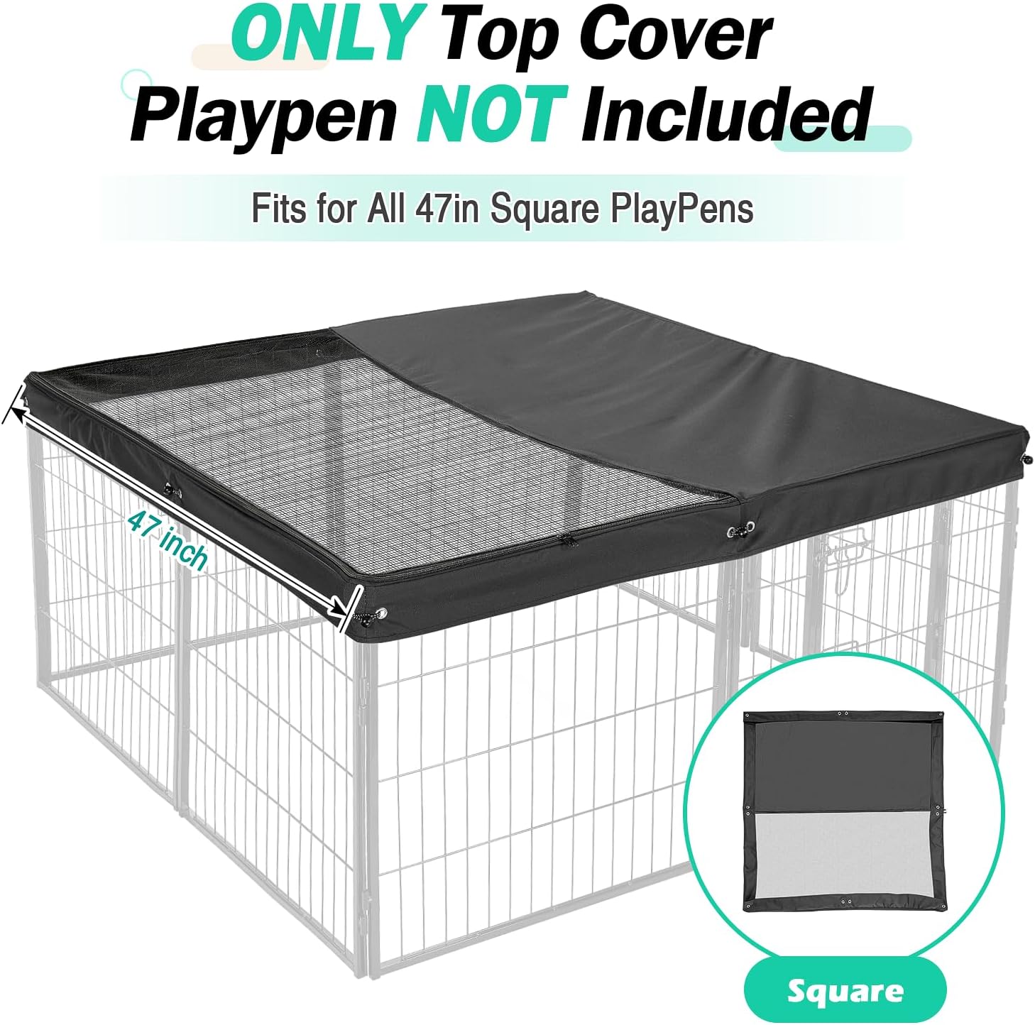 About this item Only Top Cover, PLAYPEN NOT INCLUDED! Universal Playpen Cover for Pets - Fits all square pens with 4 panels (47-inch width each) or 8 panels (24-inch width each), designed to match standard square configurations. Sun-Resistant - Colewin cover for dog playpen offers partial shade to protect puppies from harsh sun, creating a cool outdoor retreat for pets. Half Mesh Structure - Our play pen cover combines cloth and mesh to enhance airflow. Unzip the top netting to switch between a cozy den and an adventurous playground. Escape-Proof - The play pen cover for dogs attaches securely to the pen frame with 8 ball bungee cords. Narrow gaps between fasteners prevent escape, keeping pets safely enclosed. Excellent Material - Made of 500D Oxford fabric and half plastic mesh, this dog playpen top cover resists scratches and pulls without tearing. Simply rinse or hand wash to clean. › See more product details