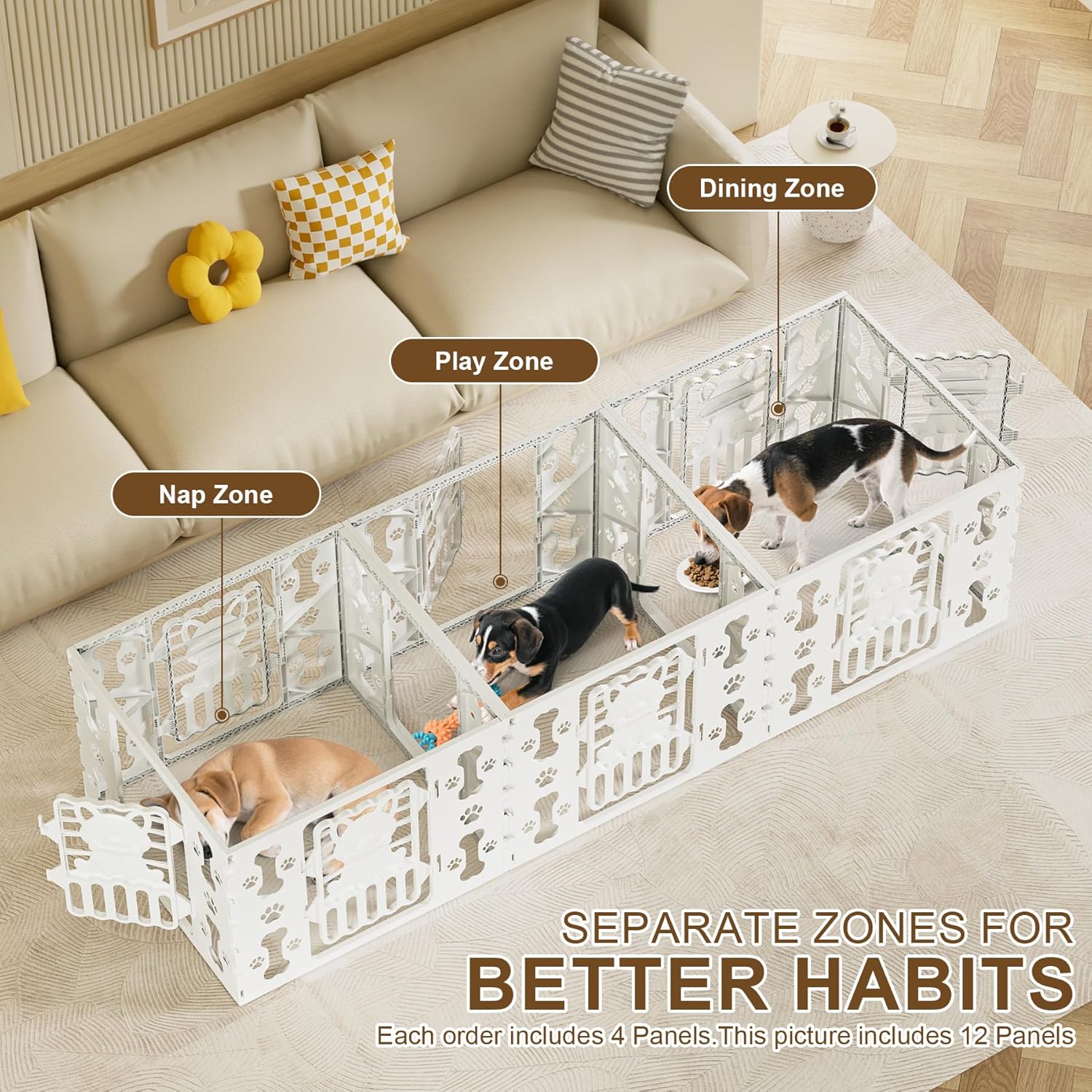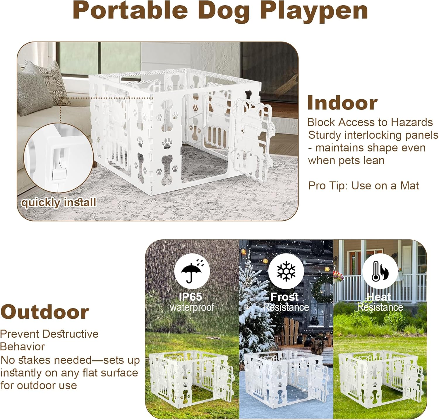About this item Durable, Safe & Easy-Clean: This portable dog pen, as a reliable small dog playpen, is crafted from high-quality, non-toxic plastic with a smooth, burr-free finish and ventilated panels for optimal airflow. It's built to last both indoors and out, and a quick wipe-down is all it takes to keep clean Versatile for Every Occasion: Create a cozy "den" in your living room, a sunny retreat on the patio, or a secure travel small dog cage for camping and trips. This lightweight yet sturdy dog crates for small dogs sets up in minutes, providing a familiar and safe "home away from home" for your pet in these play pens for puppys, wherever you go Easy to Install: This 4-panel pet playpen, a perfect playpen for dogs indoor small, is designed for quick and easy setup. Simply snap the panels into place, and within minutes, the dog playpen will be ready for use. The secure interlocking panels create a stable and robust structure, while the included door features a pet-proof safety lock for your peace of mind Dimensions: This puppy playpen indoor, also ideal as puppy crates for small dogs, provides 8.5 sq ft of play space (Assembled: 35"L x 35"W x 26"H). It is perfect for small breeds between about 10 and 30 pounds, like Chihuahuas, Dachshunds, and Pugs. Give your pet room to relax and play More than a small dog playpen, it's a training aid and a safe haven. Simplify potty training by confining accidents to one area. Create a designated "quiet zone" for your pet when you're working, hosting, or need to step out. It’s the secret to a cleaner, calmer, and more organized life with your furry friend › See more product details