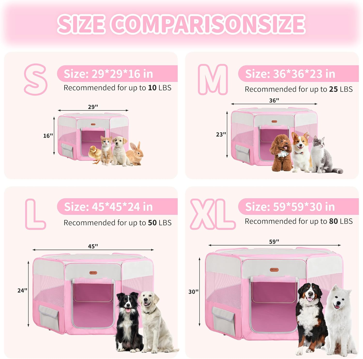 About this item Dimensions - The size of this kitten playpen indoor is 45 inches diameter with a height of 24 inches. Spacious interior give more fun for your pets. Including a dog pen indoor and a storage bag in the package. PLEASE measure your pets before purchasing to ensure a right indoor dog pen. Comfort and Security - The kitten playpen indoor ensure comfort and security, provide a safe enclosed space for cats kittens and rabbits to lounging and playing. The light mesh window all-around and half-mesh top delivers great airflow, as well visibility for anxious pets. Superior Designn - Roomy 8 Panel design dog kennel indoor with protected seams and reinforced corners. Durable water-resistant 600D Oxford fabric makes the cleaning easier. Removable zippered half-mesh top and door with velcro provide convenient and security, and side pockets from the outside provide a handy place for personal items etc. Covenient to Use - It takes seconds to open the dog play pen indoors from folded storage bag, no assembly required. And also easy to folds back flat when not in use for carrying and storing. Our lightweight portable pet playpen can be used indoors, outdoors, traveling, camping, etc. Covenient and Fun - Enclosure indoor dog pen, spacious interior give your pet more room to sleep and play. Breathable all-around mesh window design makes your pet comfortable. Our cat tent available in multiple sizes and colors. Please feel free to contact Customer Service if you have issues with quality or damage due to shipping. › See more product details