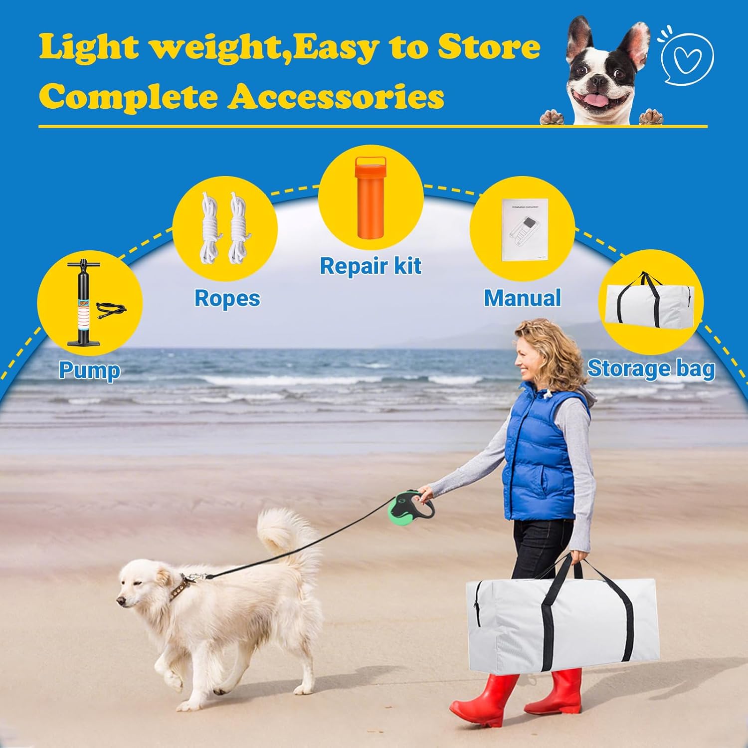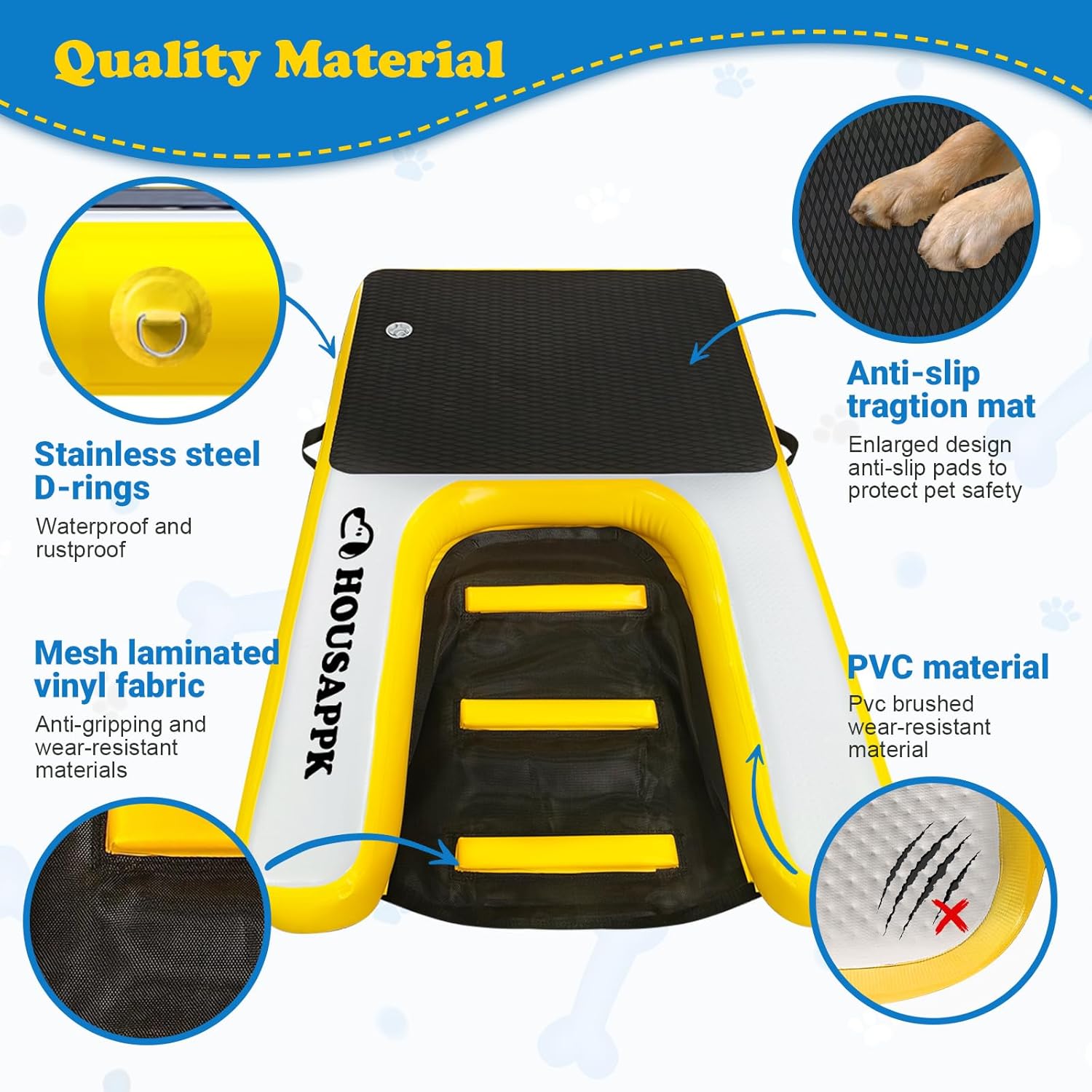 About this item WEIGHTED FLOATING RAMP:dog boat ramp steps feature an underwater sloped weighted net that creates safe inflatable water ramp, creating quick entry point for swimming. The 3D step design can fully wrap the dog paws, making it non-slip and more stable HEIGHT PLATFORM: dog ramp for boat includes three 3D step that can be used for multiple purposes.Includes an oversized platform measuring 59 x 35.4 x 6 inches,Provides a generous space for dog to rest DURABLE MATERIAL: Mesh laminated vinyl fabric provides this floating dock puppy ramp with high wear, tear and slip resistance. dog boat ladder PVC resists punctures and increases durability.provides extra grip and comfort EASY TO PORTABLE & ACCESSORIES: dog pool ramp comes with a hand pump(Quick inflation in 2-4 minutes), a repair kit, ropes, a carry bag and a pet toy,easy to inflate, deflate, fold and store in included bag, perfect for tight storage spaces SUITABLE FOR VARIOUS SCENES:helping dogs with water activities, learning to swim or float in the water, suitable for boats, pools, docks, lakes, beaches. Features multiple heavy-duty D-rings to withstand heavy towing HIGH VISIBILITY: The yellow exterior provides better visibility for dogs and helps them find their way in and out of the water and direction. › See more product details