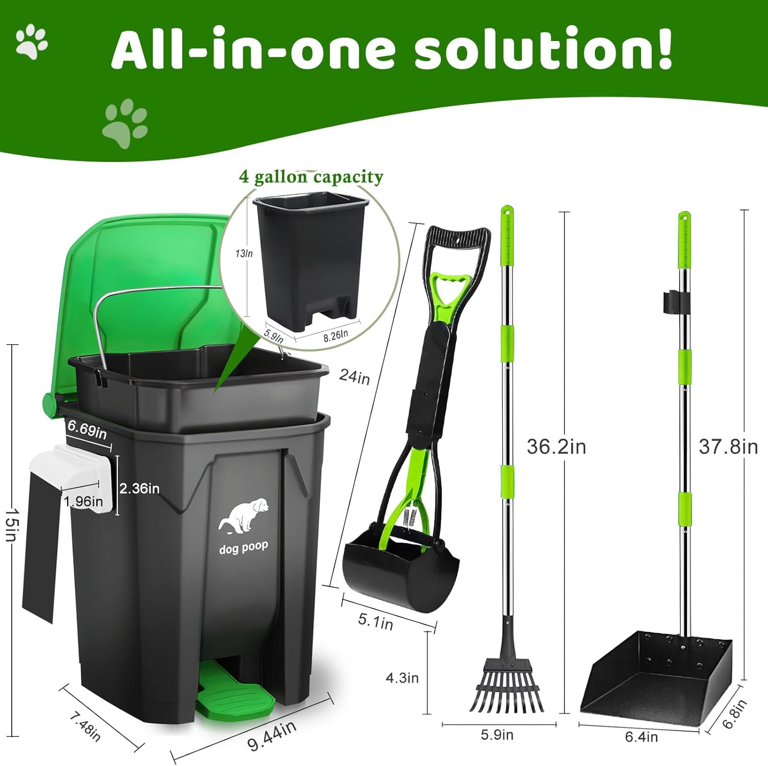 - Size: Green Trash Can with Rake & Pooper Scooper