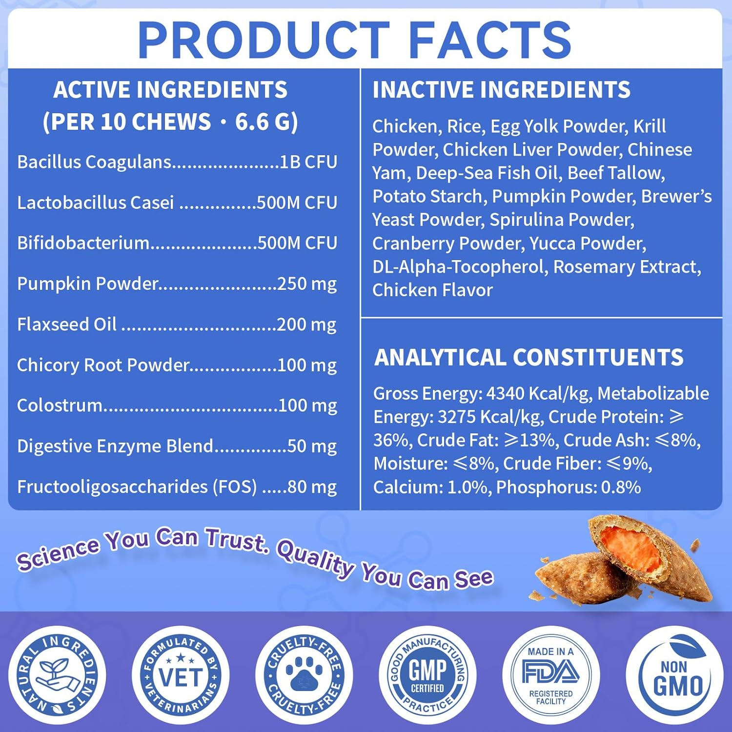 About this item Sensitive Stomach Support · Krill Core + Chicken Flavor: Formulated for all breeds and ages, these dog probiotic chews are especially gentle for dogs with sensitive stomachs. With triple probiotics + dual prebiotics (FOS & chicory root) + pumpkin + digestive enzymes, the formula helps ease occasional diarrhea, constipation, and gas. Each WEALLIN probiotic chews for dogs has a crispy shell with a krill-infused core and savory chicken flavor — easy to digest and loved by picky eaters. Flexible Feeding · Treat-Like Experience: WEALLIN’s small, crispy probiotics chews for dogs are designed to be given in multiple pieces per day (about 1 chew per 4 lbs of body weight). This small-piece format makes care more precise and gentler for sensitive dogs, while also working perfectly as training rewards or bonding treats. Digestive support becomes a natural, enjoyable part of your dog’s daily routine. Digestive Balance & Daily Vitality: Packed with Lactobacillus casei, Bifidobacterium, Bacillus coagulans, plus FOS, chicory root, pumpkin, digestive enzymes, and colostrum, these dog probiotic for gut health support nutrient absorption, balance gut flora, and strengthen immune defenses. Consistent daily use helps dogs stay comfortable, energetic, and thriving. Skin & Coat Nourishment: With flaxseed oil rich in Omega-3, these pet probiotics for dogs go beyond digestive care to nourish skin and coat. WEALLIN dog probiotics chews help reduce shedding, ease dryness, and promote a soft, shiny appearance — visible wellness from the inside out. Flexible Nutrition for Different Dogs and Households: Suitable for a wide range of dogs, this mini-chew format offers gentle digestion for small breeds, a flavor and krill-filled center that appeals to picky eaters, and smaller, spread-out portions that support sensitive stomachs. It aligns especially well with the daily intake needs of medium dogs (20–50 lbs), while larger breeds naturally go through more each day due to their higher nutritional demands. Its flexible portioning also makes it ideal for multi-dog homes, allowing one product to fit smoothly into different dogs’ routines. 500 Chews · Long-Term & Multi-Dog Friendly: Each jar contains 500 tasty probiotic chews for dogs, ideal for long-term daily use or multi-dog households. Gentle, tasty, and reliable, WEALLIN probiotic chews for dogs turns sensitive stomach support into sustainable, treat-like care that pet parents can trust. › See more product details