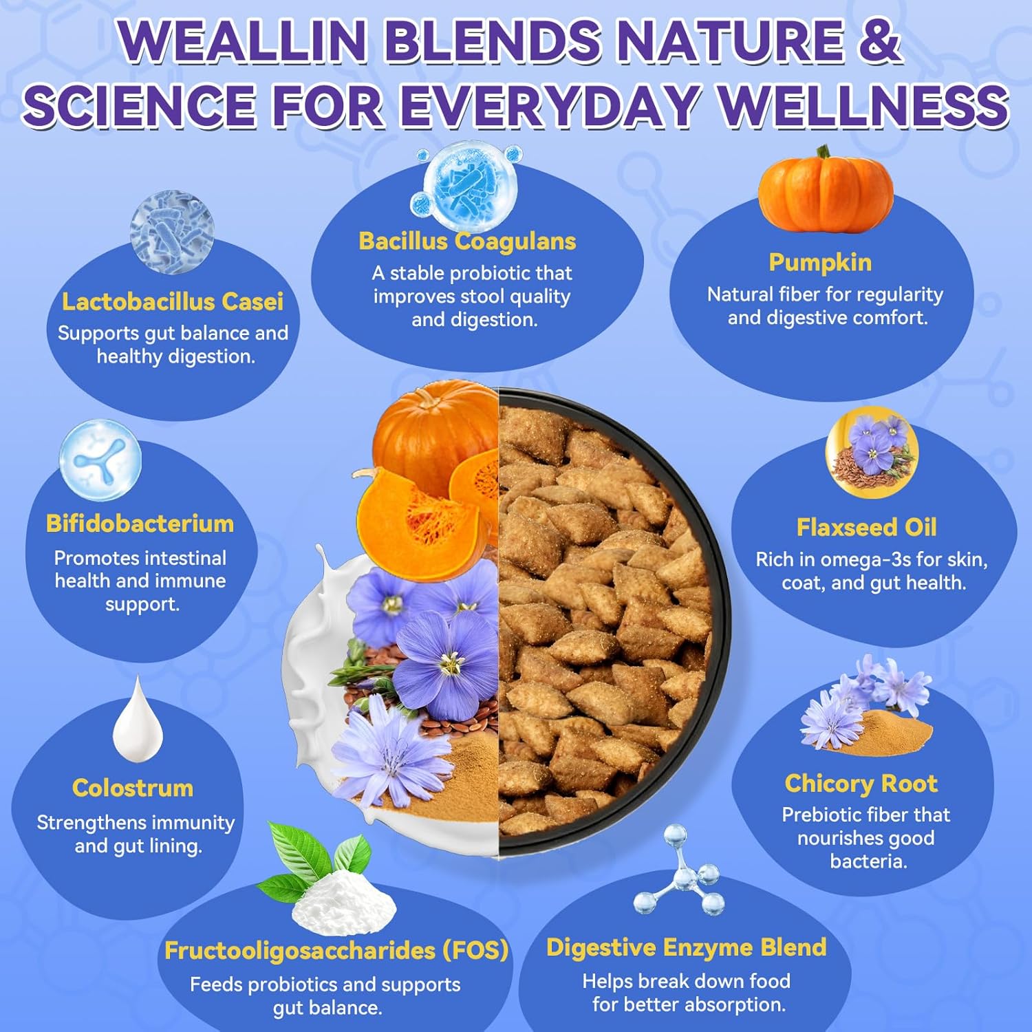 - Active Ingredients: Lactobacillus casei, Bifidobacterium, Bacillus coagulans, Pumpkin, Flaxseed Oil, Chicory Root, Colostrum, Digestive Enzyme Blend, Fructooligosaccharides (FOS)See more