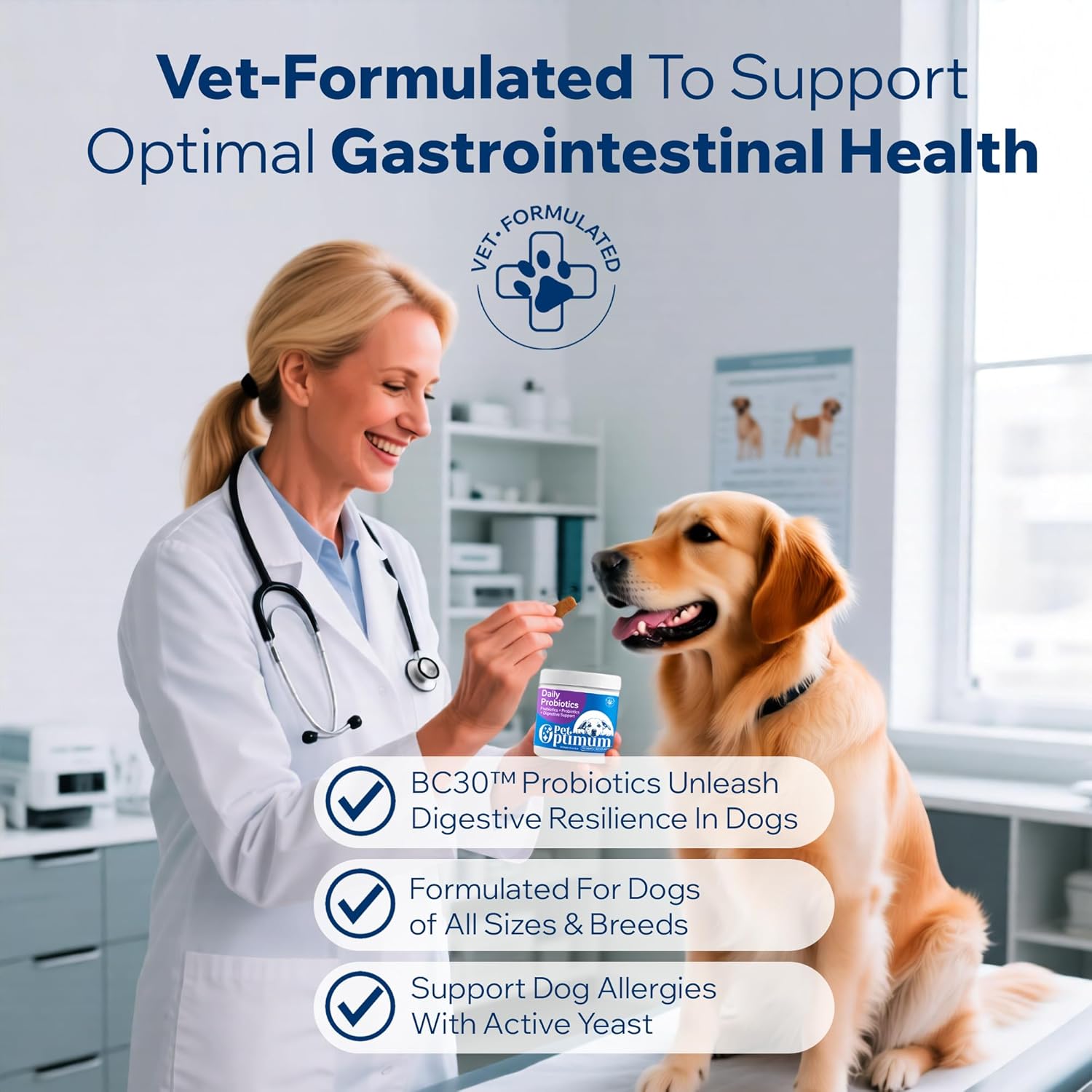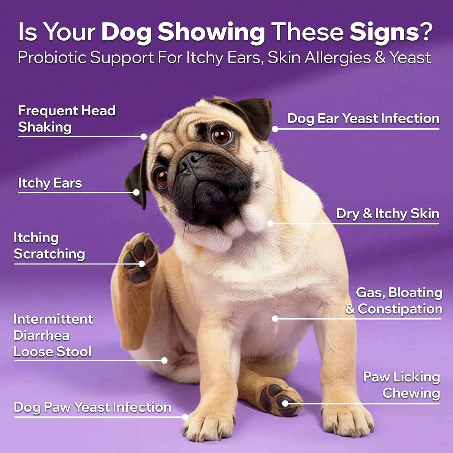 About this item DOG ALLERGY ITCH RELIEF: Is your dog constantly paw licking, scratching, or has itchy ears? These dog allergy relief chews support yeast balance in your dog's skin & ears—including yeast-related itchy ears and paw licking caused by internal microbiome imbalance—and soothe allergy-related discomfort by promoting a healthy gut & immune system DOG GUT HEALTH PROBIOTICS: PetOptimum’s premium dog probiotics are vet-formulated with prebiotics (FOS) and digestive enzymes to promote a balanced gut microflora, improve nutrient absorption, support digestive and immune health, maintain bowel regularity, and naturally discourage the growth of bad bacteria DOG PROBIOTICS FOR DIGESTIVE HEALTH: With 120 million CFUs of Bacillus coagulans, each tasty probiotic chew combines probiotics and prebiotic fiber to support gut and digestive health, helping ease occasional diarrhea, gas, constipation, bloating, bad breath, and itching caused by gut imbalance DAILY IMMUNE SUPPORT: Give your dog the daily support they need to stay active, happy, and comfortable. These premium probiotics for dogs promote a healthy balance of good bacteria in the gut microbiome to support digestive health and strengthen natural defenses against allergens and environmental stressors SOFT CHEWS & PROBIOTIC DOG TREATS: Tired of forcing pills or hiding medicine in your dog’s food? These duck-flavored prebiotics and probiotics supplements for dogs are easy to chew and gentle on teeth and gums. Perfect for dogs of all ages, including seniors and picky eaters, they help support yeast balance, ear health, and immune function VET-FORMULATED & MADE IN THE USA: All PetOptimum products are formulated by veterinarians and manufactured in an FDA-registered, NASC-, NSF-, and GMP-certified facility in the USA. These premium probiotics for dogs contain no synthetic colors, palm oil, soy, corn, or artificial flavors—only clean, wholesome ingredients. Each batch is rigorously tested for quality, safety, & efficacy to protect your dog’s health and well-being › See more product details