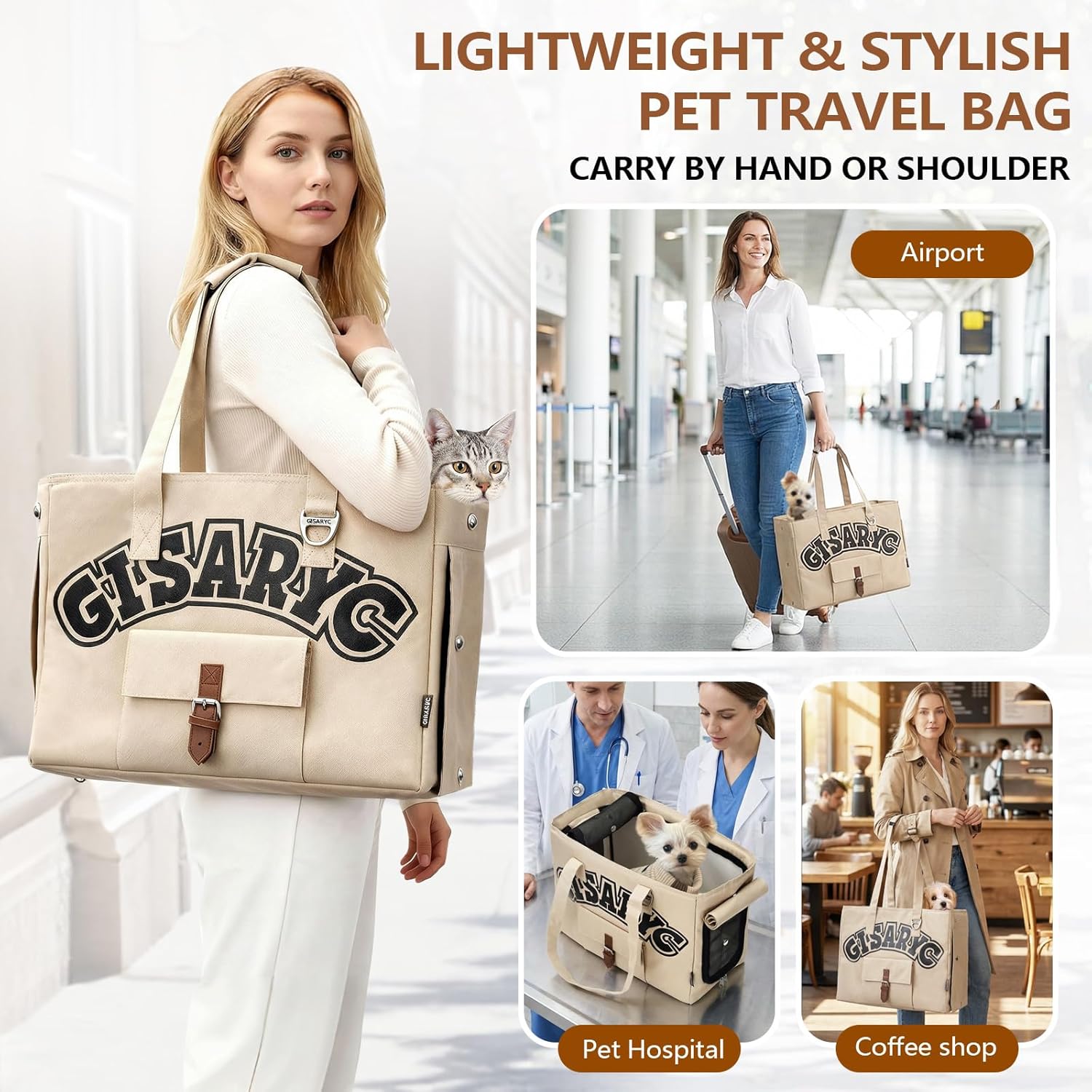 About this item Suitable Size: This pet travel carrier measures 15.7" L × 7.9" W × 11.4" H and is ideal for small pets up to 15 lbs, including small dogs, cats, puppies, kittens, and rabbits. Please do not choose your carrier based on weight alone; we recommend measuring your pet’s length (neck to tail base) and height (floor to shoulder) to ensure a comfortable and proper fit Comfort & Breathability: High-density breathable mesh on three sides with roll-up cover flaps allows you to adjust airflow, warmth, and privacy as needed. Perfect for cats that get nervous or shy in unfamiliar settings. The top-vented design meets most airline under-seat requirements, making it easy to carry for flights or daily outings. Please check with your airline before travel to ensure a smooth trip Safety & Stability: Anti-escape double zipper lock keeps pets secure inside. Built-in safety leash stops jumping out. Reinforced base gives stable support for dogs and is removable for easy cleaning. Made with durable, scratch-resistant Oxford fabric outside and smooth, water-resistant lining inside for easy cleaning and long-lasting use, ensuring a safe and comfortable travel experience Stylish & Refined: This pet carrier is not just a dog carrier tote, but a chic and compact everyday travel bag. Lightweight for hand-carry or shoulder use, it looks like a regular tote when the cover flap is down, keeping your pet discreet and elegant. Suitable for travel, shopping, flights, or trips to the vet Portable Storage: This foldable dog carrier is easy to carry and store. The thickened handle feels comfortable, and the padded shoulder strap reduces pressure for effortless travel. Comes with a stylish hook for hanging a collapsible bowl or small items. Front and back pockets offer ample space for your phone, keys, and other daily essentials, ensuring a worry-free outing with your pet › See more product details