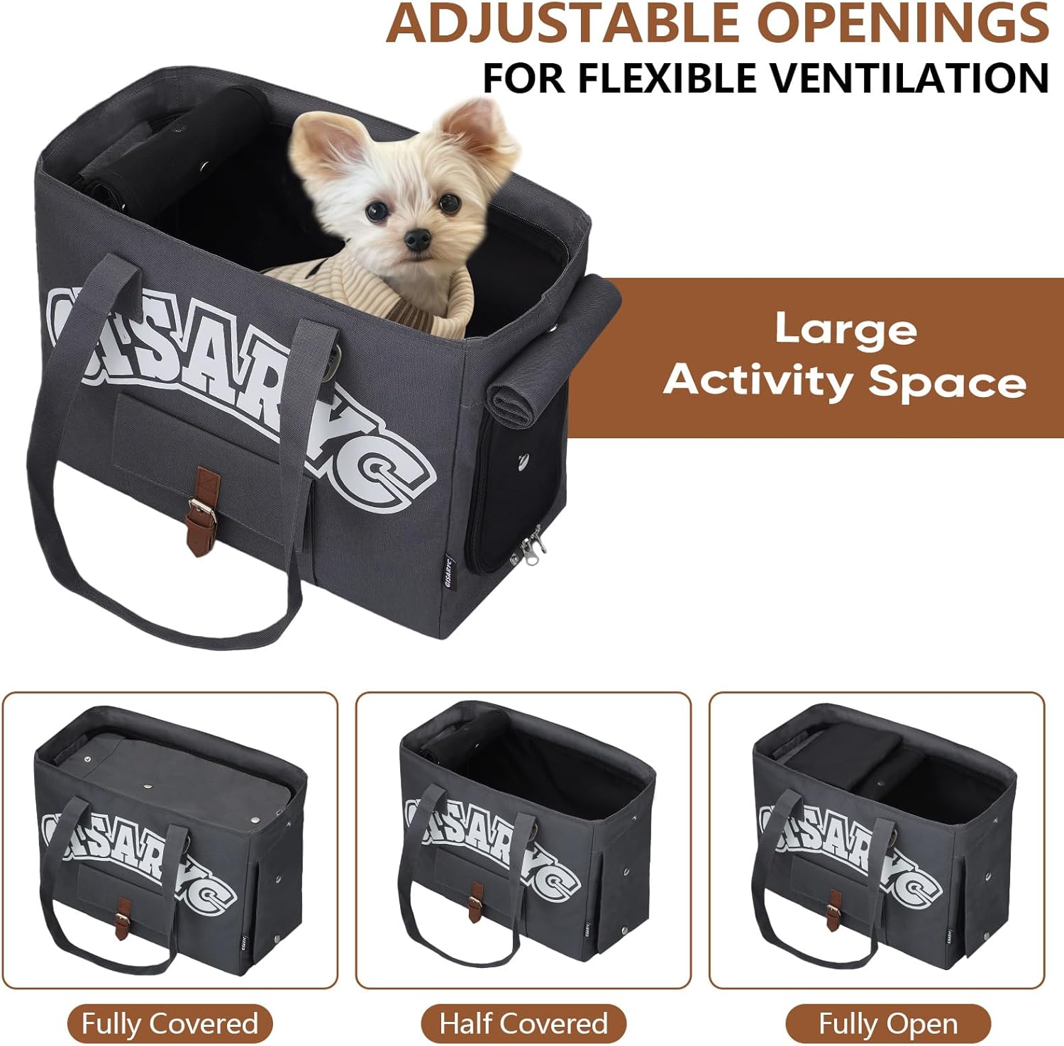 About this item Suitable Size: This pet travel carrier measures 15.7" L × 7.9" W × 11.4" H and is ideal for small pets up to 15 lbs, including small dogs, cats, puppies, kittens, and rabbits. Please do not choose your carrier based on weight alone; we recommend measuring your pet’s length (neck to tail base) and height (floor to shoulder) to ensure a comfortable and proper fit Comfort & Breathability: High-density breathable mesh on three sides with roll-up cover flaps allows you to adjust airflow, warmth, and privacy as needed. Perfect for cats that get nervous or shy in unfamiliar settings. The top-vented design meets most airline under-seat requirements, making it easy to carry for flights or daily outings. Please check with your airline before travel to ensure a smooth trip Safety & Stability: Anti-escape double zipper lock keeps pets secure inside. Built-in safety leash stops jumping out. Reinforced base gives stable support for dogs and is removable for easy cleaning. Made with durable, scratch-resistant Oxford fabric outside and smooth, water-resistant lining inside for easy cleaning and long-lasting use, ensuring a safe and comfortable travel experience Stylish & Refined: This pet carrier is not just a dog carrier tote, but a chic and compact everyday travel bag. Lightweight for hand-carry or shoulder use, it looks like a regular tote when the cover flap is down, keeping your pet discreet and elegant. Suitable for travel, shopping, flights, or trips to the vet Portable Storage: This foldable dog carrier is easy to carry and store. The thickened handle feels comfortable, and the padded shoulder strap reduces pressure for effortless travel. Comes with a stylish hook for hanging a collapsible bowl or small items. Front and back pockets offer ample space for your phone, keys, and other daily essentials, ensuring a worry-free outing with your pet › See more product details