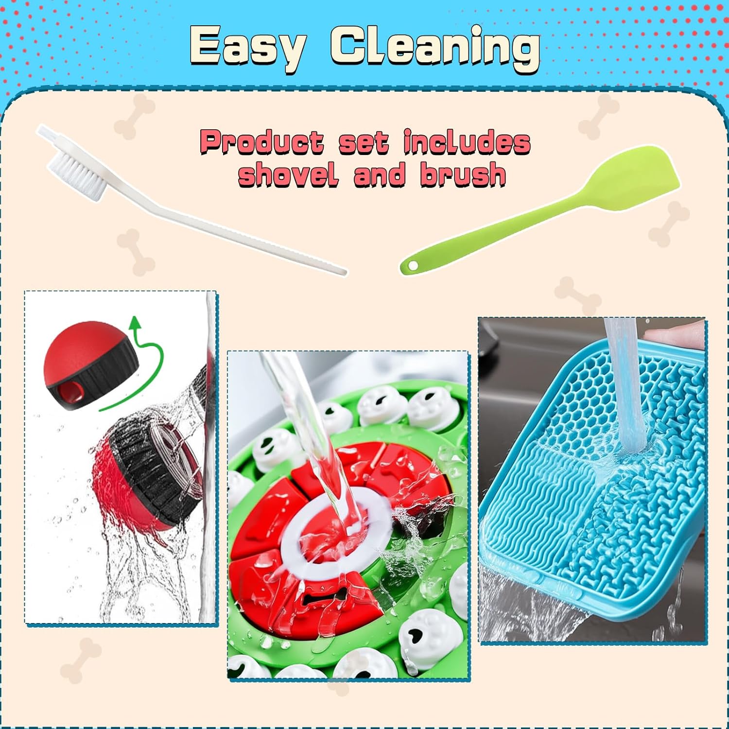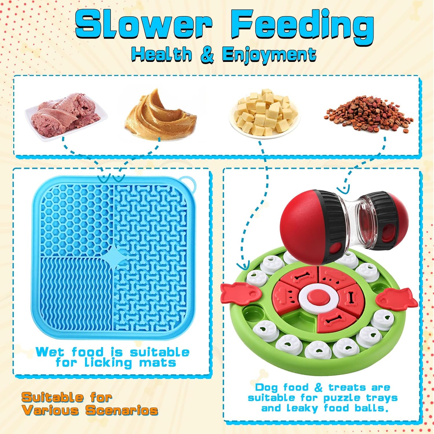 🎉 Advanced 5-in-1 Slow Feeder Set: Get everything you need for a happier, healthier dog! This enrichment set includes a dog lick mat, food dispenser toy, puzzle ball, silicone spatula, and brush – all designed to promote slow eating, enhanced IQ, and mental engagement. 🐶 Combat Boredom & Anxiety: Our unique dog puzzle feeder set turns mealtime into a fun, stimulating challenge. It helps keep your dog occupied, reduces separation anxiety, and encourages natural curiosity, making it perfect for puppies. 🐕 Transform Mealtime into Playtime: Slow feeding time from 6 minutes up to 60 minutes! The dispenser ball promotes active play, interactive games deepen your connection, and the lick mat not only slows eating but also supports better digestion. ❤️ Simple Setup & Hassle-Free Cleaning: Just add your dog's favorite dry treats (like jerky) to the toys for engaging play and eating. We provide a silicone spatula for easy spread of peanut butter on the lick mat, plus a brush for quick cleanup. 👍 Built to Last with Pet-Safe Materials: Our dog enrichment toys and treat dispenser ball are crafted from tough, claw-resistant ABS. The lick mat is made from natural, eco-friendly rubber. Rest assured, all materials are safe and healthy for your pet. › See more product details