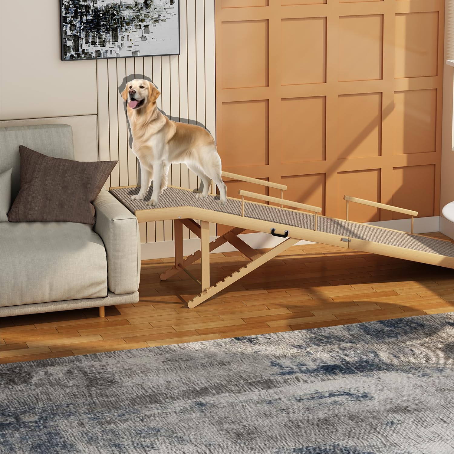 About this item 【Gentle Slope with 8 Adjustable Heights (20.01"–28.35")】Thoughtfully designed with a gentle incline to reduce pressure on joints, making it ideal for small, senior, or injured pets. With 8 adjustable height levels from 20.01" to 28.35", this ramp easily fits beds, couches, cars, and more. Recommended by veterinarians for breeds prone to "IVDD"—such as Dachshunds, Corgis, and French Bulldogs—it offers a safer, more comfortable alternative to stairs or jumping. 【Extra-Wide 17.72" Ramp for Senior Dogs】Designed with an extra-wide 17.72" surface, this ramp provides ample walking space, making it perfect for elderly dogs or those with mobility issues. Pets can confidently move up and down without feeling cramped. 【220 lbs Support with Triangular Stability Design】Supports up to 220 lbs with a triangular stability design and a solid wood frame. Each ramp undergoes rigorous factory testing to ensure secure weight support without any wobbling, providing peace of mind for elderly dogs or pets with mobility issues. 【Advanced Anti-Slip Design & Secure Support】The ramp features a textured sisal-style surface to prevent slipping. Anti-slip points are placed every 3 inches along the ramp, helping pets maintain stable footing as they climb. Quick-install removable safety rails and reinforced construction provide added safety and reliable support. 【 Portable Foldable Design for Easy Storage】Folds down to a compact 35.83" × 17.72" × 5" size, allowing you to tuck it under sofas, beds, or keep it in your car trunk. Ideal for home use, travel, vet visits, and vacations. 【Friendly Companionship 】Our dog ramp for bed comes with a 3-Year Factory-Services, If you encounter any issues with the dog ramps , please give us a-call. Our customer-service team will help you within 12 hours. › See more product details
