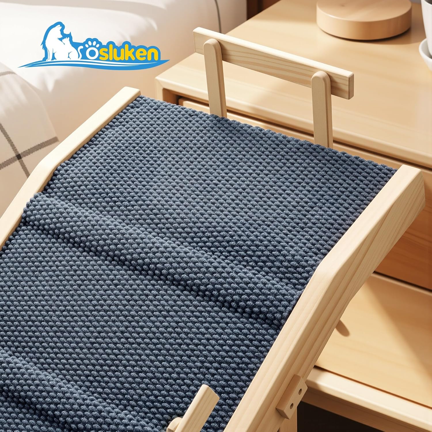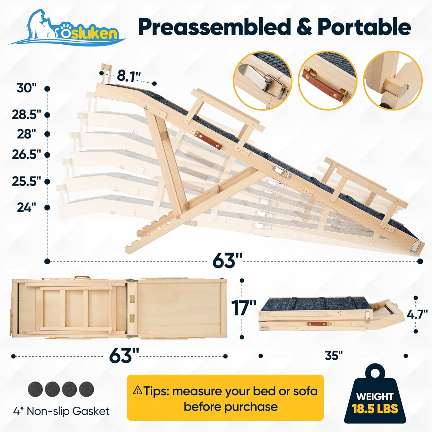 About this item ✨【Upgraded 63" Long for 24"-30" High Beds 】 : the 63" Extended dog ramp for bed with rails are designed with a utility landing platform for your tall bed , car or SUV, leaving no gaps. This ensures your furry-friend feels secure and confident when going up and down, Say goodbye to worries about them leaping onto the bed couch or car and potentially hurting their legs. 🪜【 6 Height Adjustment 】 : the dog ramp with rails for high beds offer adjustable heights, include 24”, 25.5”, 26.5”, 28”, 28.5”, 30”, it accommodates various bed, sofa, vehicle, and SUV heights. let your dogs comfortably accessing their favorite resting spot. 🌳【 220lbs Max Load & Safety】 : the pet ramp with rails for bed supports up to 220lbs, constructed with a sturdy frame made of solid thick wood, featuring a triangular structure design, and equipped with stainless steel fastening screws, ensuring stability and the ability to stand independently without relying on furniture. The pet ramp suitable for small dogs, small cats, medium-sized dogs, and large dogs. ✅【 Foldable & Portable Design】: The 63”x 17” portable dog ramps with railing folded up is 35”x 17”, making it convenient for carrying and storage without taking up space. It can be easily placed in the bedroom, under the bed, under the sofa, or in any corner of the home, and can even be stored in the car trunk, providing you with the most convenient user experience. ✨【 Non-Slip Heavy-Duty Carpet 】: the dog ramp with rails for small dogs features a non-slip design with a heavy-duty textured carpeted surface, ensuring high traction. The surface is equipped with 6 raised strips, providing stronger grip and effectively protecting your dog's knee joints and paws, preventing injuries. 📞【Friendly Companionship 】: Our dog ramp for bed with rails comes with a 3-Year Factory-Services, If you encounter any issues with the dog ramps with railing , please give us a-call. Our customer-service team will help you within 12 hours. › See more product details