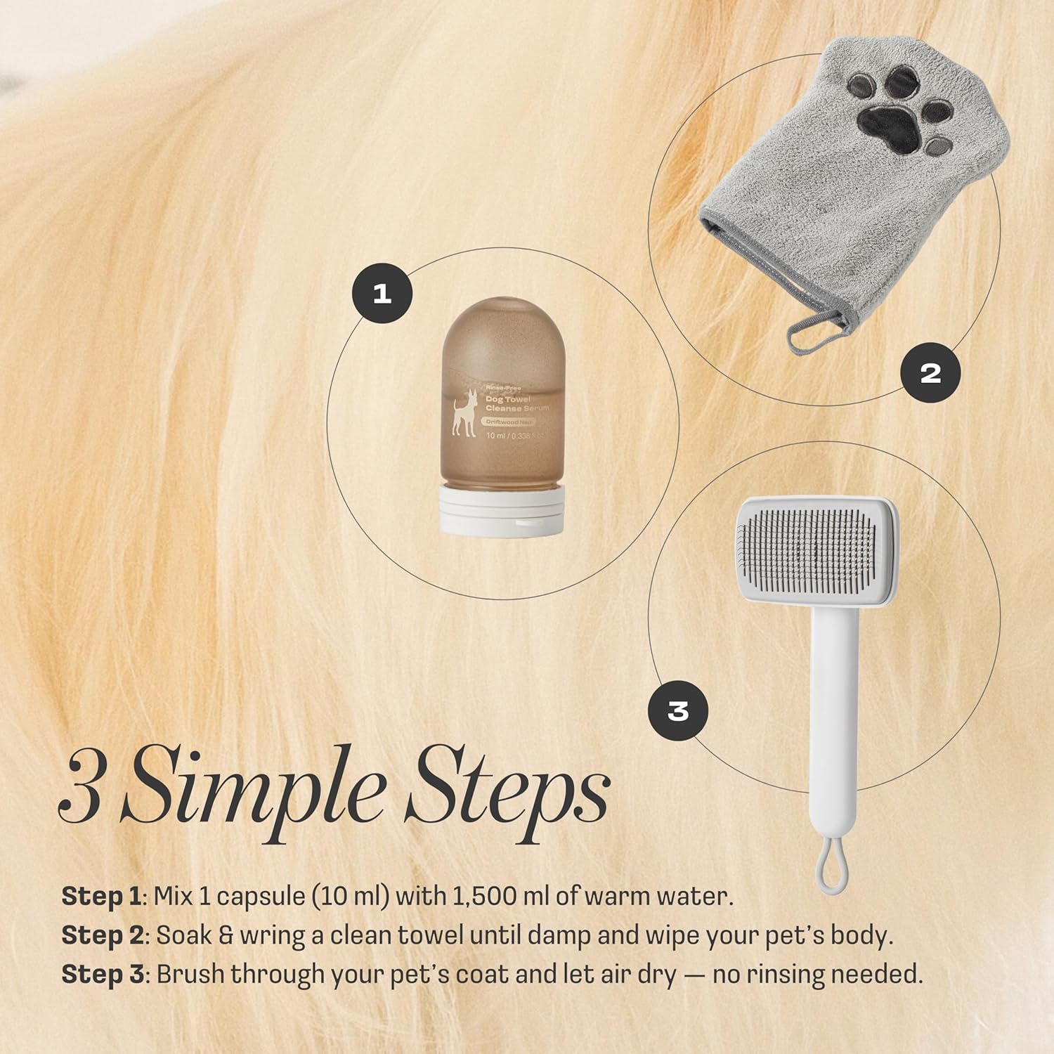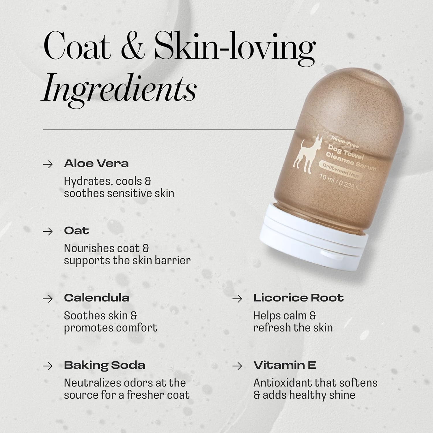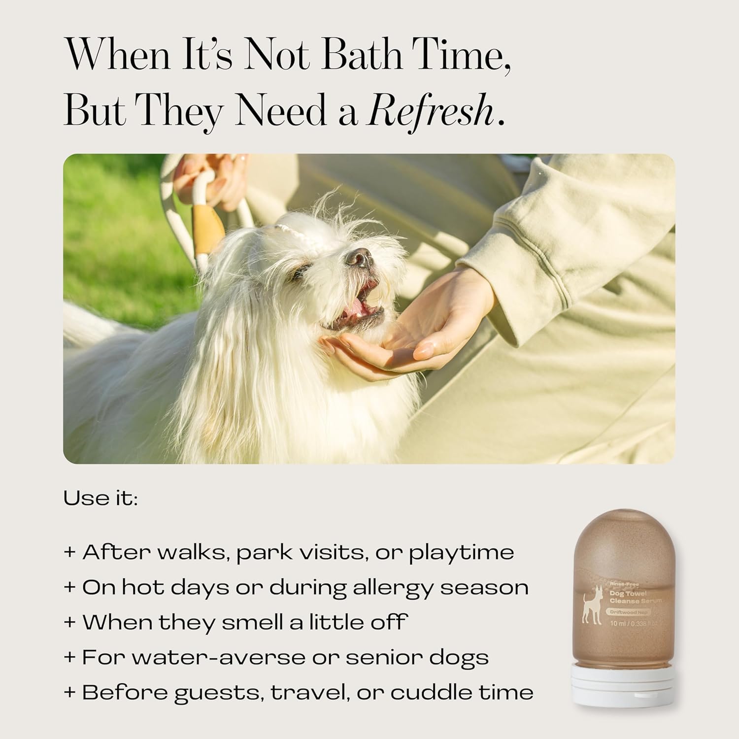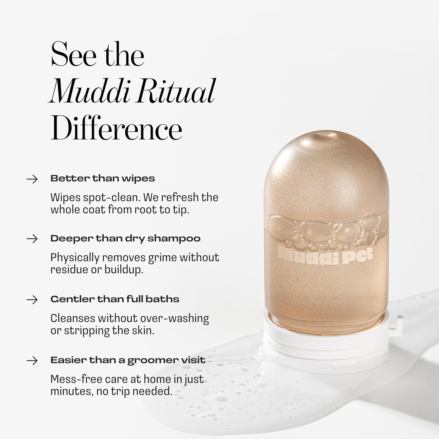 About this item Rinse-Free Dog Dry Shampoo & Conditioner: A 98.65% naturally derived waterless dog shampoo serum designed for in-between baths. Acts as a dog dry shampoo and conditioner to gently cleanse, hydrate, deodorize and refresh without rinsing. Ideal for sensitive skin, itchy pups, senior dogs, and dogs who dislike traditional bathing. Skin-Soothing Botanicals for Sensitive Dogs: Formulated with oat extract, aloe vera, calendula, licorice root, baking soda, vitamin E, and other gentle botanicals to calm irritation, hydrate the coat, help neutralize odor, and support a healthy skin barrier. A safer, gentler alternative to harsh dog deodorizing spray or foaming dry shampoos. Includes Premium Muddi Mitt Grooming Towel Glove: Bundle includes our reusable, double-sided dog grooming mitt / towel glove engineered to lift dirt and evenly distribute the serum. Acts like a reusable pet wipe with deeper cleansing power than disposable wipes, and is machine-washable for long-term use. Quick, Low-Stress Towel Cleanse Ritual: Perfect for in-between baths, rainy days, muddy paws, post-walk cleanups, long-hair breeds, grooming-shy dogs, and senior dogs. This no-rinse towel-cleanse method helps reduce bath stress, leaving the coat soft, refreshed, and deodorized in minutes. No tub. No water. No mess. Gentle Formula for Sensitive or Allergy-Prone Dogs: Free from parabens, sulfates, artificial fragrance, alcohol, and harsh detergents that disrupt the skin. Safe for puppies, adults, and senior dogs needing a waterless dog shampoo, no-rinse dog wash, or fast, calming groom between full baths. › See more product details