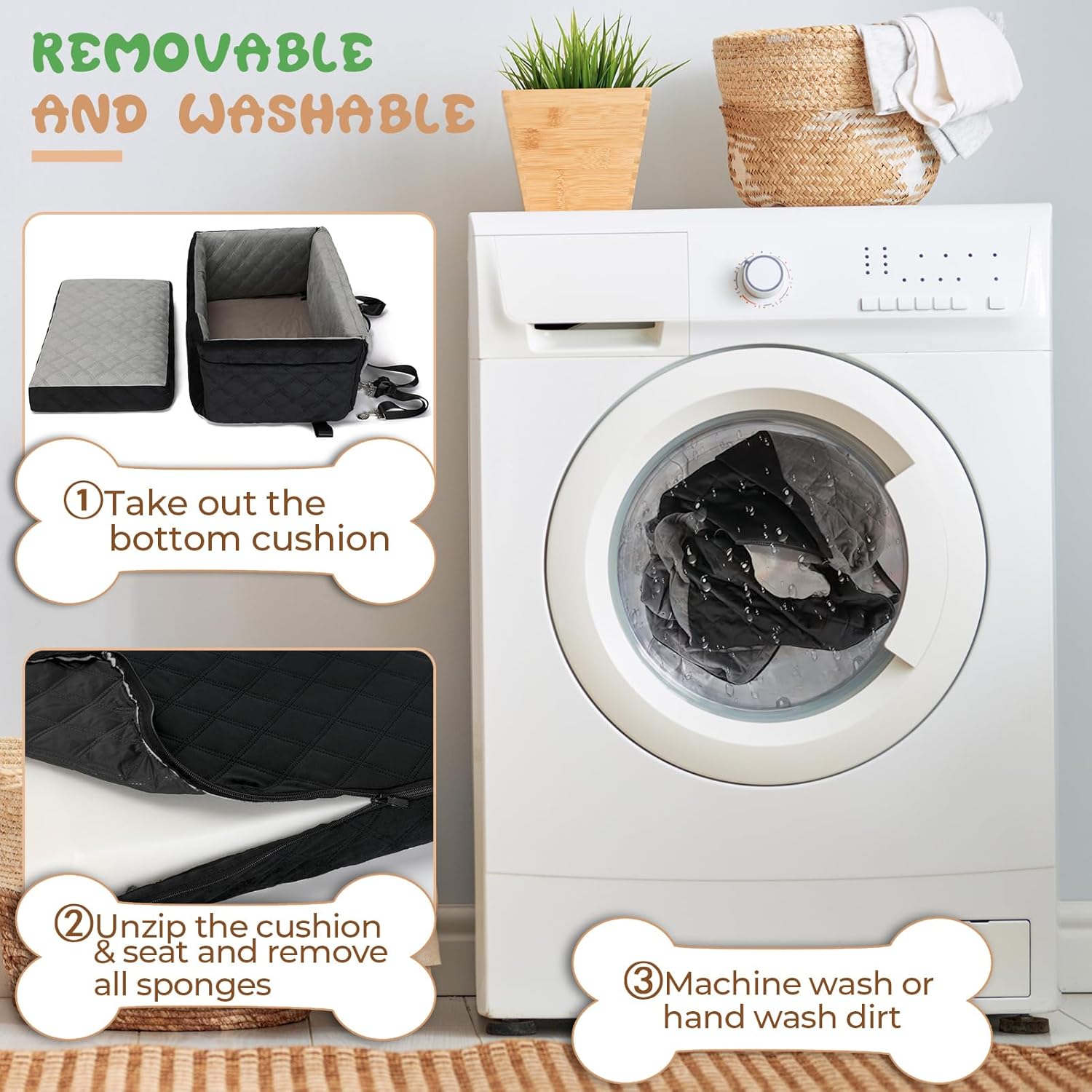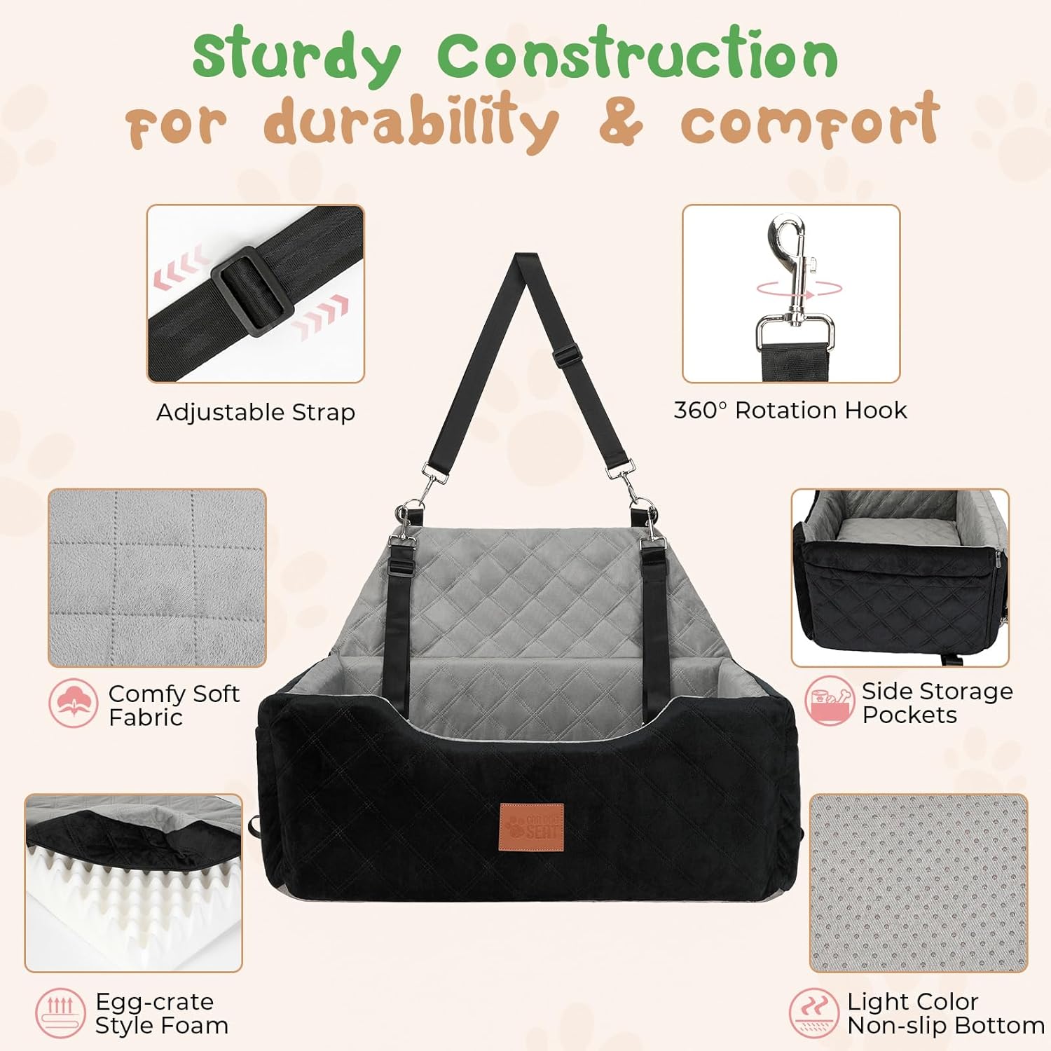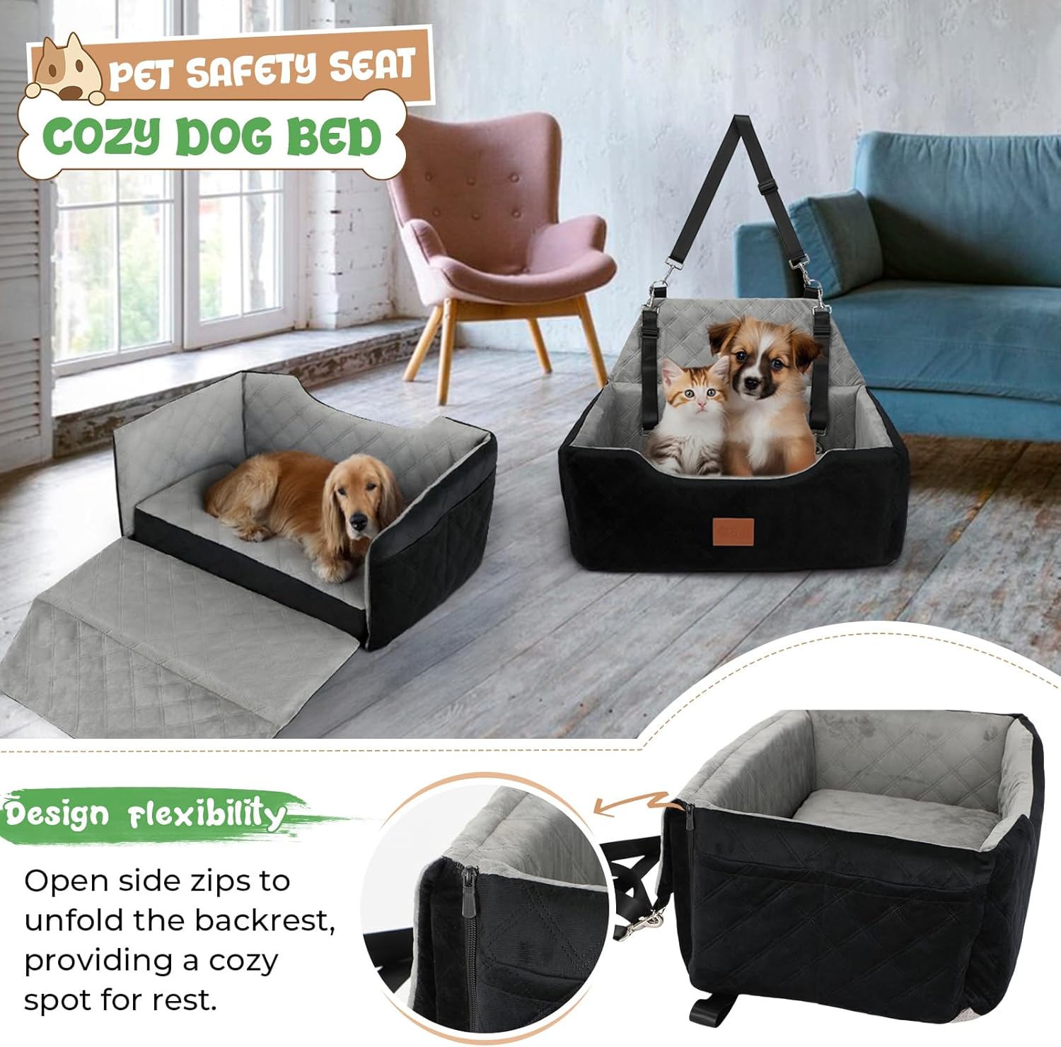 About this item Seat Size>> 29.5"L x 20"W x 10.5"H. Dog car seat fits large/medium dogs under 55 lbs or 2 small pets. Large pockets on both sides for storing dog-specific items. The outer fabric inevitably attracts pet hair, please understand Safety & Stability>> Seat belt and headrest adjustment straps keep the dog seat in place. Built-in safety harness keeps furry passenger within range, reduce the disturbance of pets in the car, and improve driving safety Durability & Comfort>> Anti-slip bottom uses light-colored dye, which stabilizes the seat without staining your white/light car seats. The interior is padded with foam all around, and the bottom-mounted memory foam cushion can boost dog & provid comfort Multi Functional>> Designed to be versatile, making it a great fit for various settings beyond just the car. For example, this large dog seat could be used at house , in a hotel, or outdoors, providing a cozy resting spot for your furry baby Warm Tips>> Car dog beds only fit in the backseat of a sedan/SUV, or in the trunk as it's too wide. The cover of the dog seat can be easily removed & washed. For installation issues, please refer to the video for details: How to assemble a pet car seat › See more product details