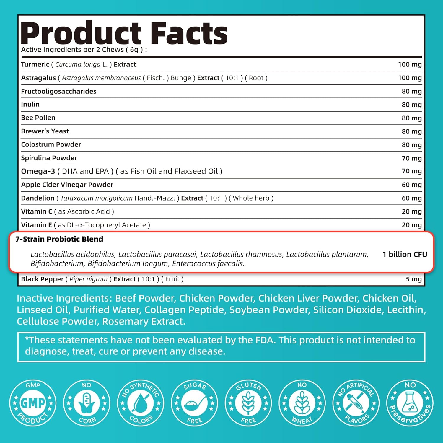 - Active Ingredients: Turmeric (Curcuma longa L.) Extract 100 mg Astragalus (Astragalus membranaceus (Fisch.) Bunge) Extract (101) (Root) 100 mg Fructooligosaccharides 80 mg Inulin 80 mg Bee Pollen 80 mg Brewer's Yeast 80 mg Colostrum Powder 80 mg Spirulina Powder 70 mg Omega-3 (DHA and EPA) (as Fish Oil and Flaxseed Oil) 70 mg Apple Cider Vinegar Powder 60 mg Dandelion (Taraxacum mongolicum Hand.-Mazz.) Extract (101) (Whole herb) 60 mg Vitamin C (as Ascorbic Acid) 20 mg Vitamin E (as DL-Ξ±-Tocopheryl Acetate) 20 mg 7-Strain Probiotic Blend Lactobacillus acidophilus, Lactobacillus paracasei, Lactobacillus rhamnosus, Lactobacillus plantarum, Bifidobacterium, Bifidobacterium longum, Enterococcus faecalis. 1 billion CFU Black Pepper (Piper nigrum) Extract (101) (Fruit) 5 mgSee more