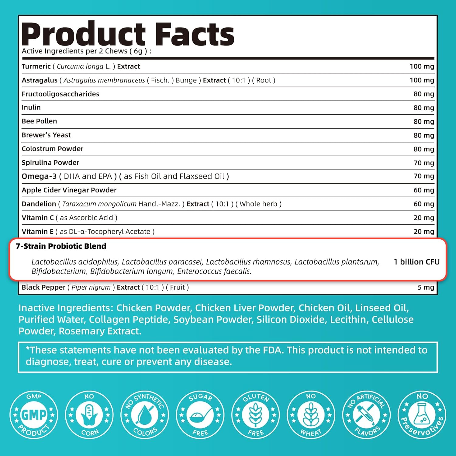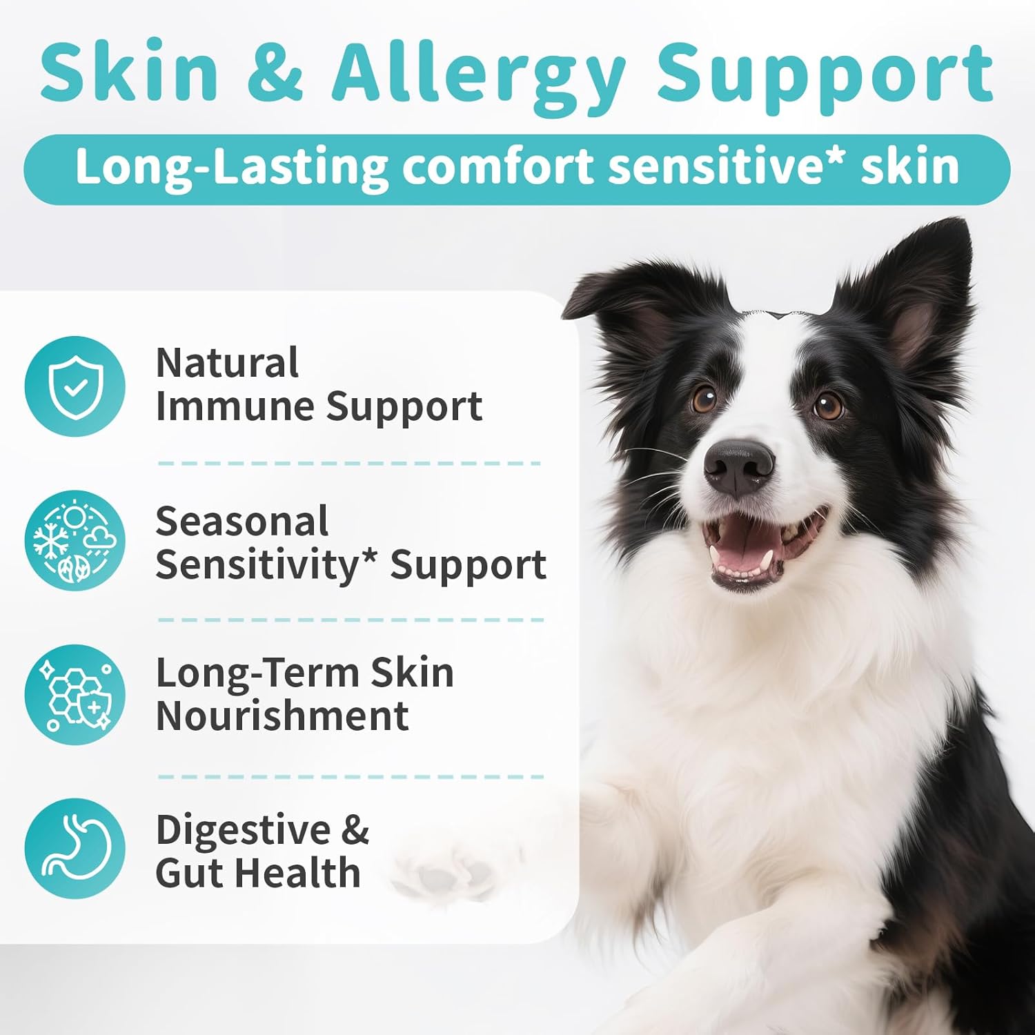 About this item Natural Immune Support: Our dog allergy chews are formulated with a powerful blend of colostrum and astragalus. These advanced dog allergy supplements provide robust support for your dog's immune system. The addition of turmeric and omega-3 rich fish & flaxseed oil helps your dog maintain a response health to seasonal and environmental sensitivities Seasonal Skin Sensitivity Support: Our dog allergy relief products are designed to promote* long-lasting comfort for dogs with sensitive skin. And dog skin care supplement contains a potent combination of turmeric, bee pollen, and dandelion root to soothe skin-related issues associated with seasonal allergies. This blend helps to maintain normal skin health and comfort Digestive & Gut Health Support: Gut health is essential for overall well-being. Our chews include a robust probiotic for dogs, featuring a 7-strain blend at 1 billion CFU. These dog probiotics, along with prebiotics FOS and Inulin, for the gut microbiome. Also included apple cider vinegar for normal digestion and nutrient absorption, making this an ideal dog probiotic choice Formulated for Better Absorption: For the utility of every ingredient, our dog seasonal allergy chews include black pepper extract (Piperine). This key ingredient is included to support the normal absorption of nutrients like turmeric, ensuring your dog can fully utilize the potent ingredients in our formula Quality Products & Exceptional Service: Our dog probiotics chews are proudly made in a GMP-compliant facility. These probiotics for dogs are rich in natural herbal ingredients. Natural and gentle, suitable for daily immune support for dogs of all ages. If you have any questions, please contact us in time, and we will serve you wholeheartedly βΊ See more product details