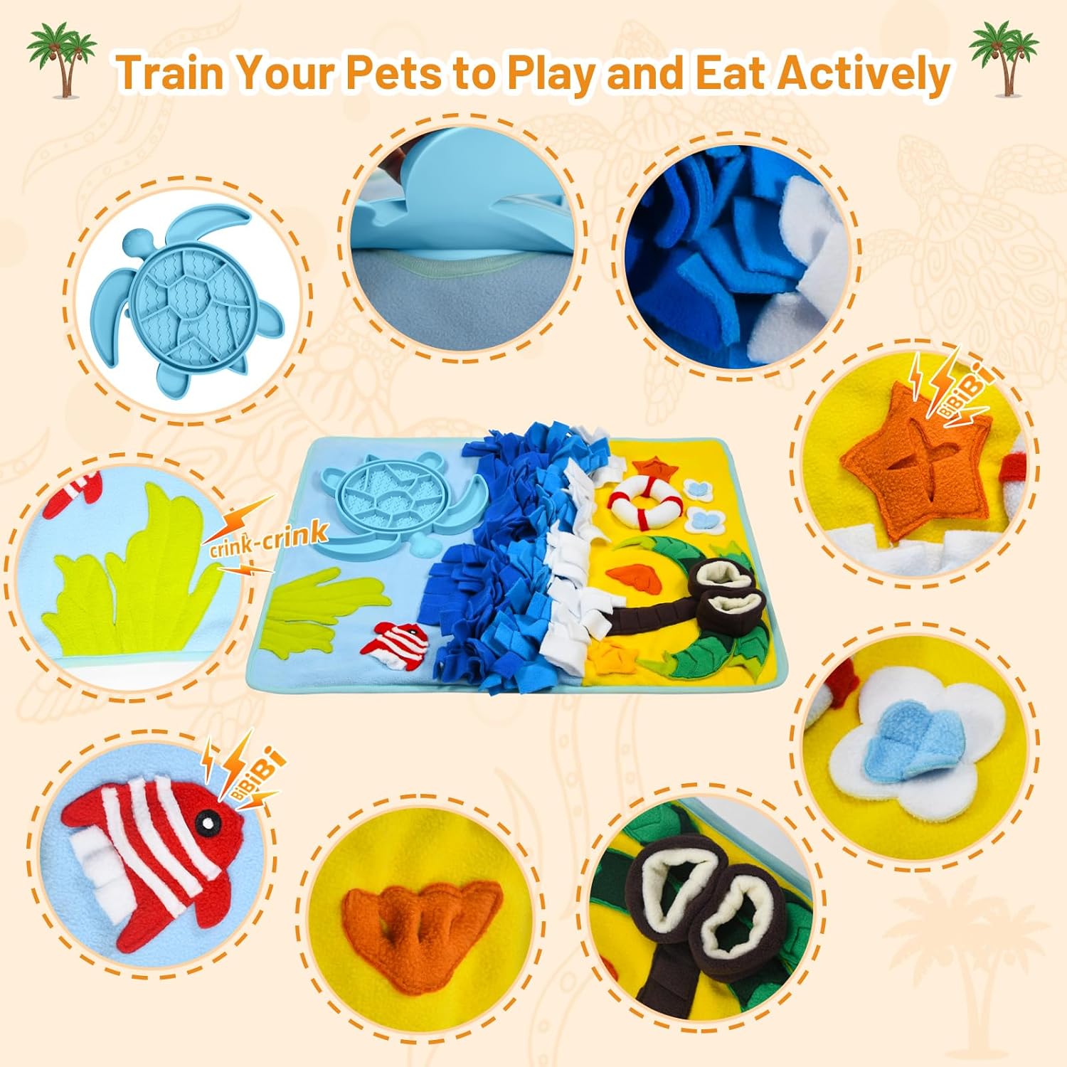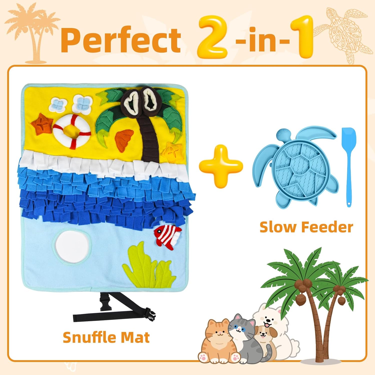 2-in-1 Interactive Dog Puzzle Toy Set: Combine a dog snuffle mat and a slow lick mat in one! Our snuffle mat for dogs encourages natural foraging skills with Various hiding areas to hide food, while the turtle-shaped slow feeder slows down eating. Perfect for small to medium dogs Durable Materials & Food-Safe Silicone: Made of soft, thickened polar fleece and food-grade silicone. The snuffle mat for dogs bottom is non-slip, and the dog slow lick mat features a strong suction to stay in place — both safe for pets’ health and long-lasting Reduce Boredom & Destructive Behavior: Turn mealtime into fun! Interactive elements (crinkly sounds, hidden pockets) keep pets engaged, reducing anxiety and preventing your dogs from chewing furniture. Ideal for solo play or bonding time Easy to Store & Carry: Roll-up design with a strap—compact for storage or travel. Our dog sniff mat measures 25.59''×16.69'', slow lick mat measures 10.63''×9.65''. Great for home, park, or road trips Easy to Clean & Maintain: Our dog enrichment toys is simple to wipe or rinse. The dog sniffing mat can be machine-washed or hand-washed, and the dog licking mat is dishwasher-safe or hand-washed, saving you time › See more product details