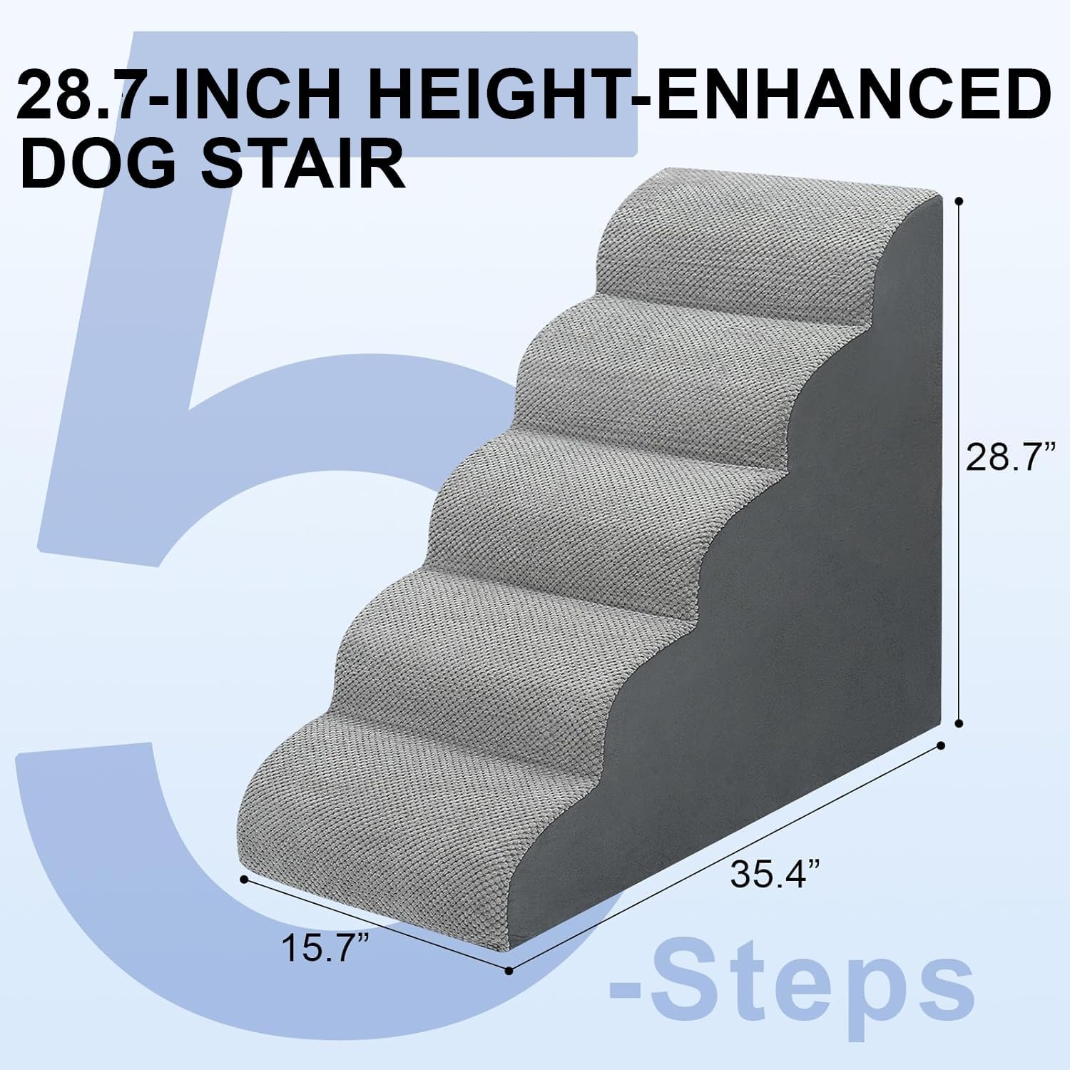 About this item Upgraded Height 28.7"H: The product size is 35.4"L x 15.7"W x28.7H. Our new upgraded and heightened version of the 5-steps dog stairs 28.7"H is higher than other normal 5-steps dog 23"H or 24"H. Easy Climbing Step Curve: Comfortable dog stairs are different from traditional right-angled stairs with a 35-degree curved slope design, which is easier for dogs to climb, while high-density sponge helps to cushion the force of leakage to protect the dog's knees. Suitable for young puppies, short-legged dogs(such as Corgi and Dachshund), injured dogs with limited mobility, and old dogs to get on high bed. Multi-scenario Use:This high-density foam stair is designed in gray, and the simple color is easy to match the sofas, beds, stools, and other scenes in the living room and bedroom. Easy to Assemble and Clean: The foam stairs are stable and not easy to deform, and have good supportability, so there is no need to worry about bumps and protect the safety of pets. The stair cover is made of high-quality non-slip corduroy, removable and machine washable. Special Note: Our slope stairs are vacuum compressed into packaging. After the compressed film is disassembled, The foam will rebound quickly into the shape of a staircase. It usually takes 22-44 hours to fully rebound to the maximum size (depending on the temperature). Suitable for small dogs weighing less than 50 pounds. If you have any difficulty unrolling the sponge, please do not hesitate to contact us 24/7. › See more product details