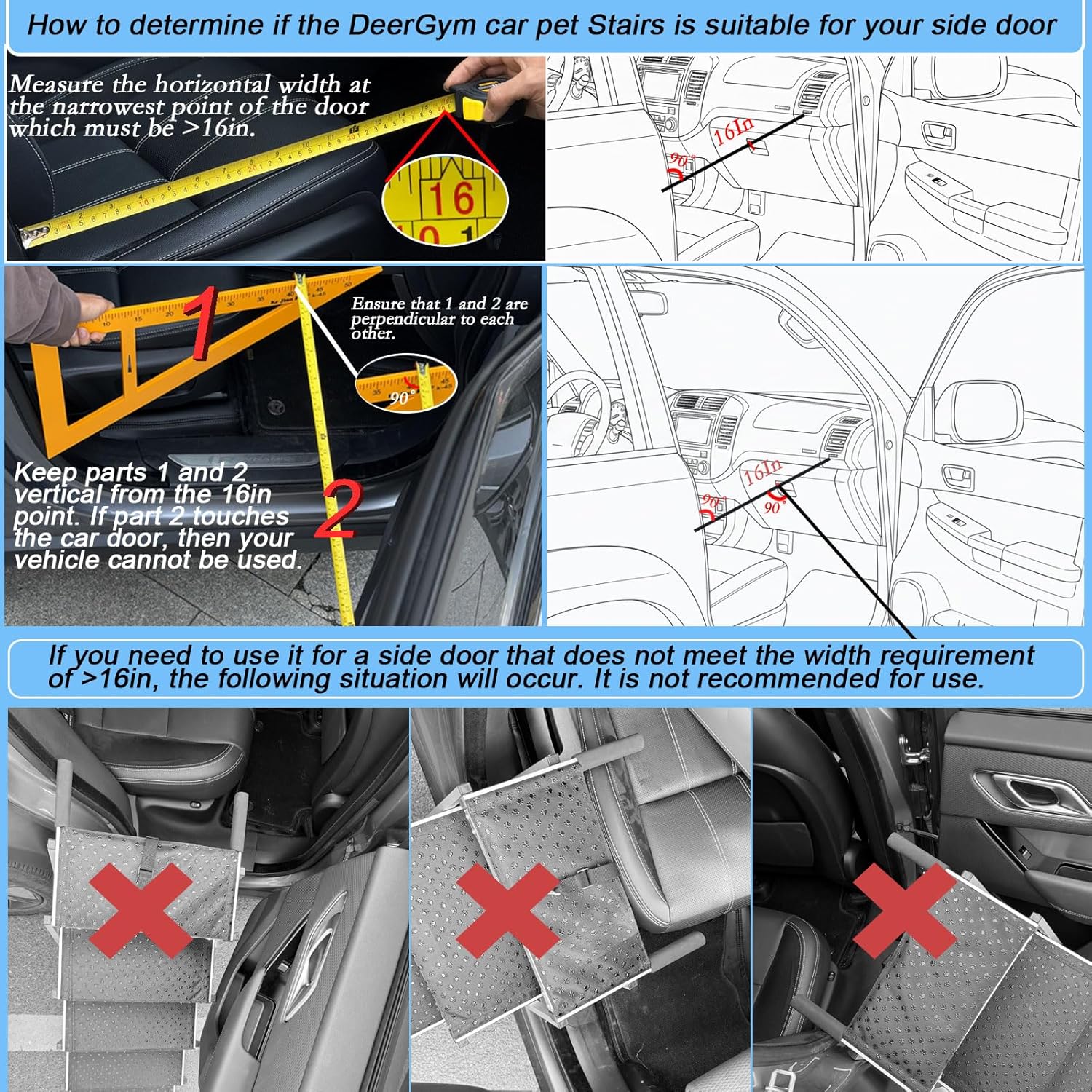 About this item 【Measurement required before purchase】Please measure the height from your vehicle's trunk to the ground before purchasing. If you intend to use the ladder for a side door, please measure the opening width of the door (The side door opening must have a width greater than 16 inches and a vertical height between 28 and 33 inches for proper use.). SUPERIOR DESIGN DOG RAMP FOR CAR: Our Dog Stairs for Large Dogs feature an extra-wide and stable stairway, reducing pressure on your furry friend's legs. Designed to be gentler on joints and prevent injuries, these stairs are ideal for short-legged, elderly, disabled, or injured dogs. ENHANCED DURABILITY AND UPGRADED WEIGHT-BEARING CAPACITY: Each step of the DeerGym Dog Ramp features a rust-resistant aluminum frame with additional load bars for a durable step that can support up to 230 pounds. It's the perfect gift to protect your pet's joints and knees from injury, keeping them safe and comfortable. EASILY FOLDED&EASY TO CARRY: Lightweight at only 13 pounds, these foldable aluminum stairs come with a soft foam handle and a high-quality waterproof Oxford fabric surface of the step for easy transportation. Foldable to a compact 20×17.3×7 inches, they are convenient to store in the car trunk or closet without taking up much space. SAFE, NON-SLIP STEPS: The premium Oxford fabric surface with anti-slip paw prints prevents pets from slipping, while the non-slip rubber pads on the bottom keep the stairs secure even on wet surfaces. The upgraded climbing buckle safety strap ensures the stairs stay in place, providing double protection for your dog. EASY TO USE AND VERSATILE: Our 5-step 16 in wide pet stairs perfectly assist your furry friends in accessing vehicles, beds, sofas, as well as grooming or vet tables. The lightweight design makes these stairs a must-have for travel, picnics, camping, and other family outdoor activities. WORRY-FREE AFTER-SALE SERVICE: DeerGym dog stairs prioritize pet safety and comfort, Contact us with any questions or concerns, and our customer service team will respond within 24 hours to ensure your and your furry friend's journeys are effortless and enjoyable. Order now and make every trip a breeze! › See more product details