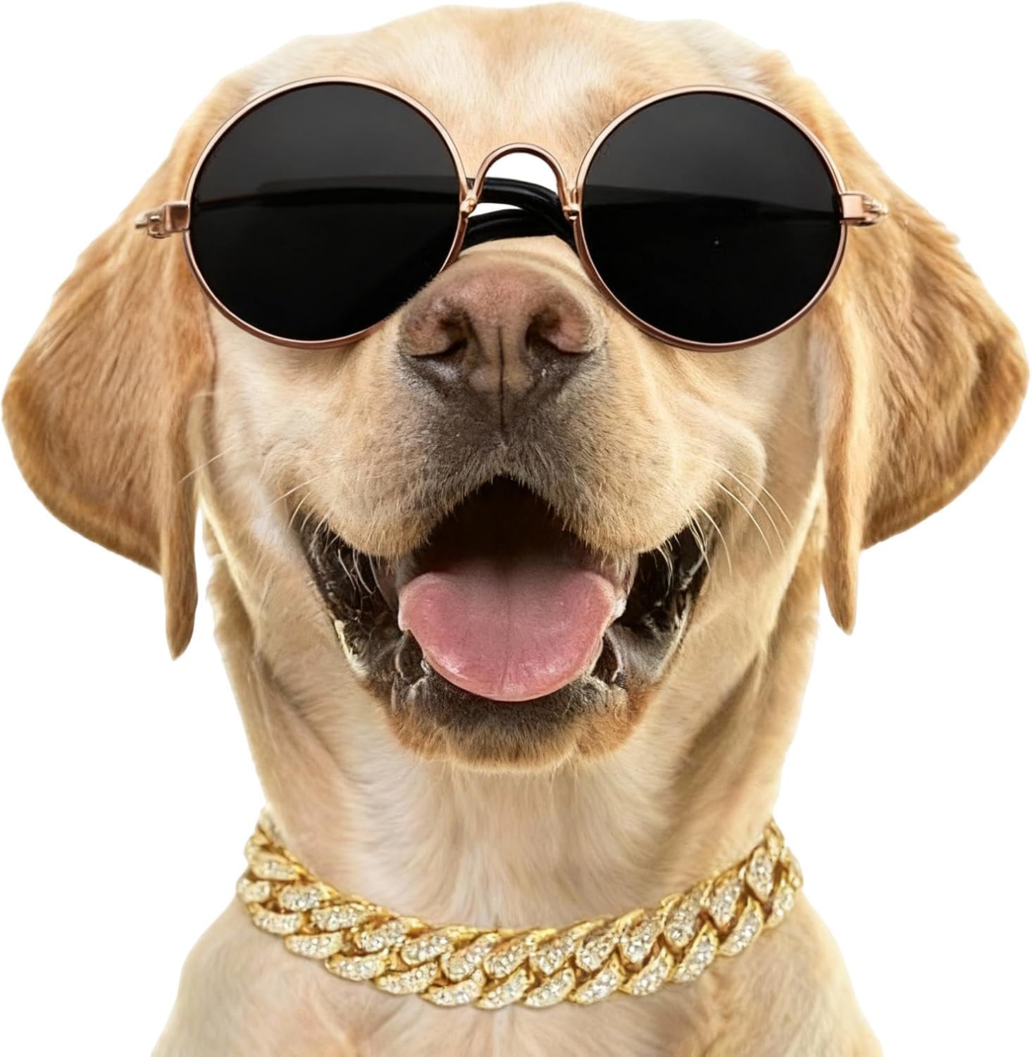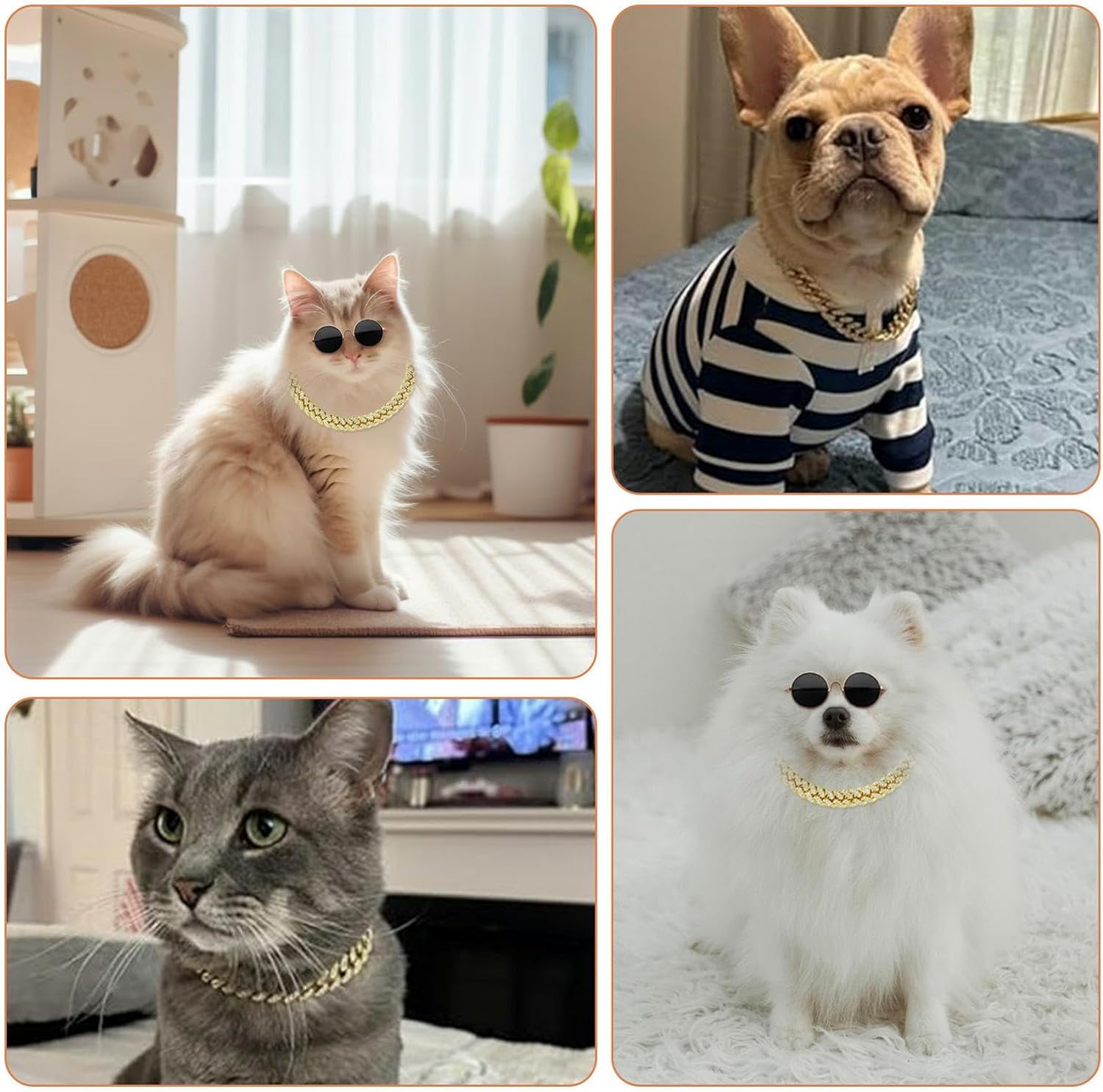 Features:1.Pet sunglasses and cat/dog chains are very cute and fashionable, perfect for taking photos; You can use puppy glasses to match your pets and make them look great, whether it's a family photo or a park walk.2.Vintage pet sunglasses and diamond pet gold chain set are perfect for your cats and small to medium-sized dogs to wear on summer beaches, birthday parties, role-playing, and any other occasion;3.The Golden Chain Cat Collar is suitable for most small and medium-sized pets and can easily match their different clothing styles. It can be used as daily clothing, photo props, and event party performances.Specification:Name:Dog Sunglasses with Rhinestone Chain NecklaceMaterial: Metal, Rhinestone, AlloySize:Sunglasses:10*9*4cm;Rhinestone Diamond Chain Necklace Size Is Dog'S Neck Circumference*Necklace Length*Width: 3xl: 18-19.5inch/45-49cm, 20inch/50cm, 0.49inch/1.25cmColor:GoldenOccasion: Perfect for your cats and small and medium-sized dogs to wear on summer beaches, birthday parties, cosplay and any other occasions;Package Included:1 x Dog Sunglasses1 x Rhinestone Diamond Chain Necklace