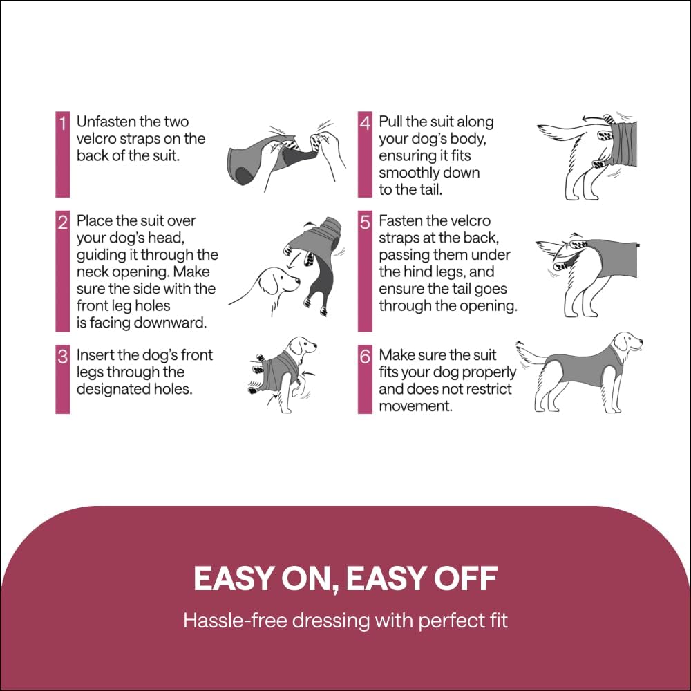 About this item SAFE POST SURGERY RECOVERY FOR DOGS: Our dog recovery suit for surgery provides full coverage after spay or neuter. Protects wounds, stitches, hot spots, and prevents licking or scratching. Acts as a comfortable cone of shame alternative for stress-free healing. SPAY & NEUTER SUIT FOR FEMALE OR MALE DOGS: Designed as a spay recovery suit for female dogs and a neuter recovery suit for male dogs. Works as a surgical onesie for dogs after spayed or neutered, supporting hygienic recovery for all breeds and sizes. BREATHABLE, STRETCHY & COMFY FABRIC: Made with soft cotton-spandex blend, this dog surgical recovery suit allows free movement, sleeping, eating, and playing. Comfortable dog pajamas style body suit prevents anxiety caused by restrictive e collars. ANTI LICK PROTECTION & MULTIPURPOSE USE: This dog body suit protects surgical areas, wounds, hot spots, and skin conditions. Ideal dog onesie for neuter surgery, post surgery dog onesie female, or as dog pants to prevent licking during recovery. EASY TO USE & MACHINE WASHABLE DESIGN: Snap button closure makes this surgery suit for dogs easy to put on and take off. Durable, washable, reusable. Works as a recovery suit for dogs female spay, male neuter, or general surgical recovery suit. › See more product details