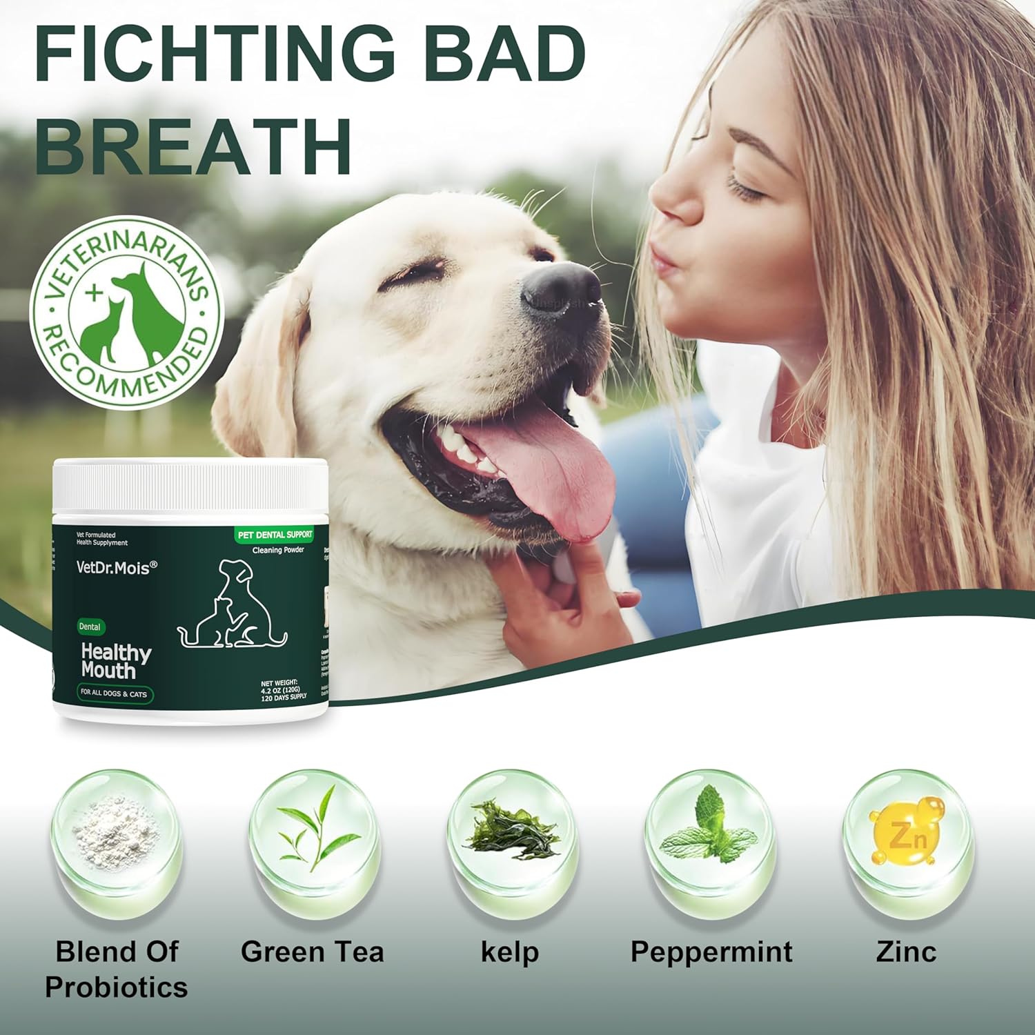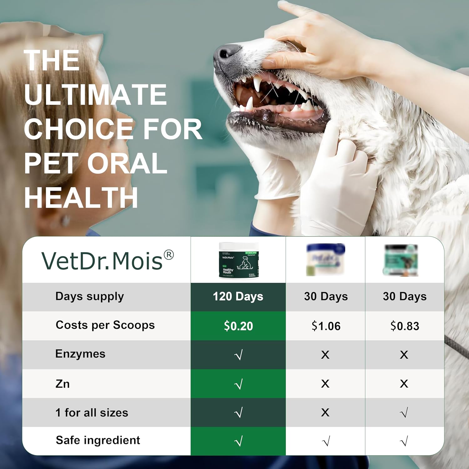 About this item Dogs&Cats Dental Care: Dr.Mois Plaque Removal Dental Powder simplifies pet oral care and solves your pet's resistance to brushing. Just a few spoonfuls a day, easily clean teeth to solve tartar and bad breath problems. Removes Plaque and Bad Breath: Data research, most pets suffer from oral problems. This plaque removing dental powder promotes healthy teeth and gums, removes plaque and tartar, treats bad breath, and improves overall oral health by improving gastrointestinal digestion. Healthy Natural Formula: Natural zeolite powder effectively attracts food debris from your pet's teeth. Combined with natural seaweed and a proprietary probiotic blend that breaks down with saliva, it promotes intestinal digestion, thus keeping your dog's and cats' breath fresh. Easy To Use - Choose the right formula for your Dog's&Cats' size (Small, Medium, Large) and add one scoop using the scoop provided in the tub to their food daily. Tailored To Your Dog&Cats: Suitable for dogs and cats regardless of whether it is due to age, dietary habits or daily accumulated oral problems. This advance in pets dental care enables a hassle-free, thorough clean, leaving their mouth clean, fresh, and sparkling. › See more product details