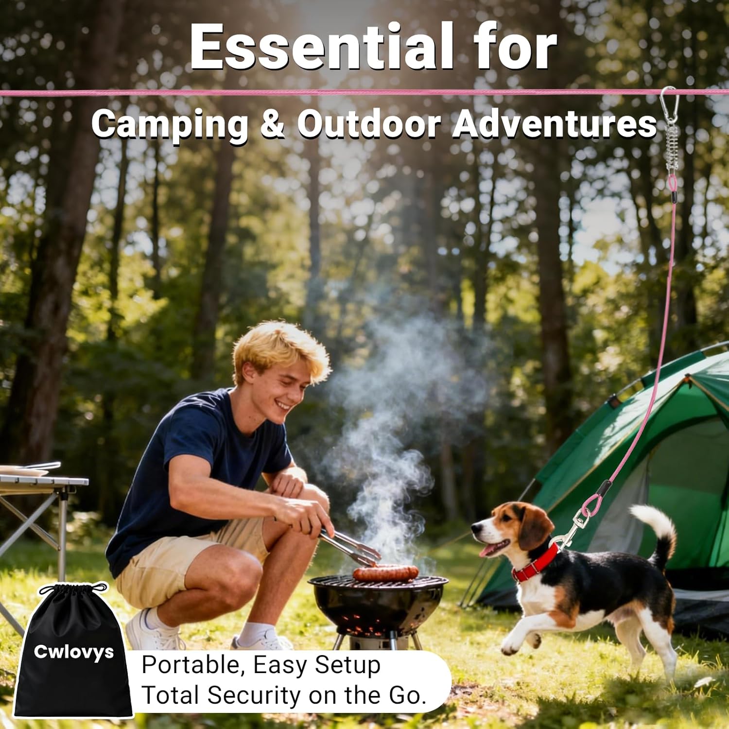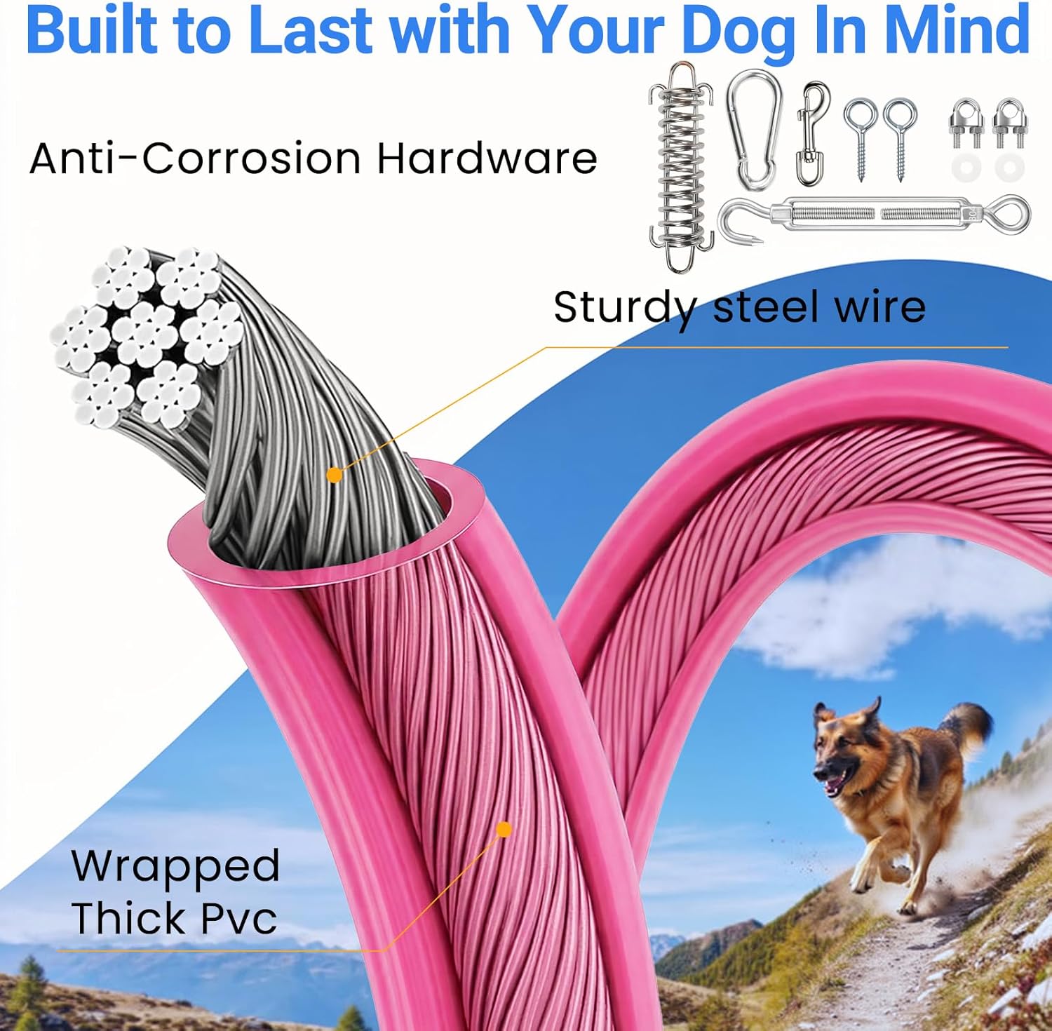 Heavy-Duty Dog Runner for Large Dogs Give your strong large dog (up to 80 lbs) the freedom to roam safely in your yard. This robust dog runner system features a main cable in 50FT to 200FT lengths and a 15FT dog tie out cable, both made of corrosion-proof, vinyl-coated steel to resist weather and years of energetic use. Tangle-Free & Shock-Absorbing Safety System Prioritize your dog's safety and comfort. Our dog runner cable features a 360° swivel that prevents dangerous tangles as your pet plays. The integrated shock-absorbing spring on the 15FT lead cushions sudden pulls directly at the collar, protecting your dog's neck from strain. This makes it the safest dog outdoor leash cable for worry-free fun in the yard or at the campsite. The Ultimate Dog Camping Essentials for Outdoor Trips Never leave your furry friend behind! This portable dog runner is a must-have dog camping essential. The complete set is easy to pack and set up anywhere, providing a secure, flexible boundary for your dog during hiking, camping, or a day at the park. It’s the perfect dog outdoor leash solution to ensure their safety while enjoying the great outdoors together. Secure Backyard & Outdoor Containment Solution Achieve complete peace of mind with our rigorously tested dog run. This secure dog tie out cable for dogs creates a reliable, designated play area, effectively containing even the most energetic large dogs. It’s the trusted solution for backyard fun, multi-pet households, and outdoor adventures, preventing escapes and giving you back your freedom. Effortless 15-Minute Setup with Storage Bag Get your dog trolley system up and running in under 15 minutes! Everything you need for a quick installation is included, with clear, straightforward instructions. The included durable storage bag makes transport and organization a breeze, ensuring your dog runner for yard and camping trips is always ready to go, right out of the box. › See more product details
