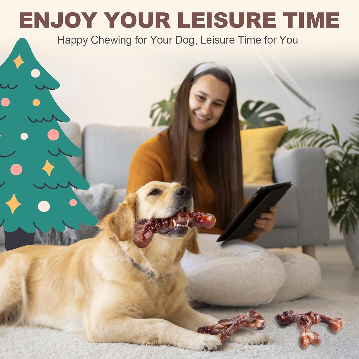 Built for Long-Lasting Play: Made from tough, high-quality nylon, these chew toys stand up to aggressive chewers won't break apart easily. Whether your dog is relaxing on the couch after a morning walk, gnawing happily in the backyard, or enjoying a quiet moment in the living room, these bones let them chew freely. You can feel confident leaving them to enjoy themselves, knowing the toy will hold up, keeping playtime safe, satisfying, and stress-free. Ideal Size for Medium & Large Dogs: Designed for dogs weighing 25–80 lbs, these bones fit comfortably in their mouths for a satisfying chew every time. From a playful Golden Retriever lounging by your feet to an energetic Boxer pacing the yard, your dog can grip and gnaw naturally. The size ensures a rewarding chewing experience that matches their strength, giving you moments to relax, watch them, and smile as they enjoy a appropriate toy. Unique Bone Shapes: Each bone has distinct shapes and contours that make chewing engaging and varied. Dogs experience gentle gnawing on rounded edges and firmer bites on ridged parts, keeping their curiosity alive. Whether it’s indoor chew time during a quiet afternoon or an outdoor session in the backyard, these shapes turn ordinary play into mini-adventures. Every chew becomes stimulating, satisfying, and just different enough to hold their attention. Textures That Care: Carefully designed ridges and grooves help your dog chew naturally while providing mild tartar control. Each bite is satisfying, giving your dog comfort while you appreciate their calm focus. Whether they’re chewing on the living room rug or enjoying a quiet afternoon by the window, these textures provide subtle dental benefits without exaggeration, helping to make routine chew time feel productive and enjoyable for both of you. Treat-Filled Fun: Grooves are perfect for peanut butter, yogurt, or soft treats, turning simple chewing into interactive enrichment. Your dog will focus on licking the treat, enjoying a rewarding challenge while you sip your coffee, work on your laptop, or read nearby. This feature keeps them occupied longer, makes chew time more engaging, and adds small but meaningful mental stimulation—without needing any extra toys or gadgets. Irresistible Bacon Flavor: Lightly infused with a savory bacon scent, these toys instantly attract dogs’ attention. From the first sniff, tails start wagging as they explore every contour. This mild flavor enhances chewing interest without being overwhelming or artificial. Perfect for indoor or backyard play, it motivates your dog to interact with the toy while you enjoy watching them engage happily, creating small, joyful moments. More Value, More Joy: With three bones in one pack, your dog can enjoy variety and extended chewing sessions. Different shapes and textures prevent boredom, whether it’s a quiet afternoon indoors or active backyard play. You’ll see them switch between toys, exploring each one with curiosity. This combination keeps playtime fresh, giving you more shared enjoyment and creating routine moments that feel fun, simple, and real. Easy to Clean Anytime: Cleanup is effortless—rinse by hand or pop in the dishwasher. Toys are ready for the next chewing session without extra effort, keeping your home tidy. Whether the grooves have peanut butter remnants or backyard dirt, this feature makes maintenance simple and stress-free. You can focus on enjoying playtime with your dog instead of worrying about mess, keeping the home and the toys ready for everyday use. A Gift Wrapped in Love: This set is a thoughtful way to show care for your dog. Imagine their excitement as they receive three chew toys, sniffing, exploring, and enjoying each one. Perfect for birthdays, holidays, or simple surprises, this pack delivers small but meaningful moments of joy. You’ll see tails wag and eyes light up—an authentic way to connect and show affection through play. Joyful Moments for Both of You: While your dog chews happily, you can relax with a book, coffee, or quiet conversation. These toys foster calm, shared experiences without over-promising results. Everyday routines—from morning quiet time to evening wind-downs—become opportunities to bond, making simple moments feel joyful and mutually satisfying for both you and your dog. Show more › See more product details