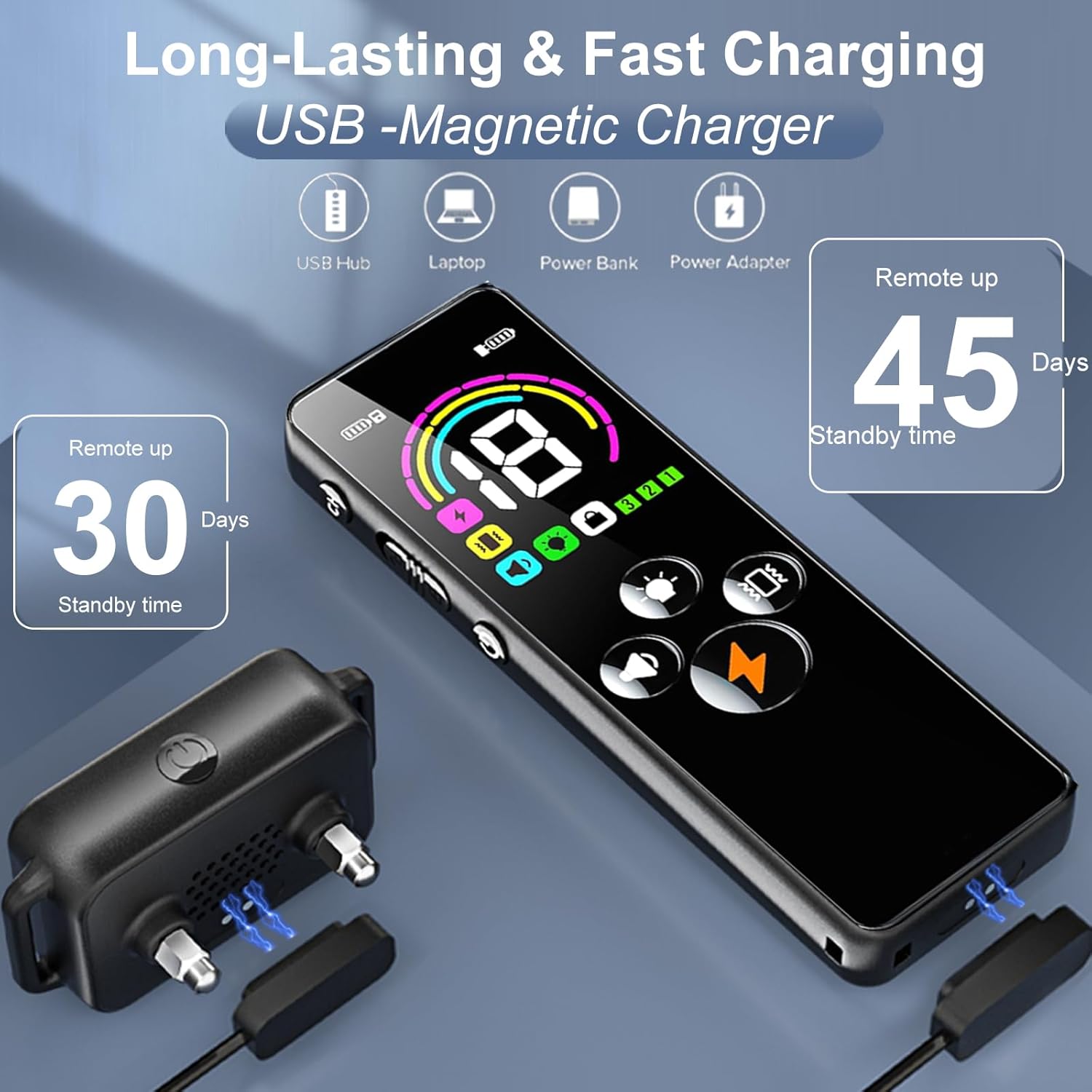 About this item Simple And Safety Training:electronic collar is very popular among trained dog trainers and pet owners. Its training system will help you control and train dogs within an effective range through a series of functions, including 4 modes: vibration alarm, beep warning, shock punishment, dog finder, etc. It can remotely stop bad behaviors such as barking, walking around, biting, and fighting. This will be your great training assistant. 4 flexible adjustable modes:The dog training collar is equipped with beeps, vibrations (levels 1-8), shork (levels 1-18) and dog finder, which, when combined with training, can make it easy for dogs to develop good behavior. Professional IP67 Waterproof:The collar adopts professional IP67 waterproof, which can easily cope with various outdoor scenes such as rainy days, shallow water environments, and humid grasslands. (Tip: The remote control is not waterproof, so please stay away from water when using it) Suitable for All Dog Sizes:The adjustable collar fits dogs of different sizes (weighing 10 to 120lbs), suitable for large, medium and small dogs. It is easy and quick to wear and remove. The collar strap is up to 62cm/25 inches long, suitable for dogs with neck sizes of 9 - 23 inches. Humanized Design: The dog training collar has an extremely long remote control range, allowing you to train your pet from a distance in backyards, parks, and other places. The standby time of the collar can reach 30 days, and the battery life of the remote control can reach 30 days. The layout of the remote control buttons is reasonable, the operation is simple, and it is easy for beginners to get started. Equipped with a silicone protective case, wearing it continuously for several days will not cause harm to the dog's neck. › See more product details